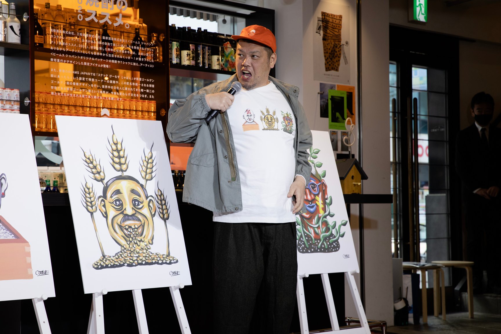 2年目となる今年は、野性爆弾のくっきーが描き下ろした米、麦、芋のそれぞれのアートを「白岳KAORU」「いいちこ」「白波」のパッケージデザインに採用。くっきーのイラストを落とし込んだロングスリーブTシャツ(5500)や、新宿ゴールデン街の旧看板をプリントしたロングスリーブTシャツ(5000)、柴切重行が「白岳KAORU」「いいちこ」「白波」の3種の産地をイメージして描いたイラストによるロングスリーブTシャツ(5500)、刺繍キャップ(4500)、トートバッグ(1500)を製作した。今日からビームス ジャパンの店舗をはじめ、焼酎3種の産地の熊本、大分、鹿児島のビームス店舗などで取り扱っている。ビームス ジャパン新宿店の発表会に登場したくっきーは米のイラストについて「神様にお供えする由緒正しい食べ物。日本を代表するものなので心を込めて作りました」とコメントし、金色の麦はピラミッドと吉村作治を、芋は土の神をイメージして描いたという。