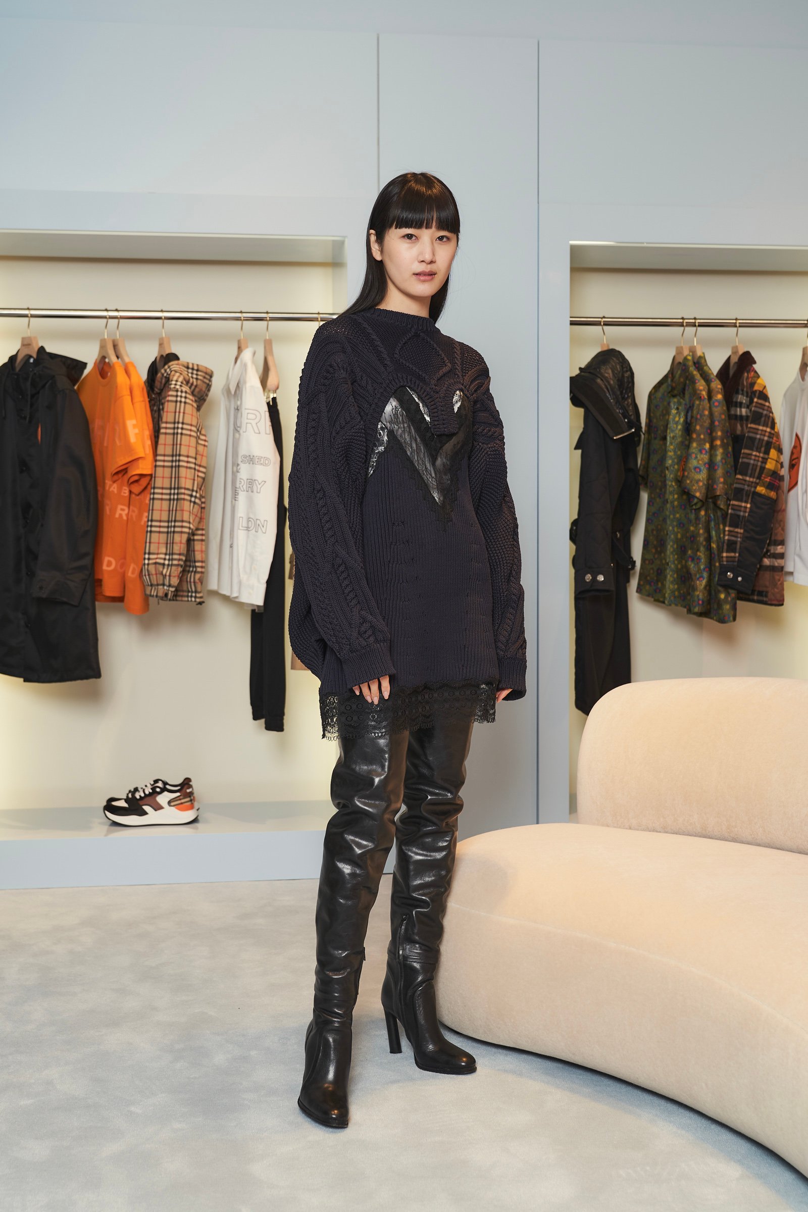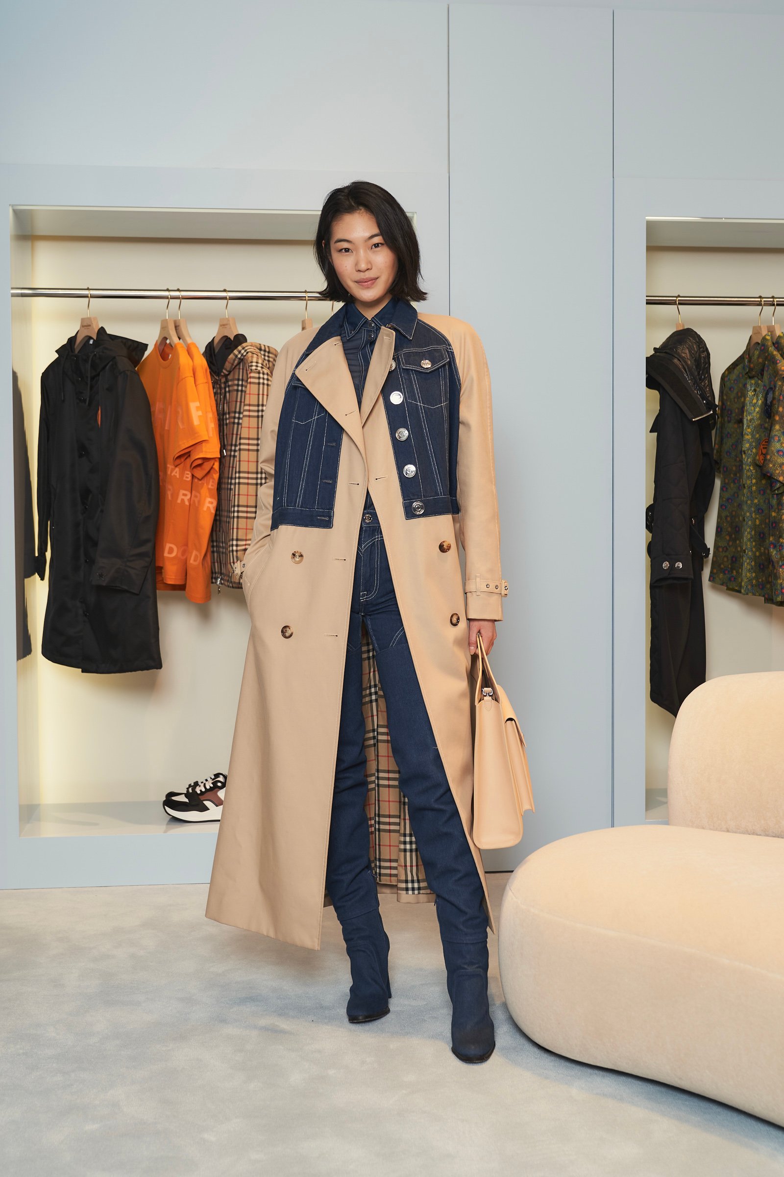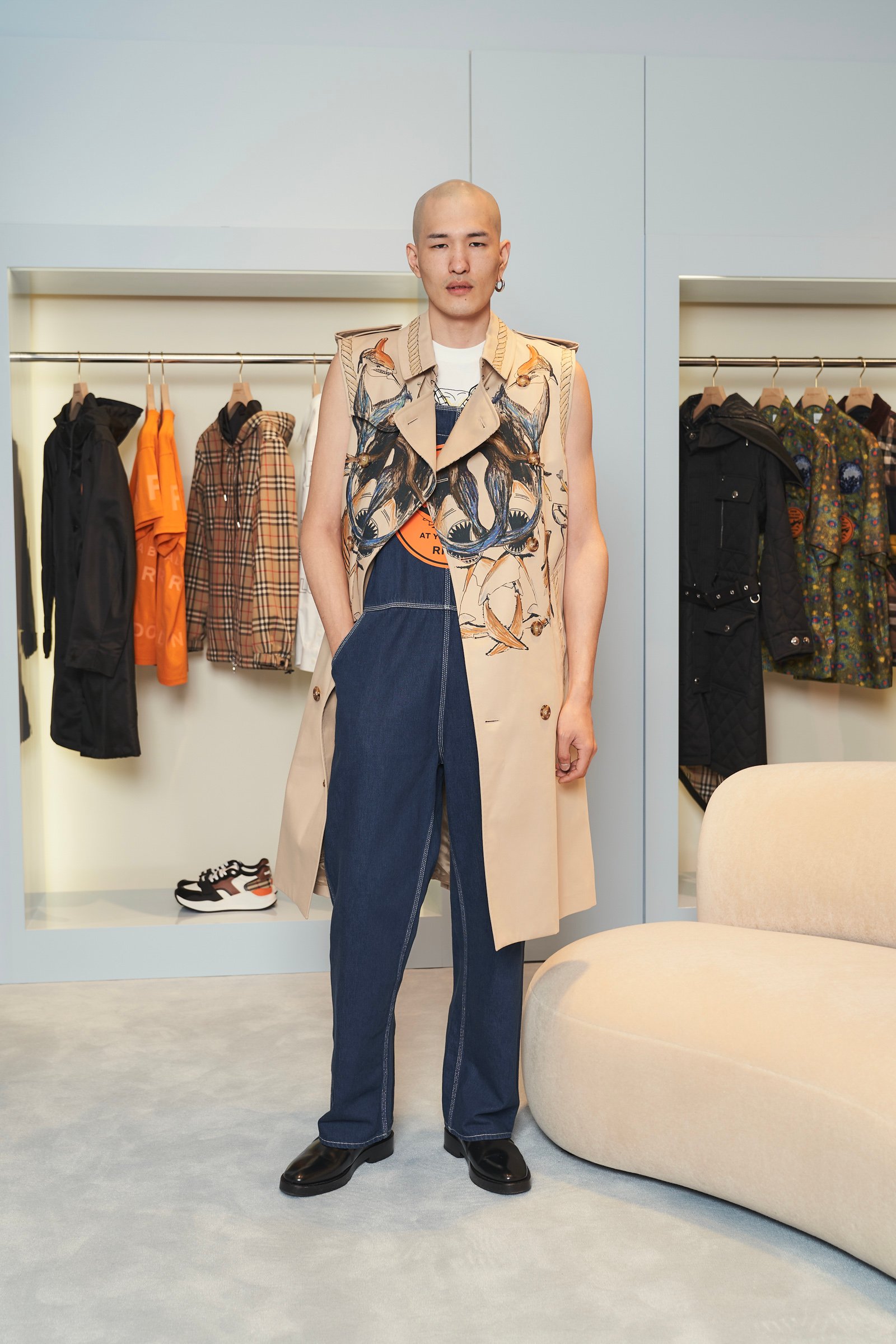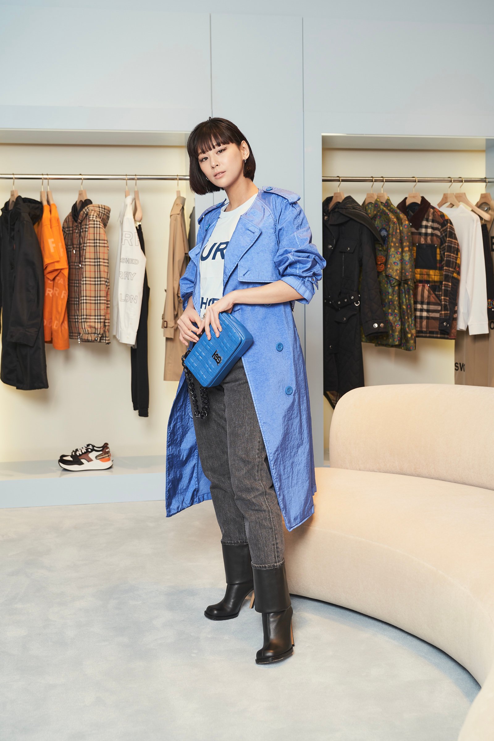 新店舗の売場面積は約202平方メートルで、ウィメンズとメンズ、チルドレンズ、アクセサリーが一望できるワンフロア構成となっている。チーフクリエイティブオフィサーのリカルド・ティッシ(Riccardo Tisci)による店舗コンセプトを採用しており、バーバリーベージュを落とし込んだスペースと、フロアから壁まで淡いベイビーブルーで統一したスペースを展開することで異なる世界観を共存させたという。