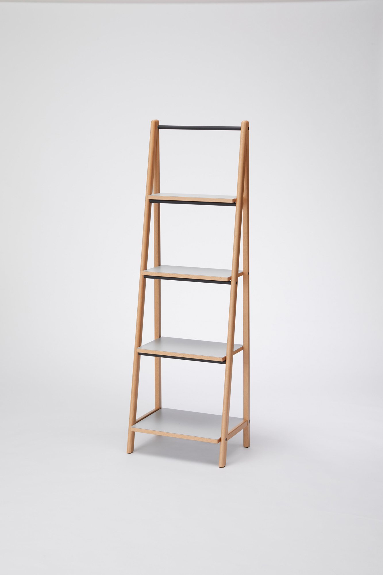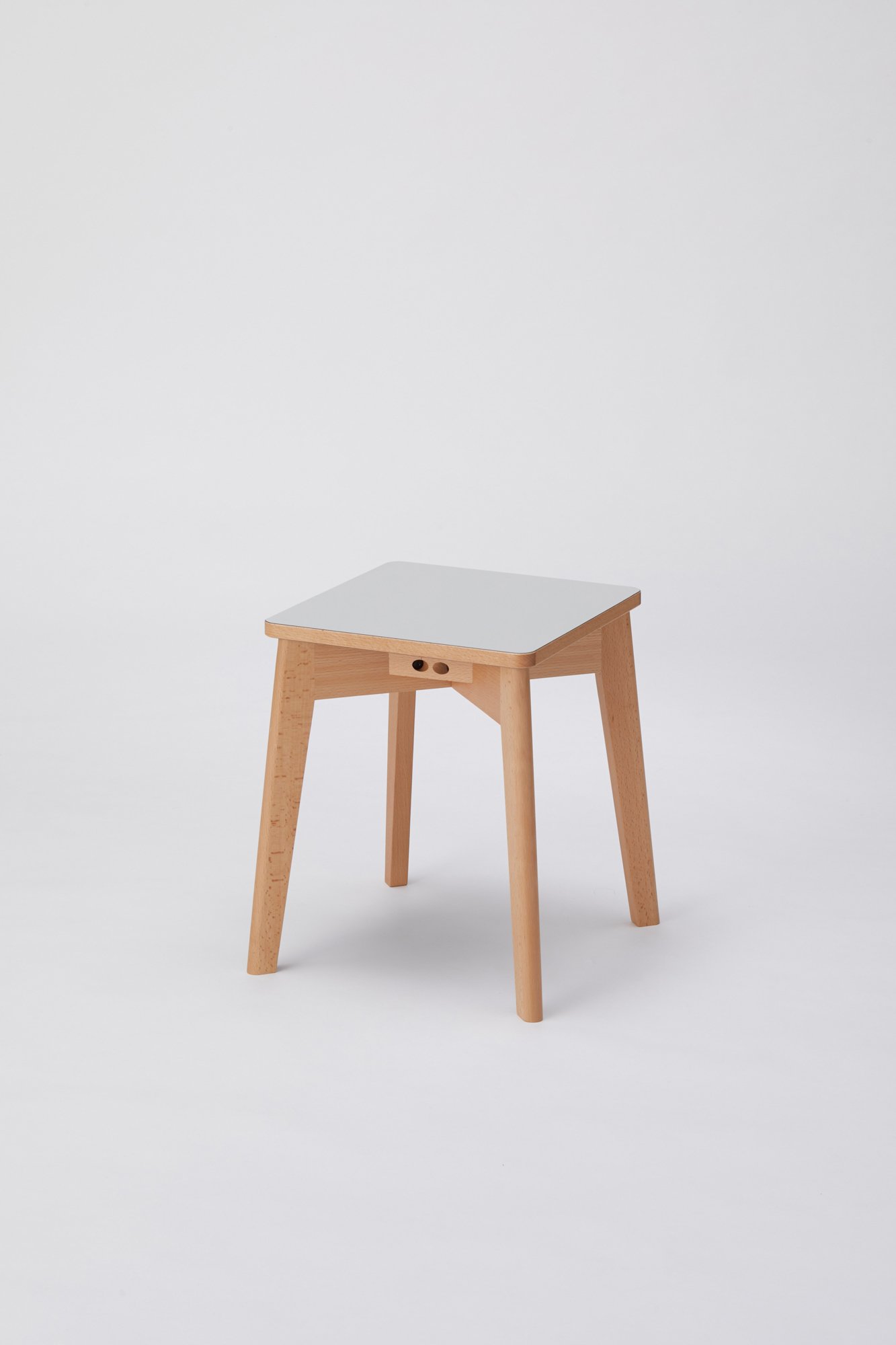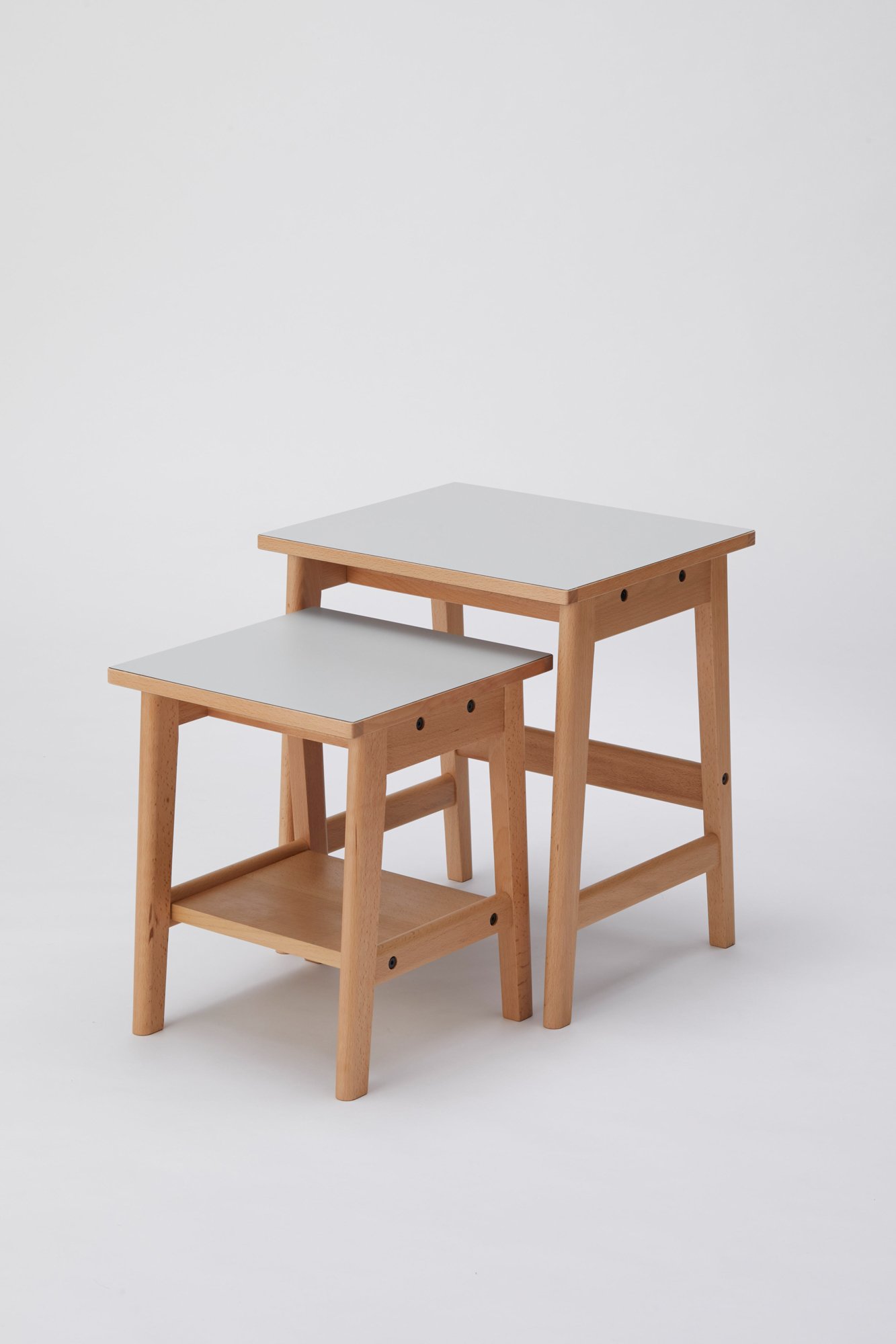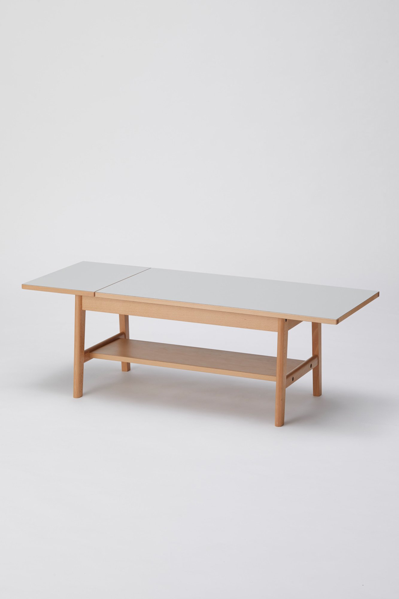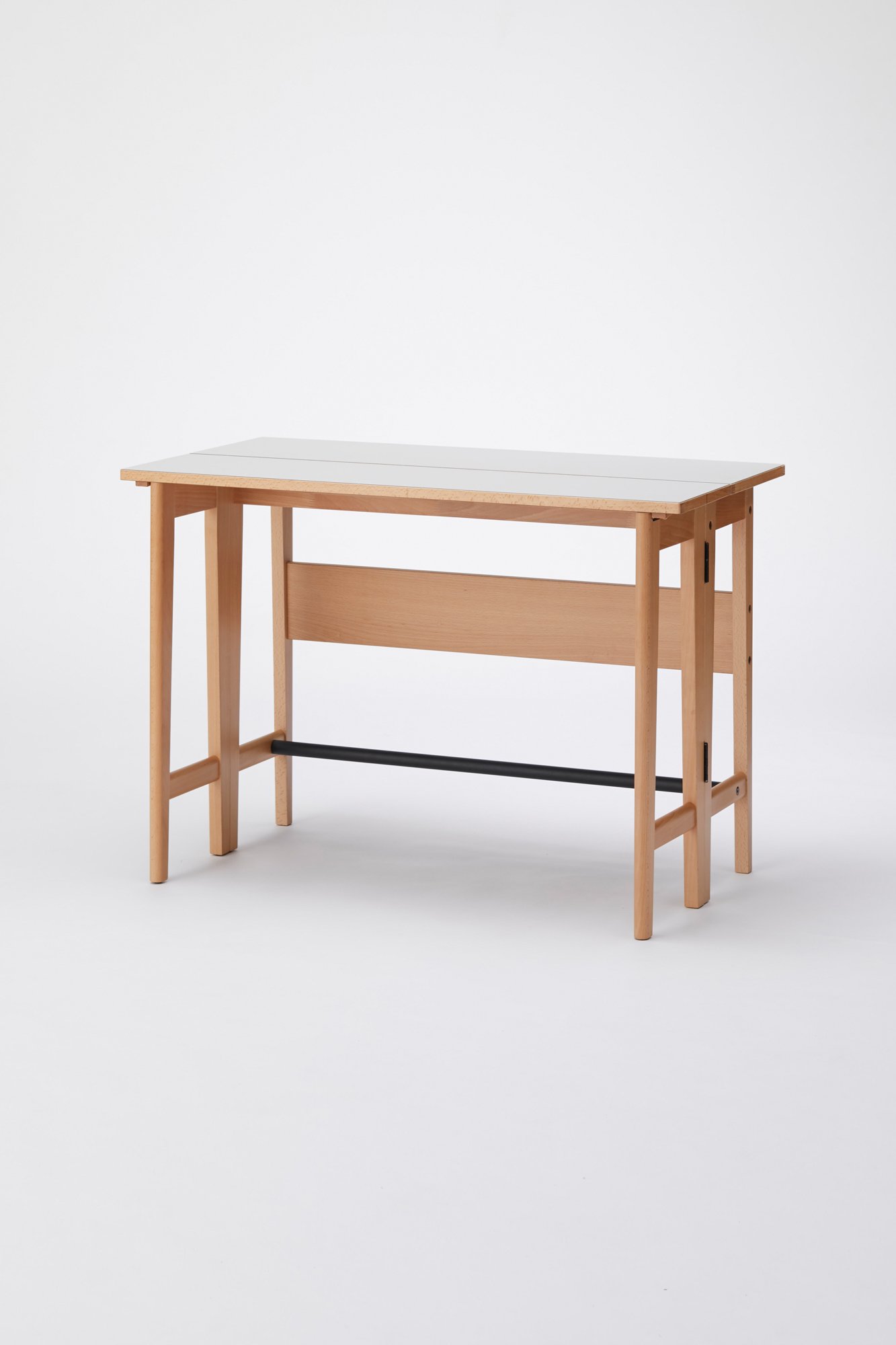 アイテムは、「たためる」「ひろがる」「かさなる」といった暮らしに役立つ機能を備えた5型をラインナップ。広げるとワークデスクになるコンソールデスク(2万4900)や、⼤⼩2つが重なるネストテーブル(1万9900)、サイドテーブルとして使用できるスタッキングスツール(6990)、2ステップで天板幅を調整できるセンターテーブル(1万9900)、可動式の棚板を動かすことでポールハンガーになるラダーシェルフ(1万9900)を展開する。いずれのアイテムも使用していないときのデザイン性を意識したほか、木部にビーチ無垢材を採用したことで経年変化が楽しめる仕様に仕上げた。