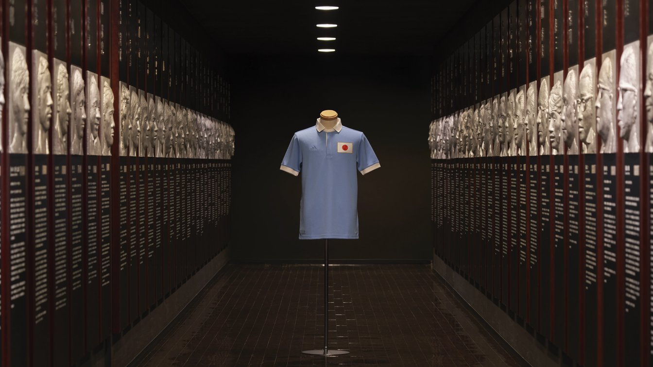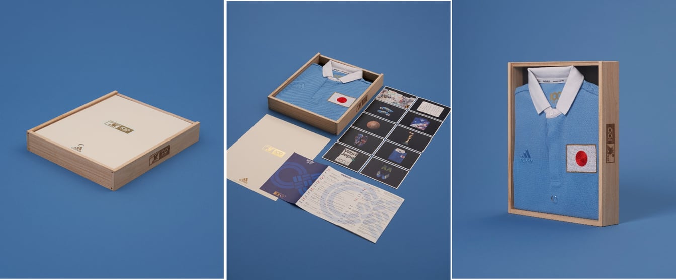 アニバーサリーユニフォームは、初めて全国からの選抜メンバーで日本代表チームを編成した1930年と、ベルリンで開催されたオリンピックで初めてベスト8に勝ち進んだ1936年の2つのユニフォームからインスピレーションを受けてデザイン。1930年代のユニフォームで使用していたブルーをイメージした「ライトブルー」をメインカラーに採用し、胸元には1936年のユニフォーム同様にビックサイズの日本国旗を刺繍した。素材は、海に流入する前に回収したプラスチック廃棄物をアップサイクルした「Parley Ocean Plastic」の糸によるパフォーマンスファブリック「PRIMEBLUE」を使用。襟裏には日本古来の「二重叶結び」をモチーフに、日本サッカーのさらなる発展への願いを込めた「100」のロゴを配した。