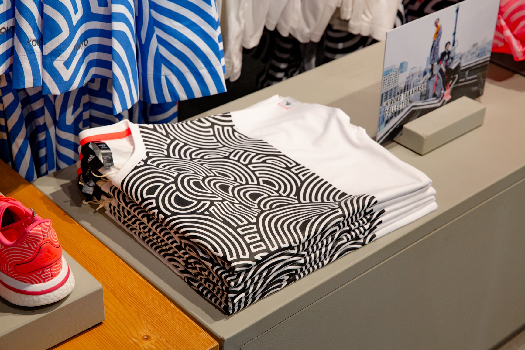 「HIROKO TAKAHASHI COLLECTION」は、アディダスが持つ素材と技術に、高橋のデザインを融合して製作された。が波紋のように無限に広がっていくグラフィックは全て同じではなく、デザインに合わせて変えているという。「は、性別や国籍、世代を問わない、ミニマムで普遍的なモチーフ。人の縁や繋がりにも置き換えられます。アディダスはグローバルブランドなので、多くの人に受け入れられるように、皆の気持ちが一つになるように、という気持ちで作りました」。