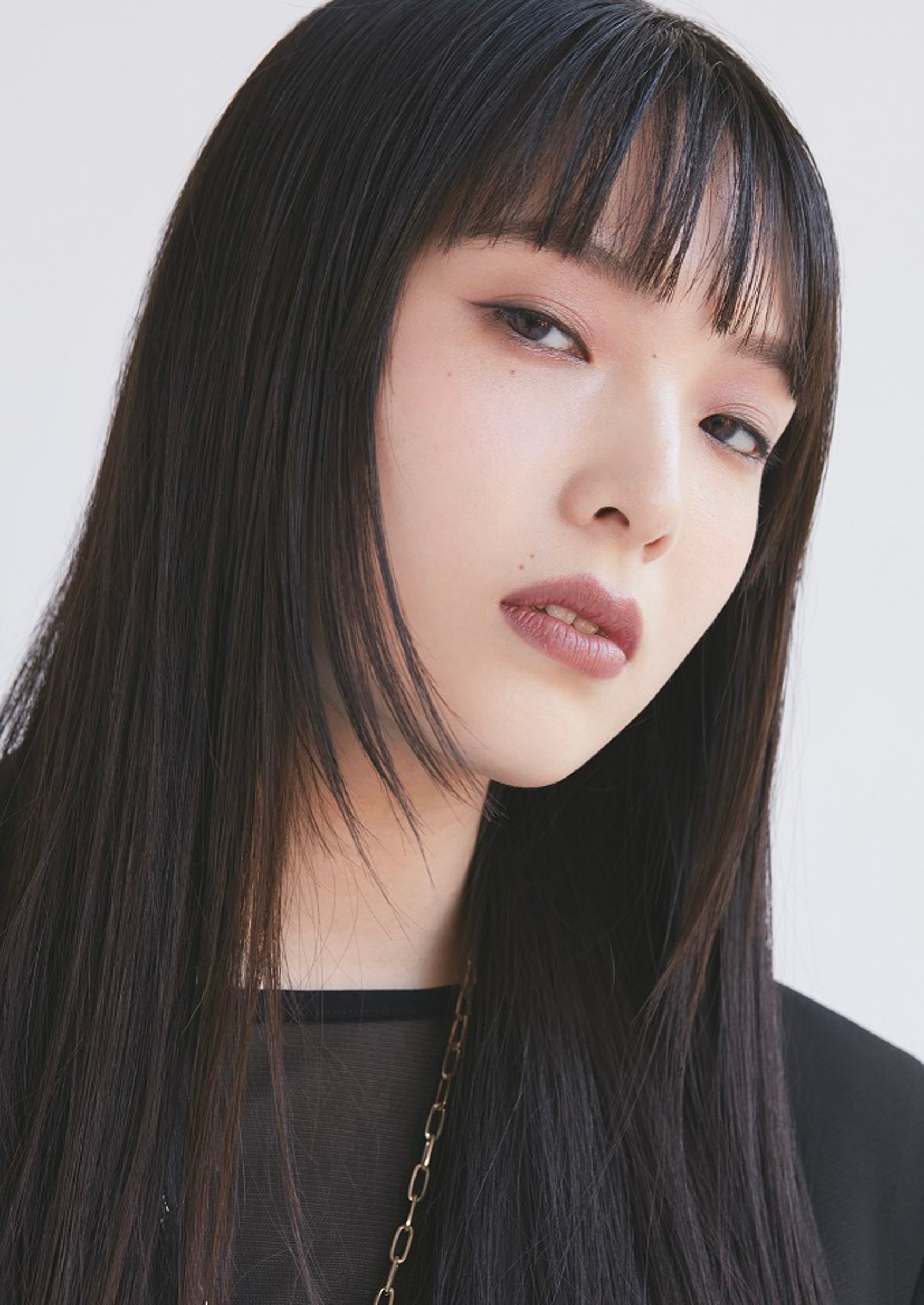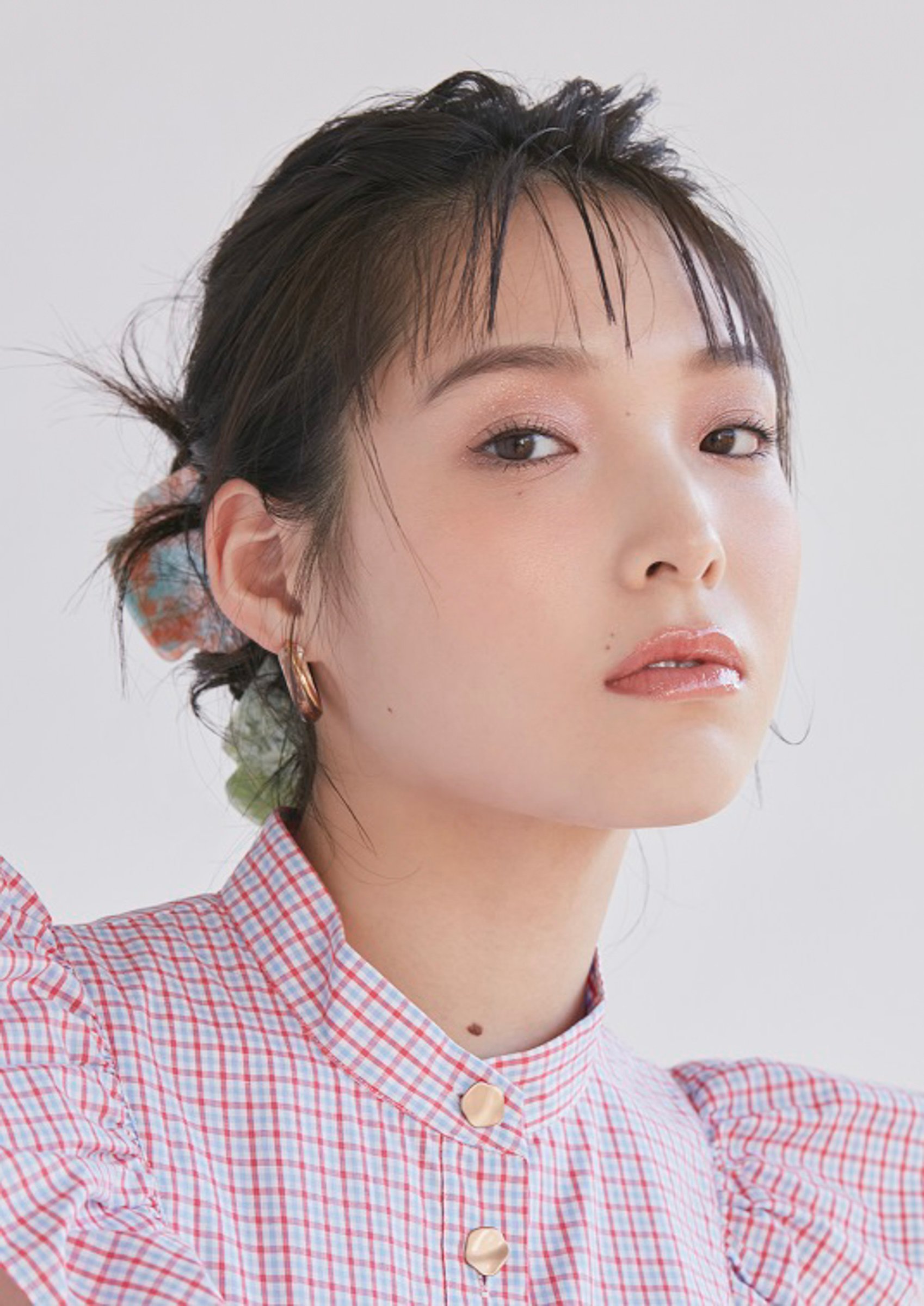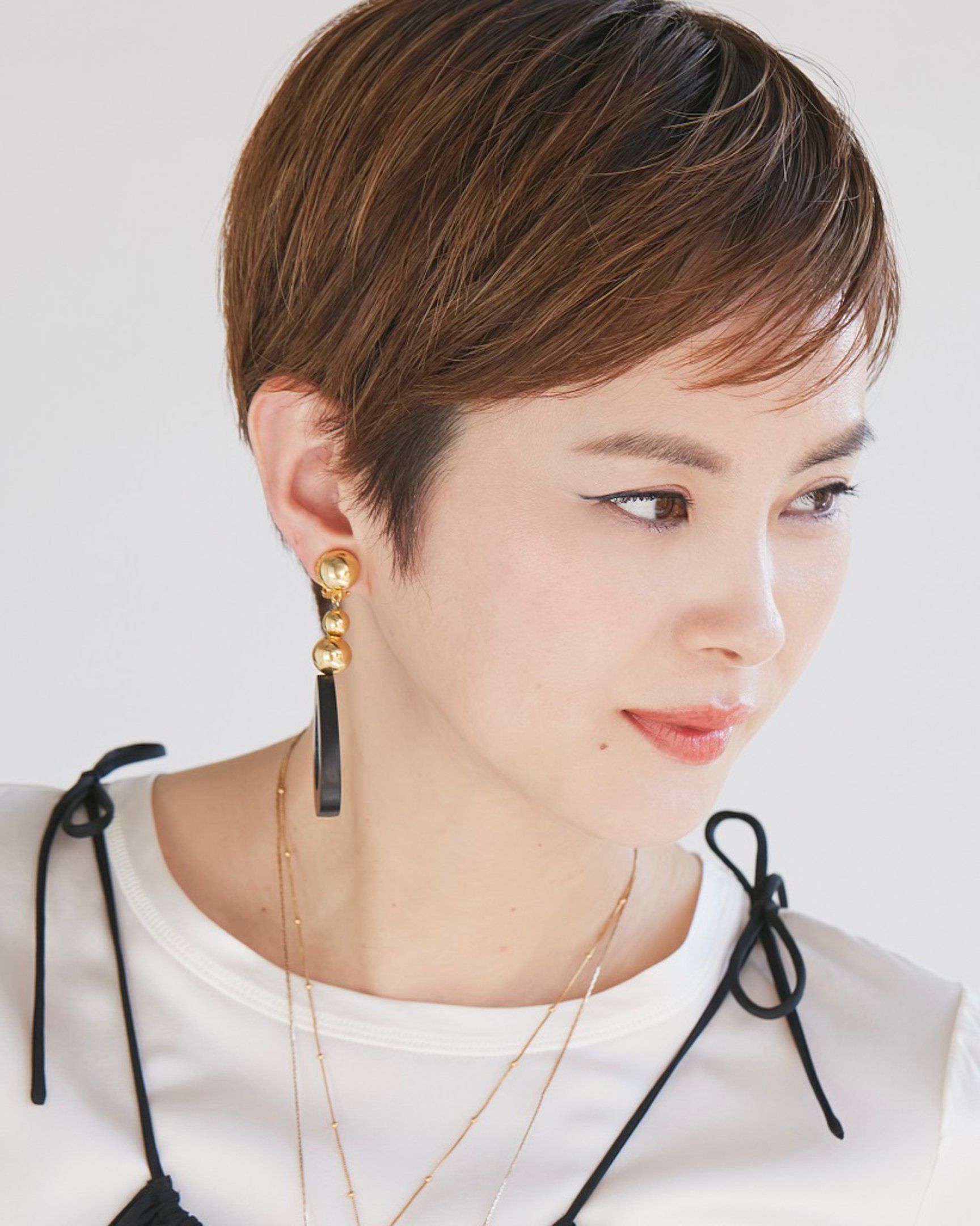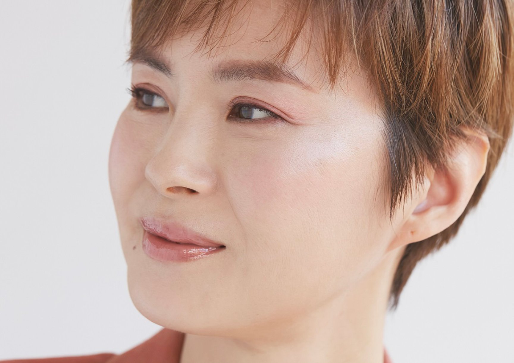 パターン4は、色や質感をレイヤードしてTPOに合わせた自分好みの仕上がりに注目。下地でツヤを仕込み、テカりやすいTゾーンにフェイスパウダーを塗布して、クリームタイプのチークと、チークの輪郭にかぶせたハイライトでふっくらしながら自然な血色感を演出する。アイメイクはローズ系のシャドウをグラデーションし、ブラウンのアイライナーで軽やかな印象。マスクをするときなどに応じてリップグロスの量を調整して、自分好みのスタイルを提案する。ヘアはボーイッシュなショートカットで、眉上バングにコンパクトに抑えたウェットな質感に仕上げた。