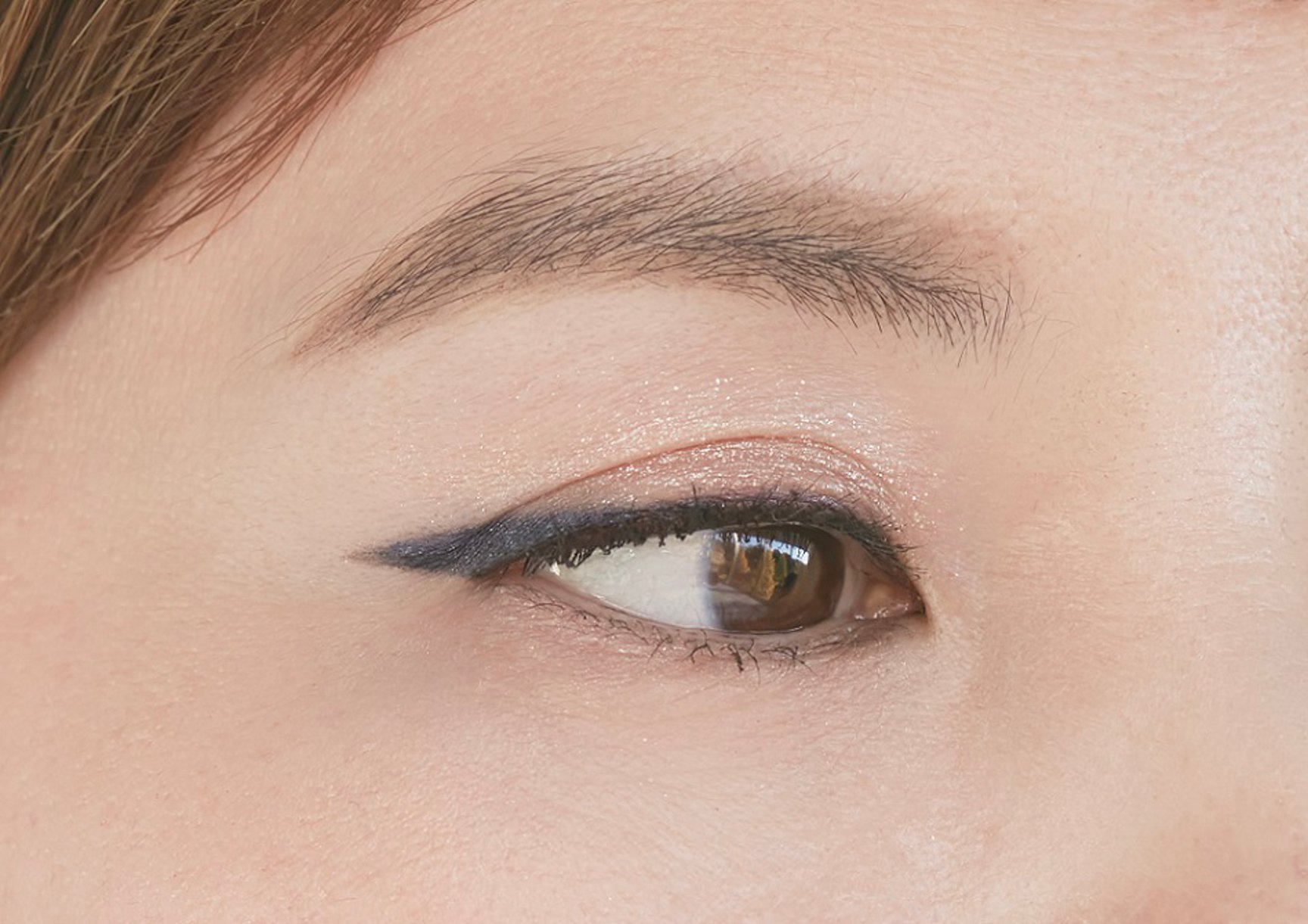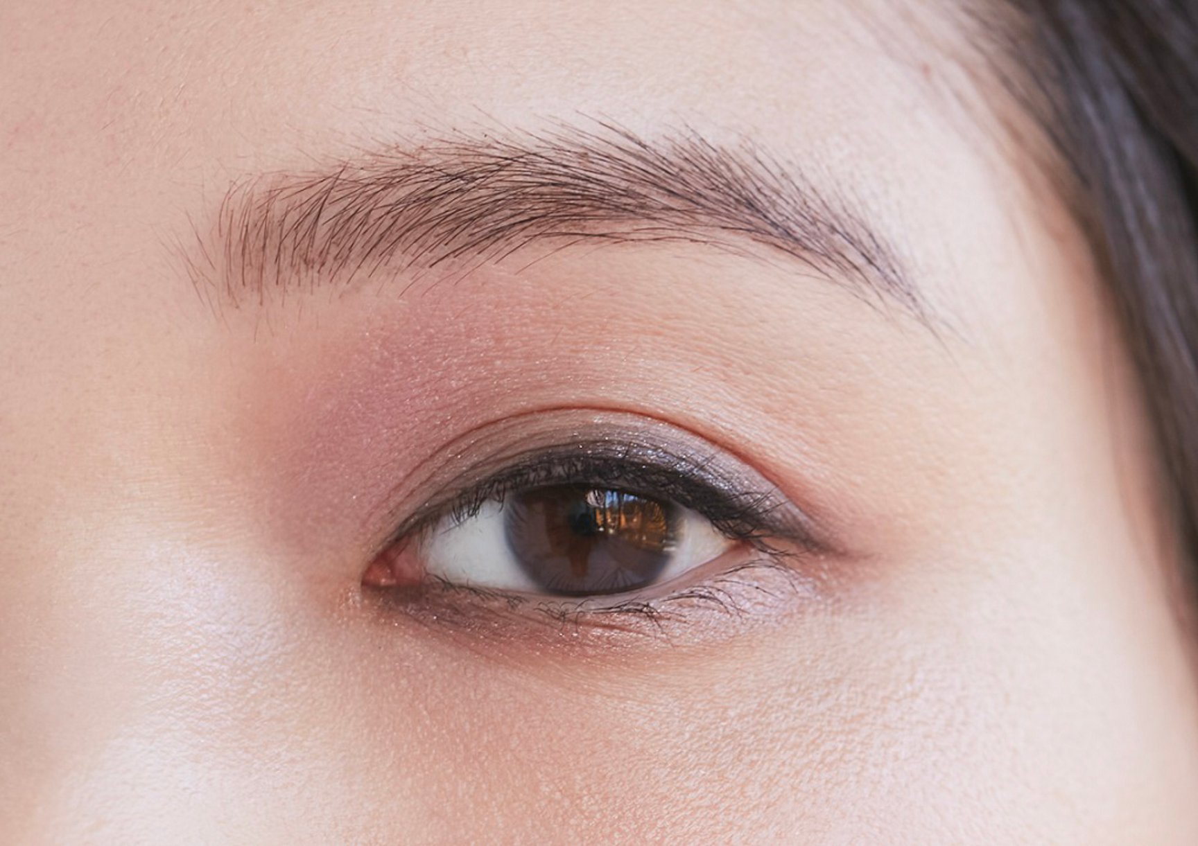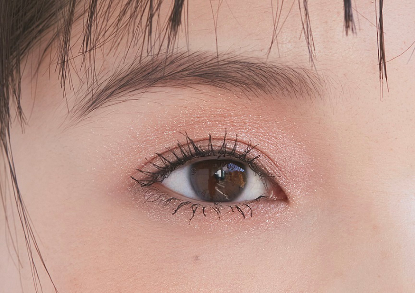 パターン3では、瞬きのたびに輝くまぶたに、太めに効かせたアイラインが印象的なメイクアップ。しっかりと塗ったマスカラと、指で塗布したラメがインパクトのある目元に仕上げる。ベースは薄く仕上げてツヤ感のあるフェイスパウダーでセットし、レッド系のチークで血色感をプラスする。リップは指でラフに塗り広げ、大胆なフレッシュカラーにチャレンジ。
