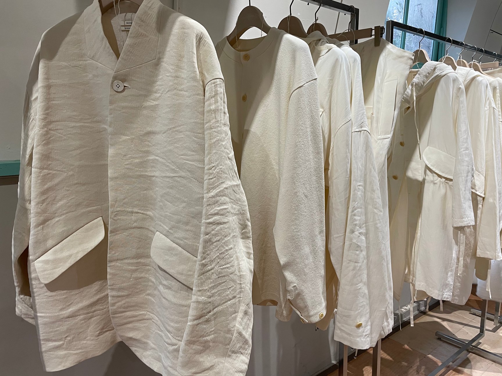 山縣はリトゥンアフターワーズとリトゥン バイの棲み分けについて「リトゥンアフターワーズはこれまで通り、表現することに特化した実験的なもの作りに振り切って活動していきたいが、ファッションカレンダーに沿わない時期にコレクションを発表することもあり、卸先に迷惑をかけることもあった。リトゥン バイでは定期的にコレクションを発表し、生地や既存の流通システムを再考することを目的としたもの作りをしていければ」と説明。自社ECや、ポップアップストアなどを通して直接顧客とコミュニケーションを取れる仕組みを模索していくという。販売から流通までを自社で完結することで小売店が仕入れる際の取引価格でアイテムを販売することが可能となり、レンジは2400から7万2000と以前よりも価格を抑えた。2月1日から2月8日までの一週間、公式オンラインストアでオンライン受注会が開催される。