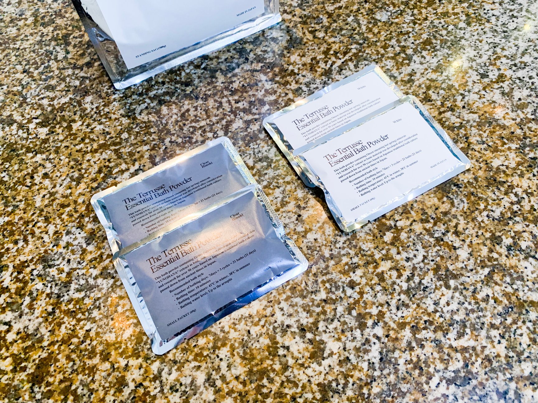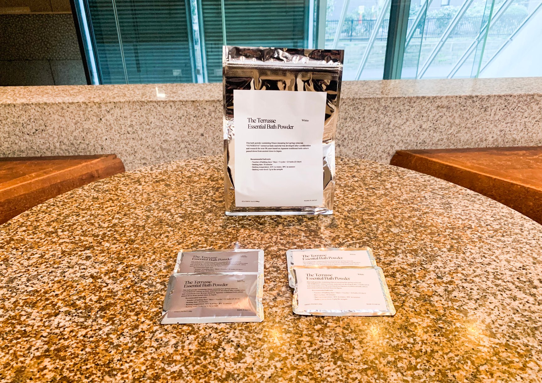 入浴剤は、大分県別府市の別府八湯と呼ばれる温泉エリアをひとつ「明礬温泉」の湯の花を基材に採用。硫黄の臭いを取り除いており、心地良い浴後感を体感できる。明礬温泉の湯の花は、江戸時代から約350年続く製造製法を行う藁葺き屋根の小屋の中に、近隣の特殊な地質が生み出す青粘土と呼ばれる土を敷き詰め、地熱によってできる温泉ガスが地中から青粘土を通っていく過程で、青粘土の成分と温泉ガスの成分が結晶化することで出来上がる。職人の手によって湯の花は1日約1ミリ成長していくという。