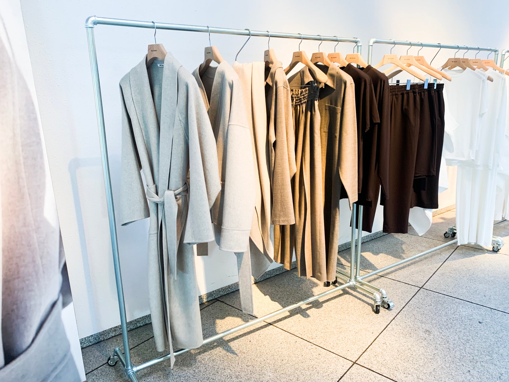 ブランドの立ち上げは、以前より親交があるという和歌山の老舗テキスタイルメーカー エイガールズ(A-GIRL'S)の山下雅生会長との会話がきっかけとなった。「会長とお話した際に、コロナ禍で家にいる時間が増える中、デザイナーとして何が出来るかを考える機会があった。ポステレガントではどちらかというと外に出ていくための服を作っているが、より暮らしの豊かさが感じられるものを作っていきたいという考えるようになった」と話す。デビューコレクションはルームウェア約20型のほか、タオル、温泉成分配合の入浴剤などを展開。"素材好き"として知られる中田氏は1年の間に膨大な量の素材に触れ、数千におよぶ素材の中から厳選したものだけを選んで服作りを行っており、ザ・テラスにおいても使用する素材にこだわり抜きプロダクトを完成させた。