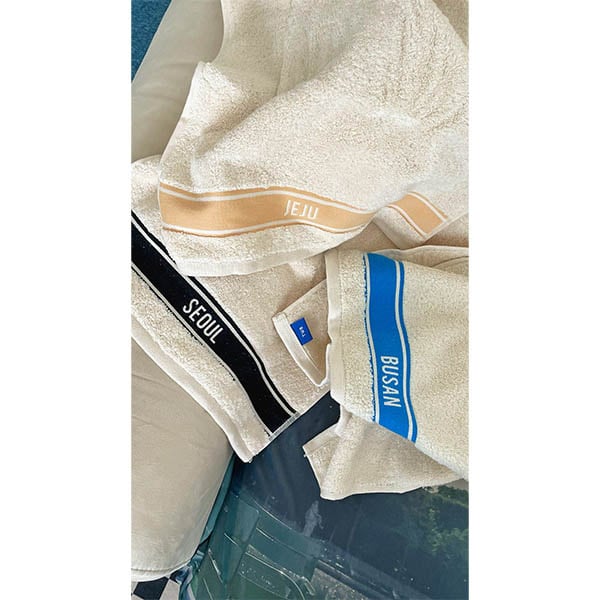韓国のタオルは日本のものとは違う製法で作られているため、少し厚みや重厚感のある質感を楽しめるのだとか。ソウル/釜山/済州の3種類よりランダムで届きますよ。