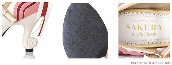 さらに、クラシカルで愛らしい猫脚ヒールはグロス加工でつややかに、同商品のために起こした魔法陣と桜のアウトソールはカードキャプターさくらの世界観を余すことなく表現。