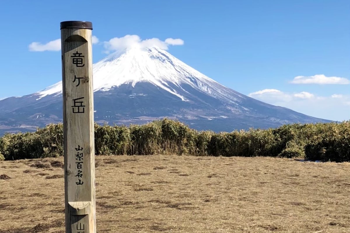 「竜ヶ岳は1485メートルと比較的低山で眺望が良いのでハイキングにおすすめの山。地元が山梨なので馴染み深く、今でも良く登っている好きな山です。ふもとにはキャンプ場があるので、荷物を置いて身軽な状態ですぐ登れるのも魅力ですね。道中も歩きやすく、高原を散歩しているように登れるので年間を通して、初心者でもトライしやすいかと思います。見晴らしの良い山頂から見事な富士山を見ることができ、12月初旬から1月の初旬の時期にはダイヤモンド富士も見られる人気のスポット。夏と冬、どちらの季節も素敵なのでぜひ両方登ってもらいたい山です。」