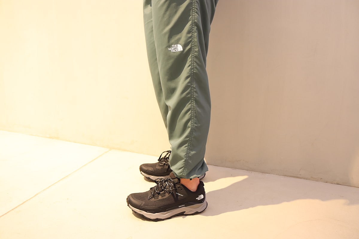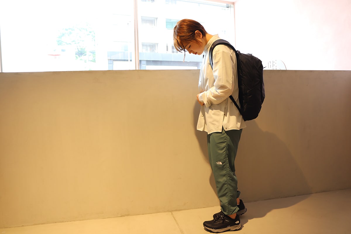 「肌触りの良い、薄手でなめらかなリサイクルナイロン生地の新作パンツ。高いUVカット機能と、静電気の発生を防止する設計が採用されています。パッカブル仕様なので、携行性も抜群。山小屋やキャンプ、冷え込んだときなど1枚あると便利。リラックスタイムも快適。シューズは安定性、推進力、グリップ力を追求した『VECTIV』ソールを搭載したシューズです。軽量&防水のフューチャーライト素材で歩きやすく、街履きからハイキングまで使えます。」