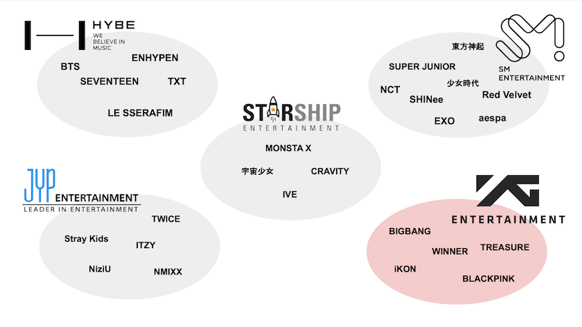 第4弾はYGエンターテインメント。第2弾で紹介したSMエンタテインメント、第3弾で紹介したJYPエンターテインメントとともに韓国三大芸能事務所と呼ばれる。強めのテイストと圧巻のパフォーマンスが特徴だ。主な所属グループは、BIGBANG、WINNER、iKON、BLACKPINK、TREASUREなど。