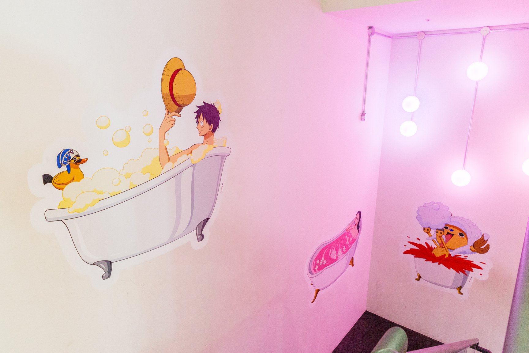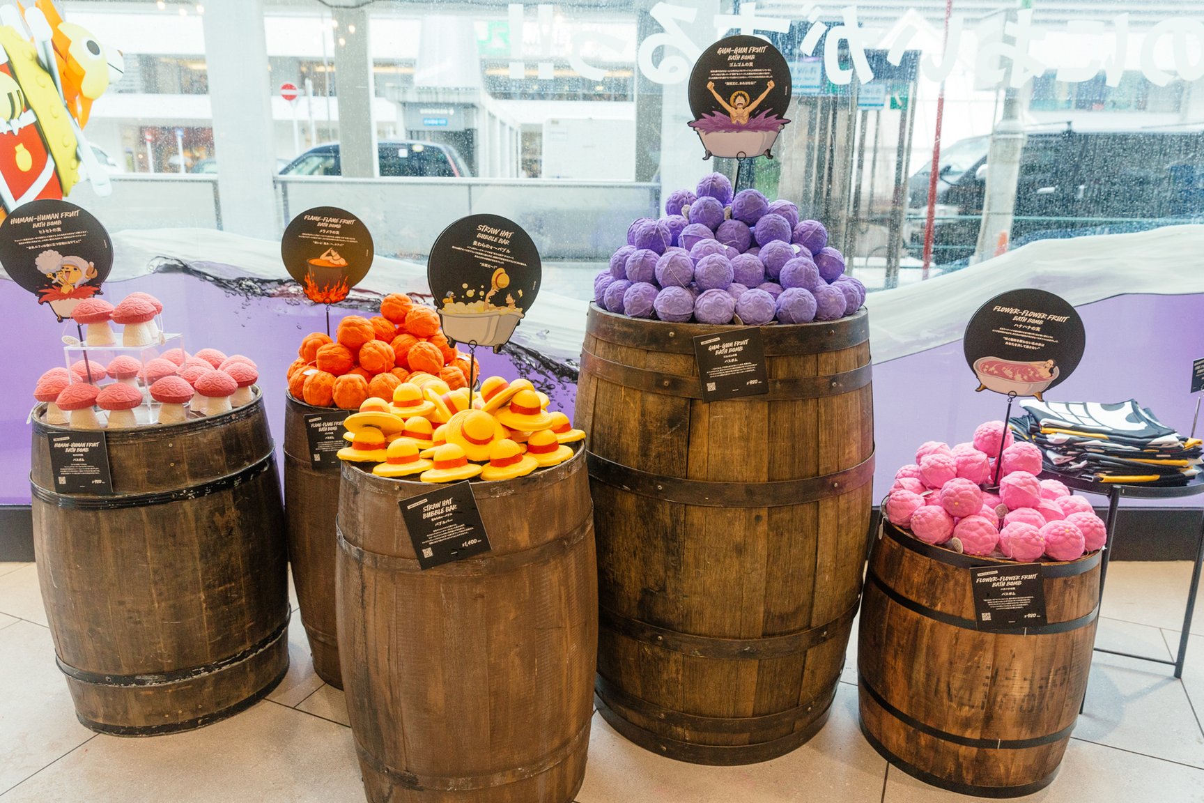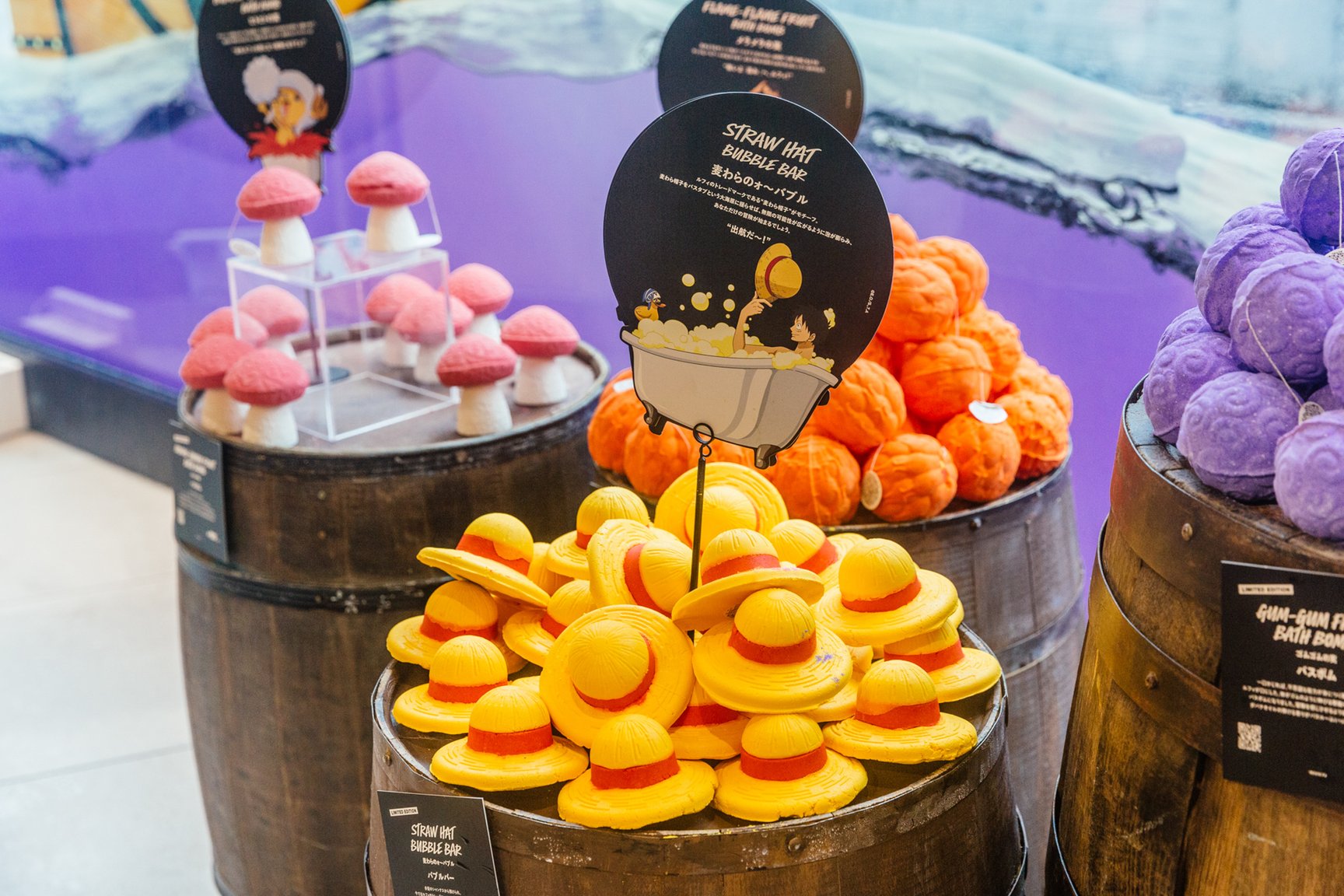 バスボムは作中に出てくる「悪魔の実」をモチーフに採用。ルフィの「ゴムゴムの実」をイメージしたものは、お湯の色が紫色からルフィのまとう黒いオーラ 「覇気」のような黒に変化する。「メラメラの実」を表現したオレンジ色のバスボムは、ポッピングキャンディが火花のようにパチパチと音を立て、エースの「火拳」を彷彿とさせる。このほか、「ハナハナの実」や「ヒトヒトの実」をイメージした商品が揃う。
