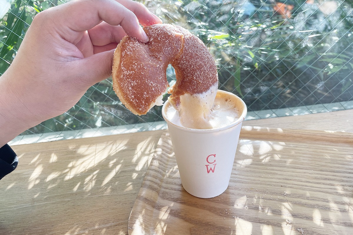 ぜひ、カプチーノのなめらかなフォームミルクにドーナツをつけて、豪快なアメリカンスタイルにもトライしてみてほしい。ドーナツにミルクフォームがしっとりとしみこんで、ほのかな甘みとほろ苦さがよりドーナツのおいしさを引き立ててくれる。
