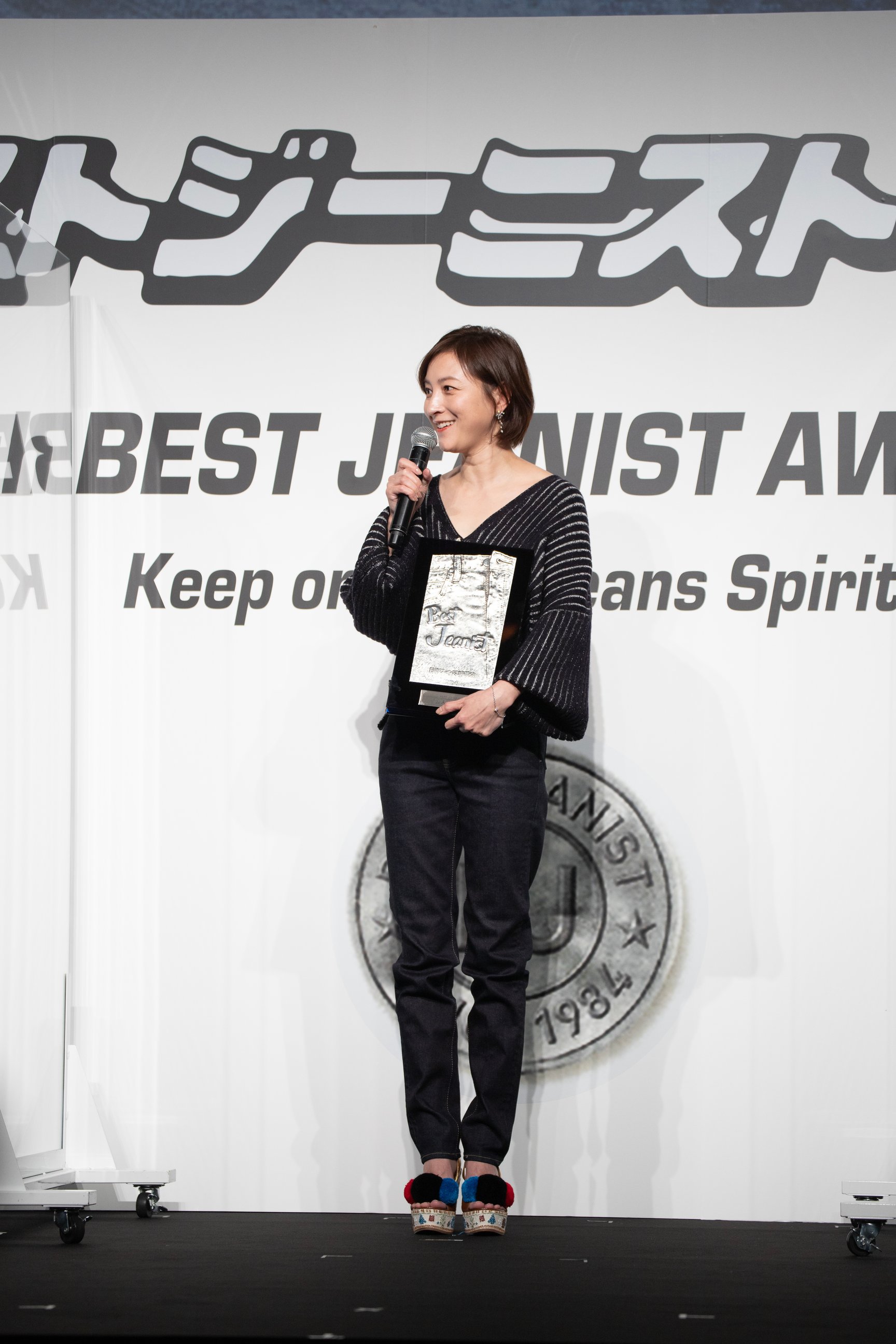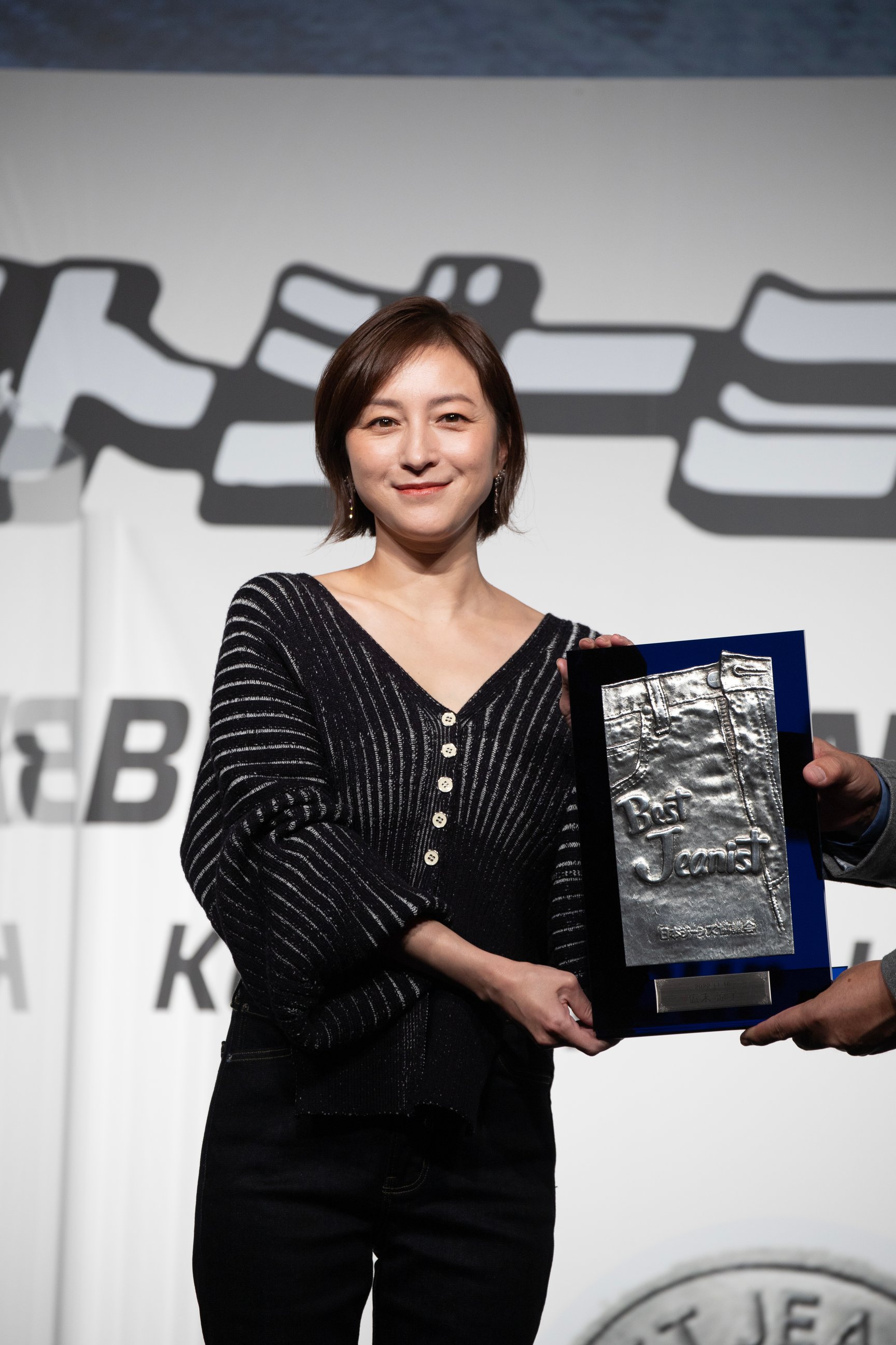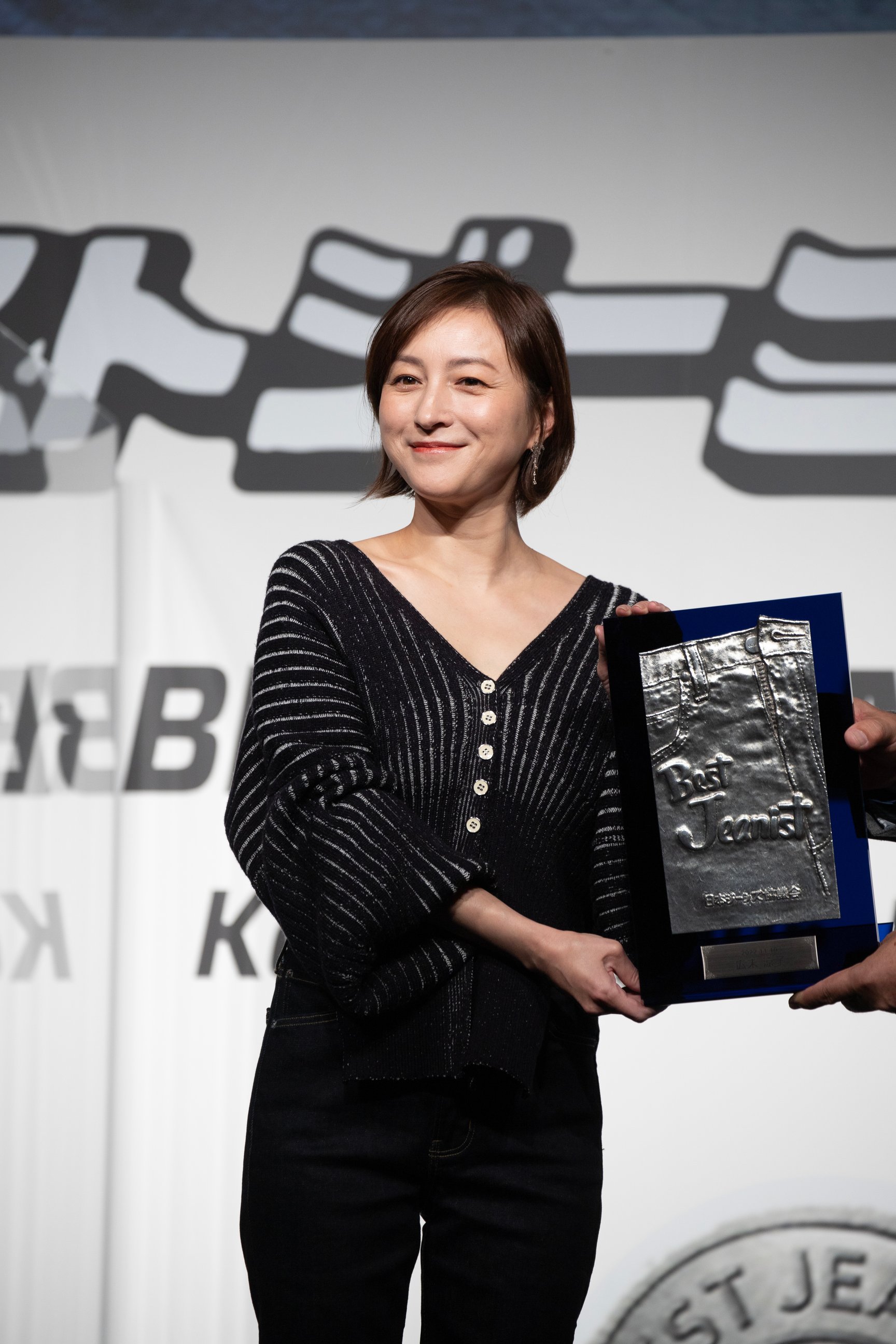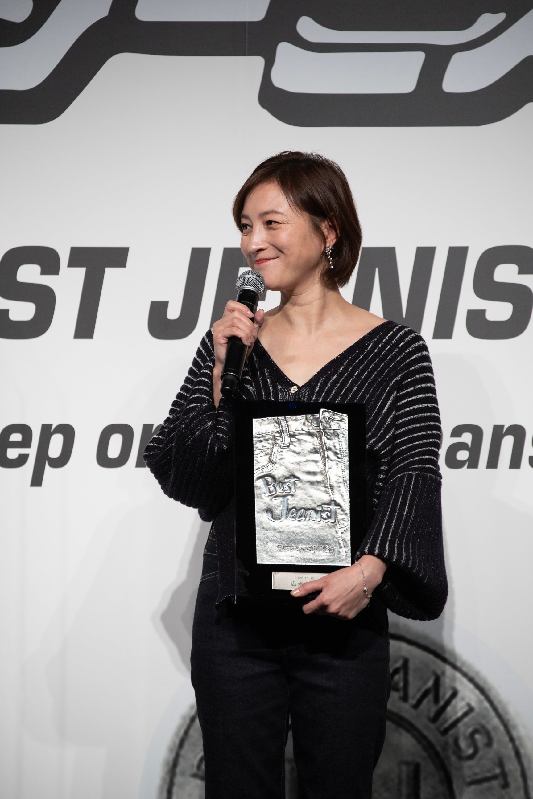 協議会選出部⾨を受賞した広末涼子は、黒いブラウスとデニムに身を包み登壇。受賞について「この賞を頂けると思っていなかったのでとても嬉しいです。今年はジーンズでお仕事をする機会が多かったので、見て頂けていた証拠だと思います」とコメントした。