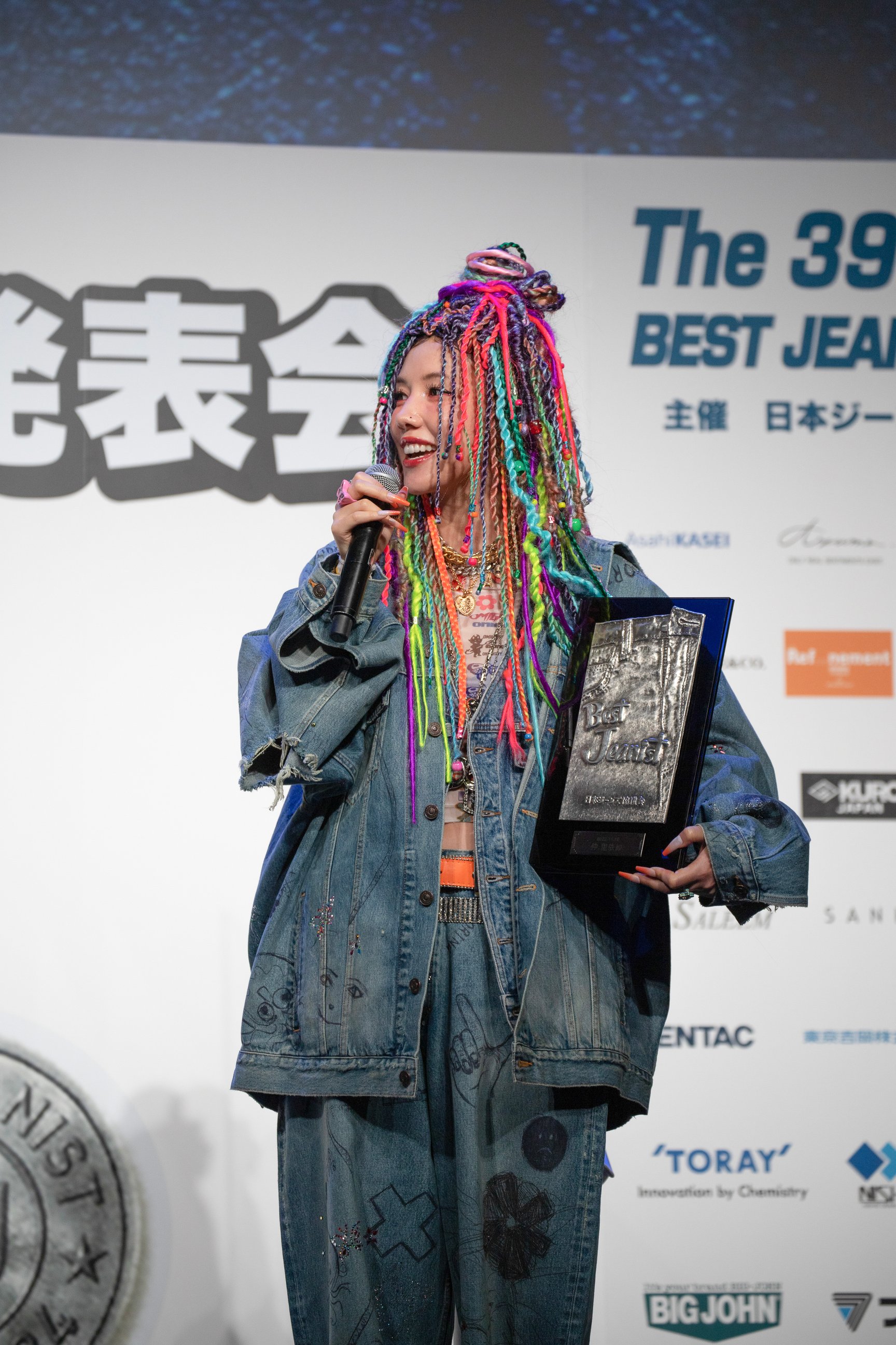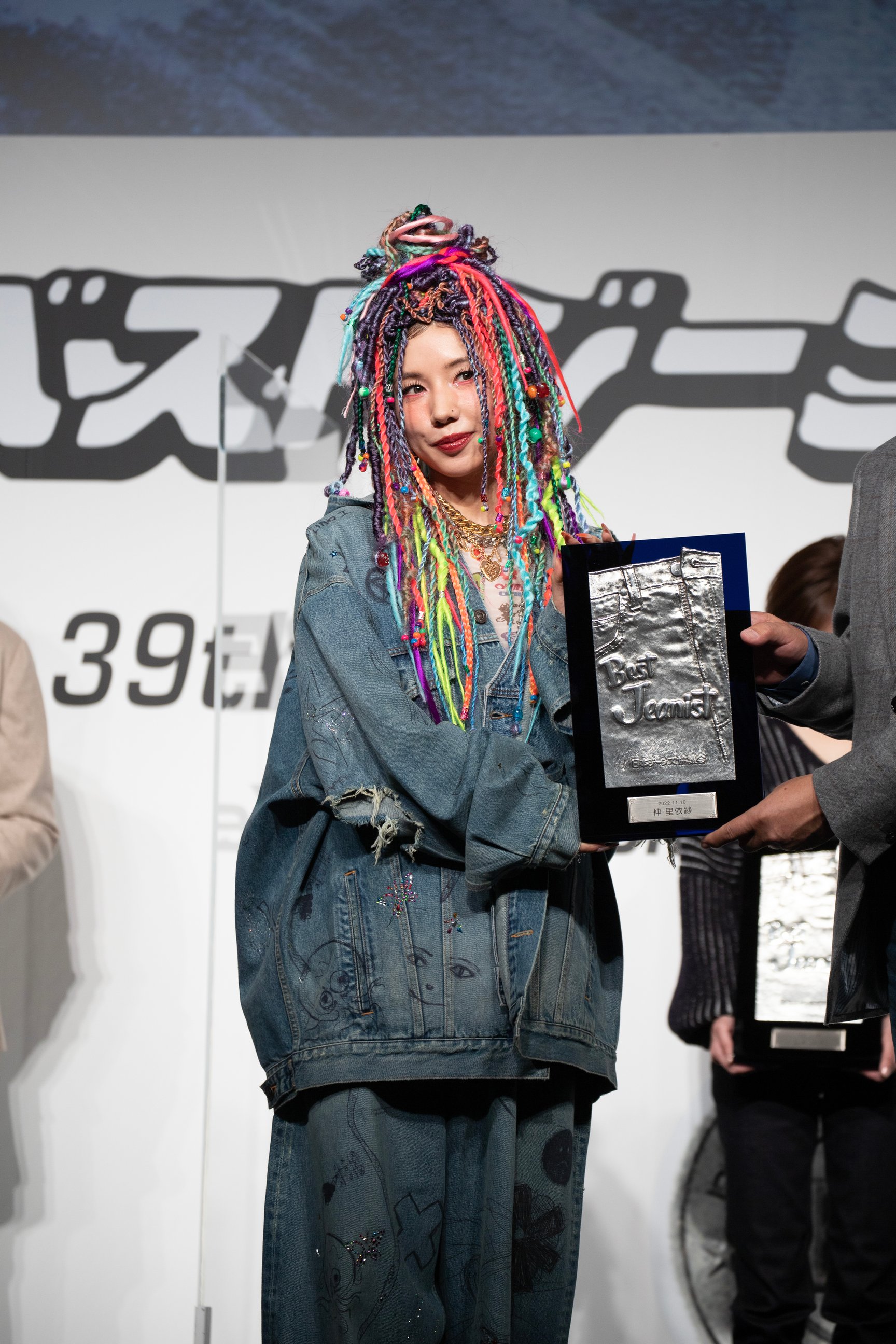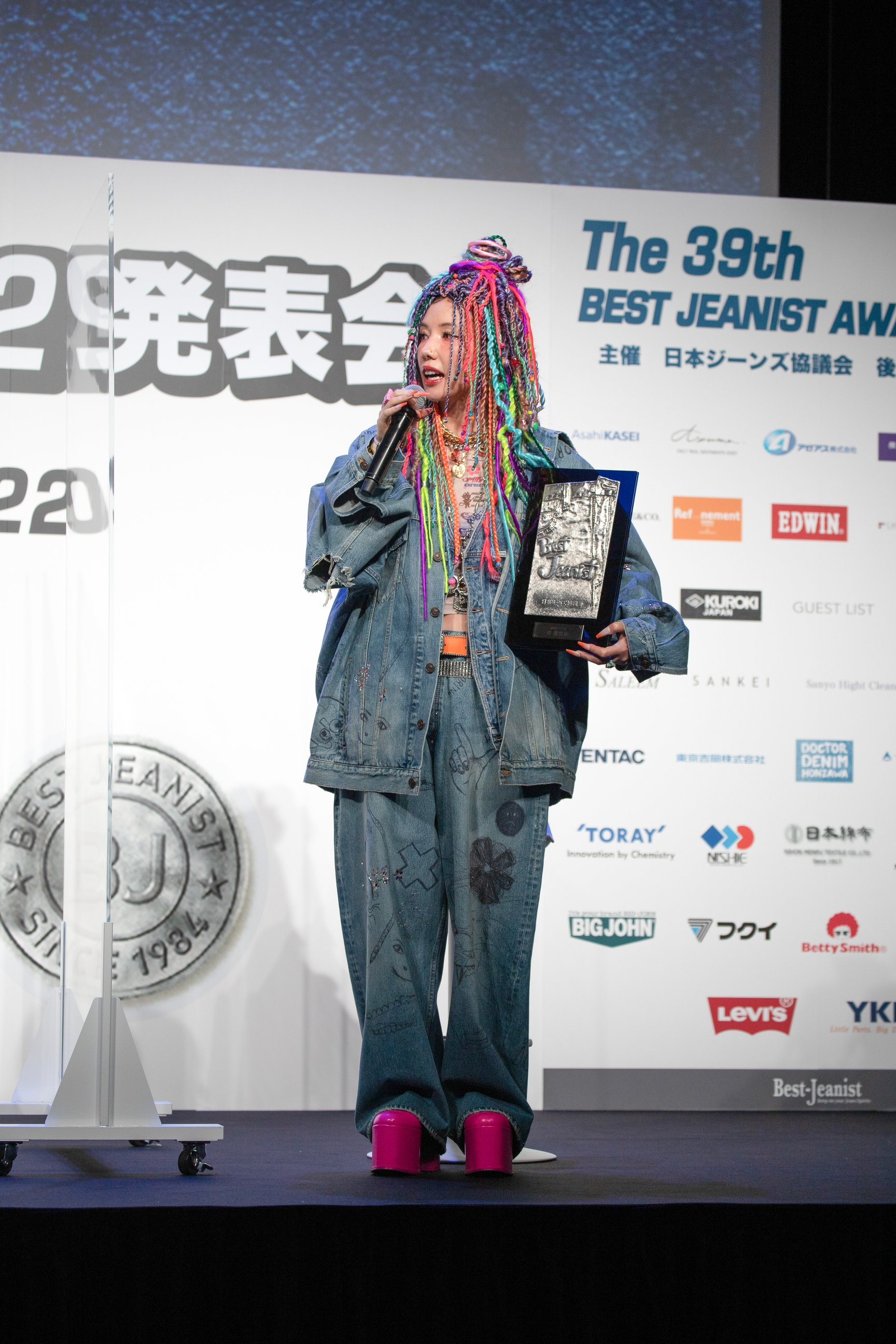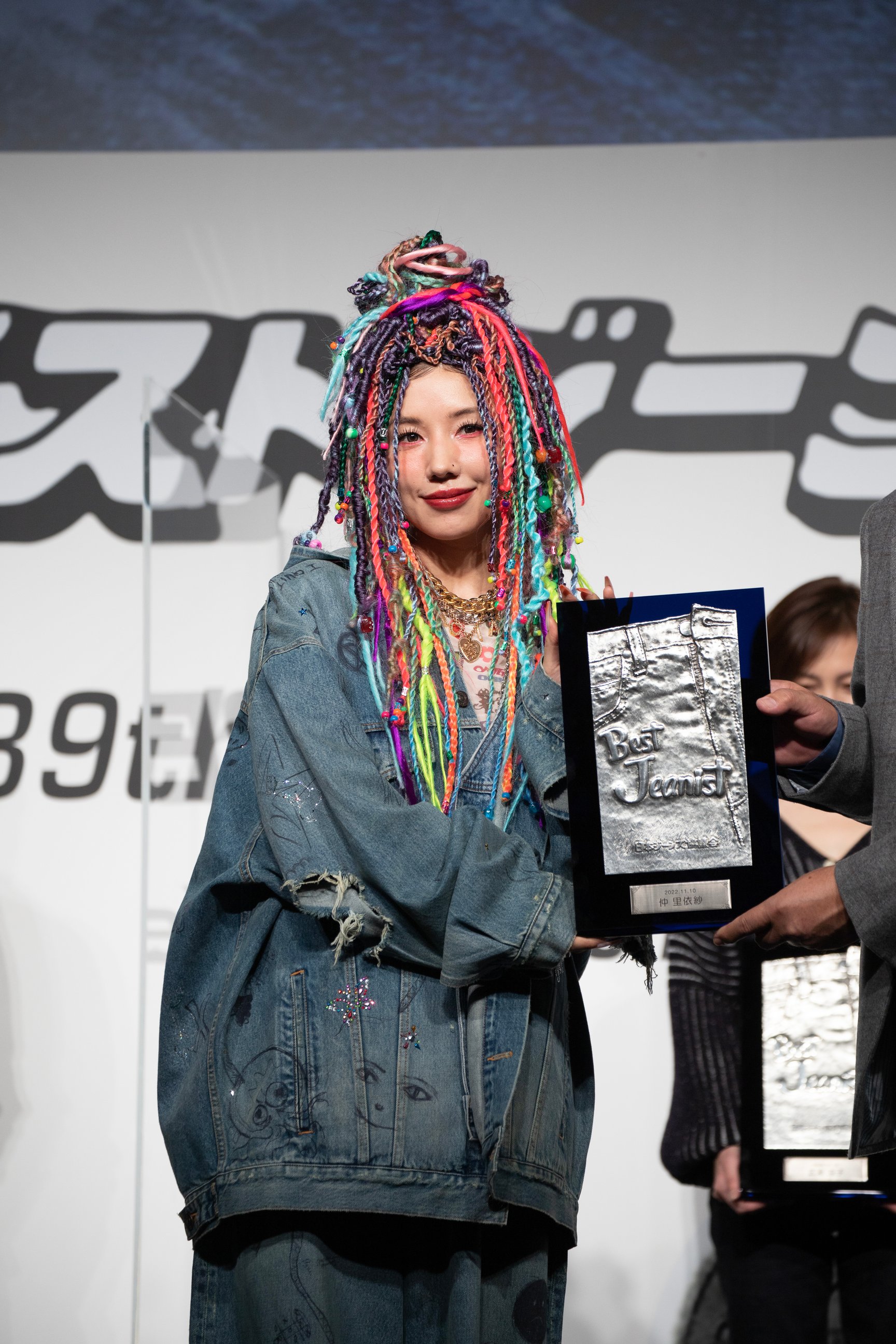 「ワコマリア(WACKO MARIA)」や「ワイルドサイド ヨウジヤマモト(WILDSIDE YOHJI YAMAMOTO)」のモデルを務めるなど、活躍の場を広げる窪塚愛流はコーディネートについて「Gジャンはシルエットがふんわりして可愛らしく、そこがポイントだと思っています」と回答。賞については、「僕にとってジーンズは幼い頃から馴染み深く、今でも欠かせないファッションアイテムの1つです。素敵な賞をいただけて、俳優として仕事に対しての意欲も高まり、やる気に満ち溢れています。地に足をつけてこれからも精進してまいります」と述べた。