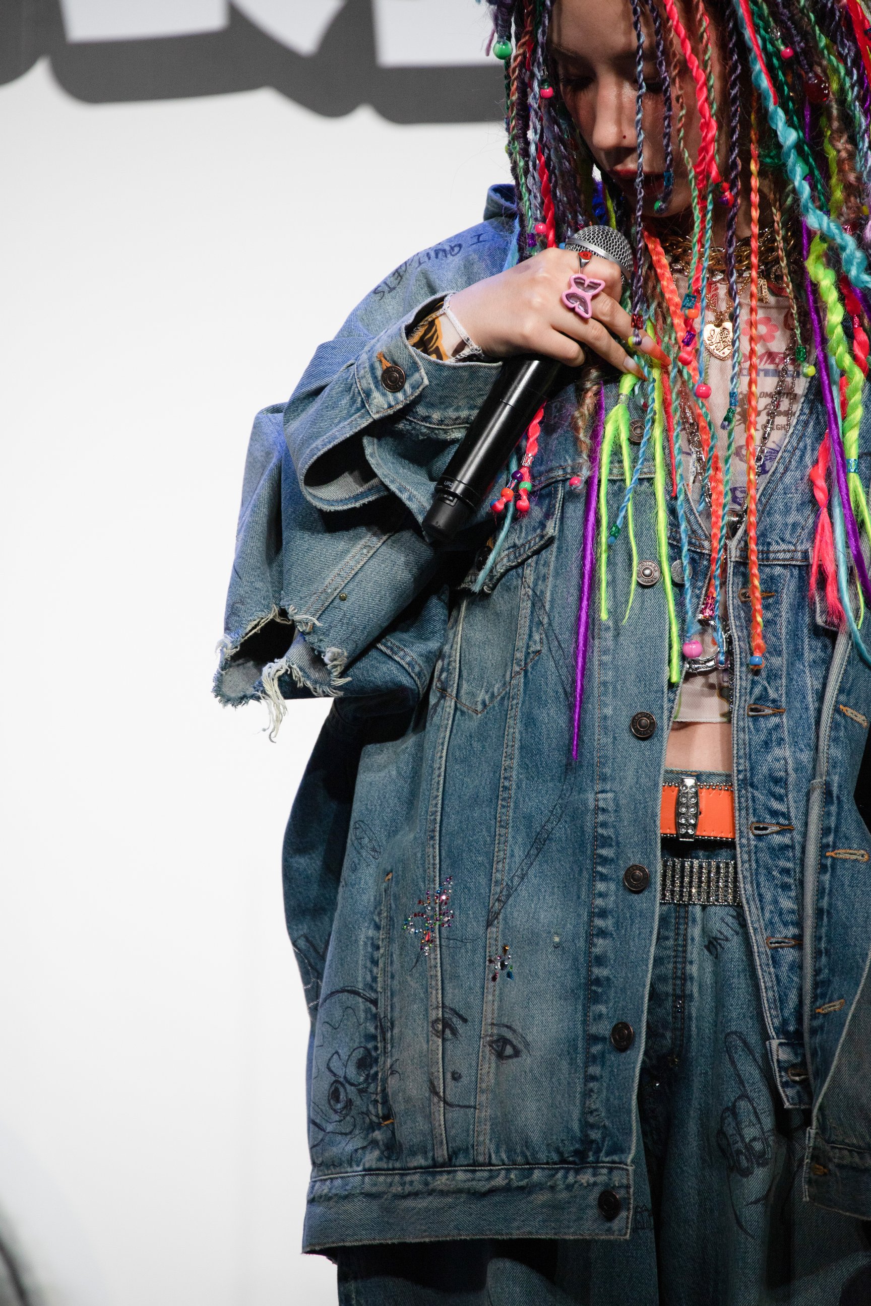 昨年、自身のブランド「アールイードット(RE.)」を立ち上げたことでも知られる仲里依紗は、3日かけて完成させたというカラフルなドレッドヘアー姿で登場。私物の「バレンシアガ(BALENCIAGA)」のセットアップをセルフスタイリングしたコーディネートを披露した。