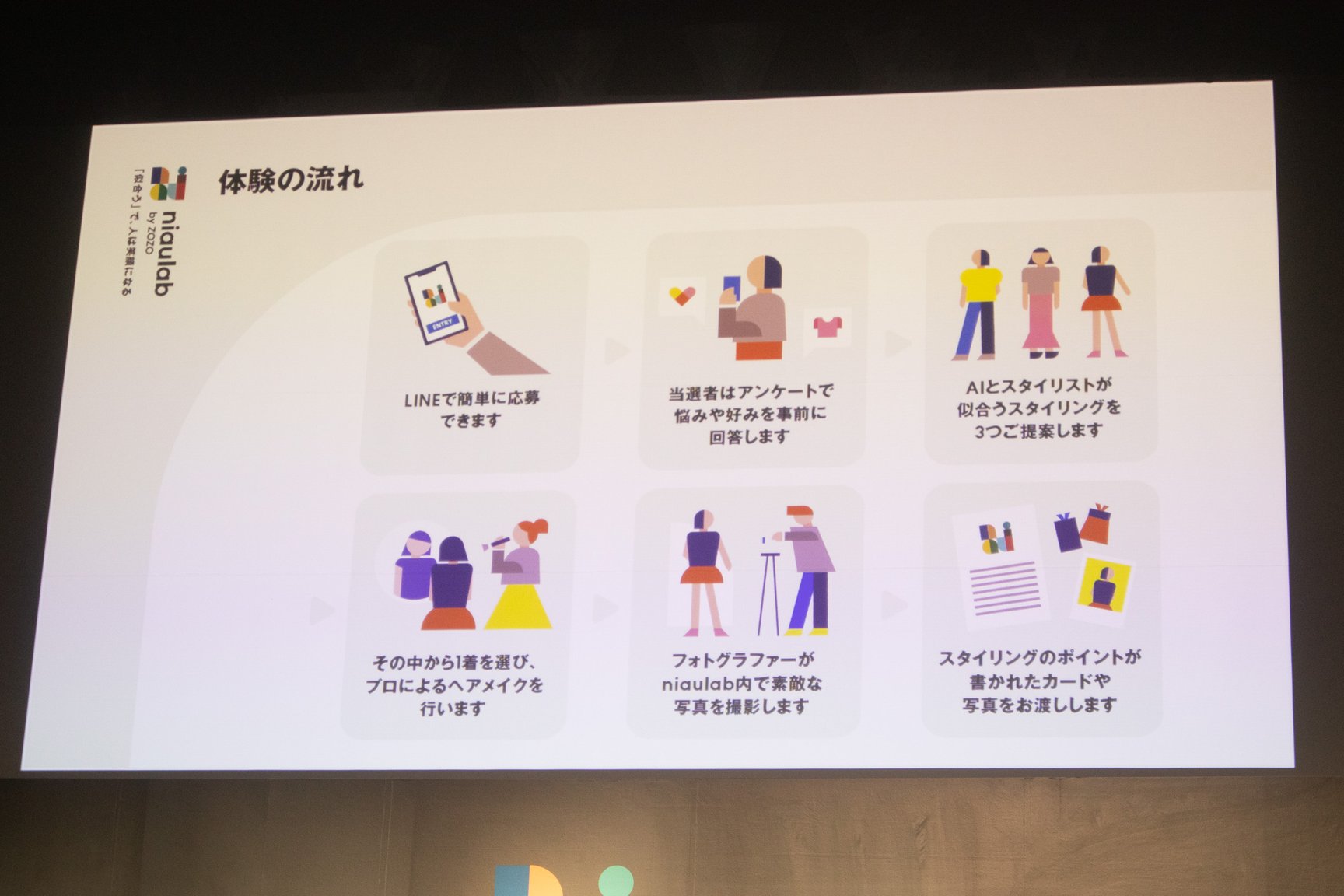 パーソナルスタイリングサービスは他社でも提供されているが、ZOZOのリアル店舗最大の強みは「AI×プロのスタイリスト」の組み合わせだ。店舗の利用にはLINEの専用アカウントから事前の来店応募が必要となり、当選者はファッションに関するアンケートが配付される。来店当日は回答内容を元に、niaulab独自のAIが「ウェア(WEAR)」に投稿されている1300万件のコーディネートから「似合う」と判断した3ルックをピックアップし、プロのスタイリストによるヒアリングを経て1ルックを決定する。サービスに参加するスタイリストは濱本愛弓や近藤和貴子、片貝俊など、ファッション雑誌でも活躍する顔ぶれが揃う。