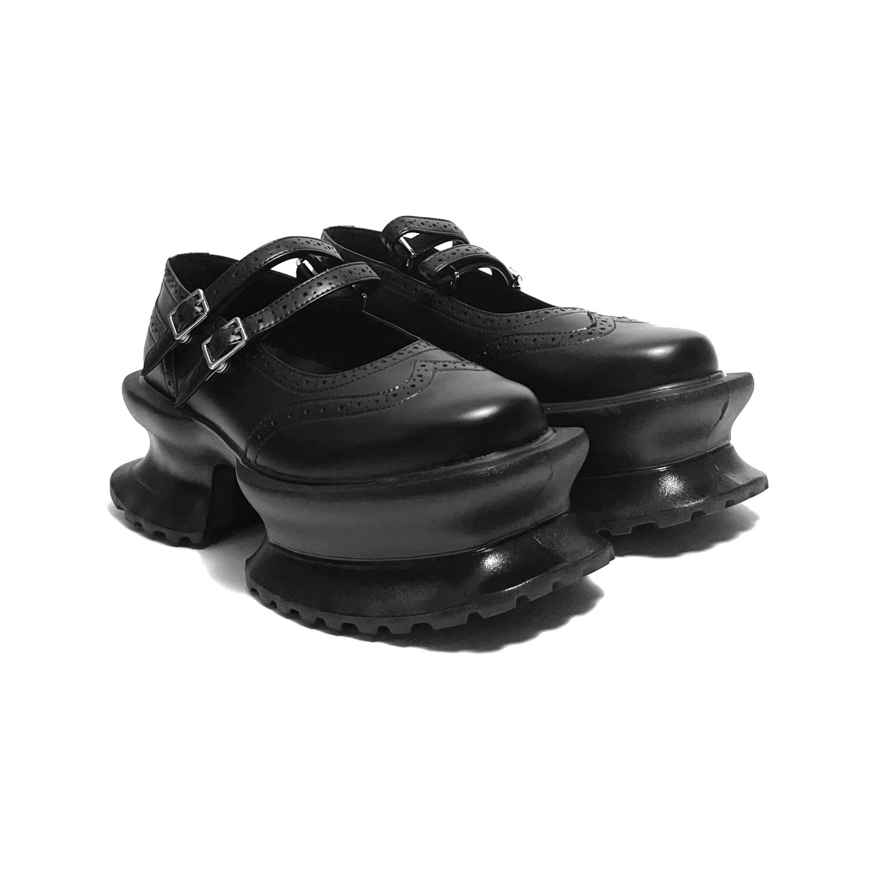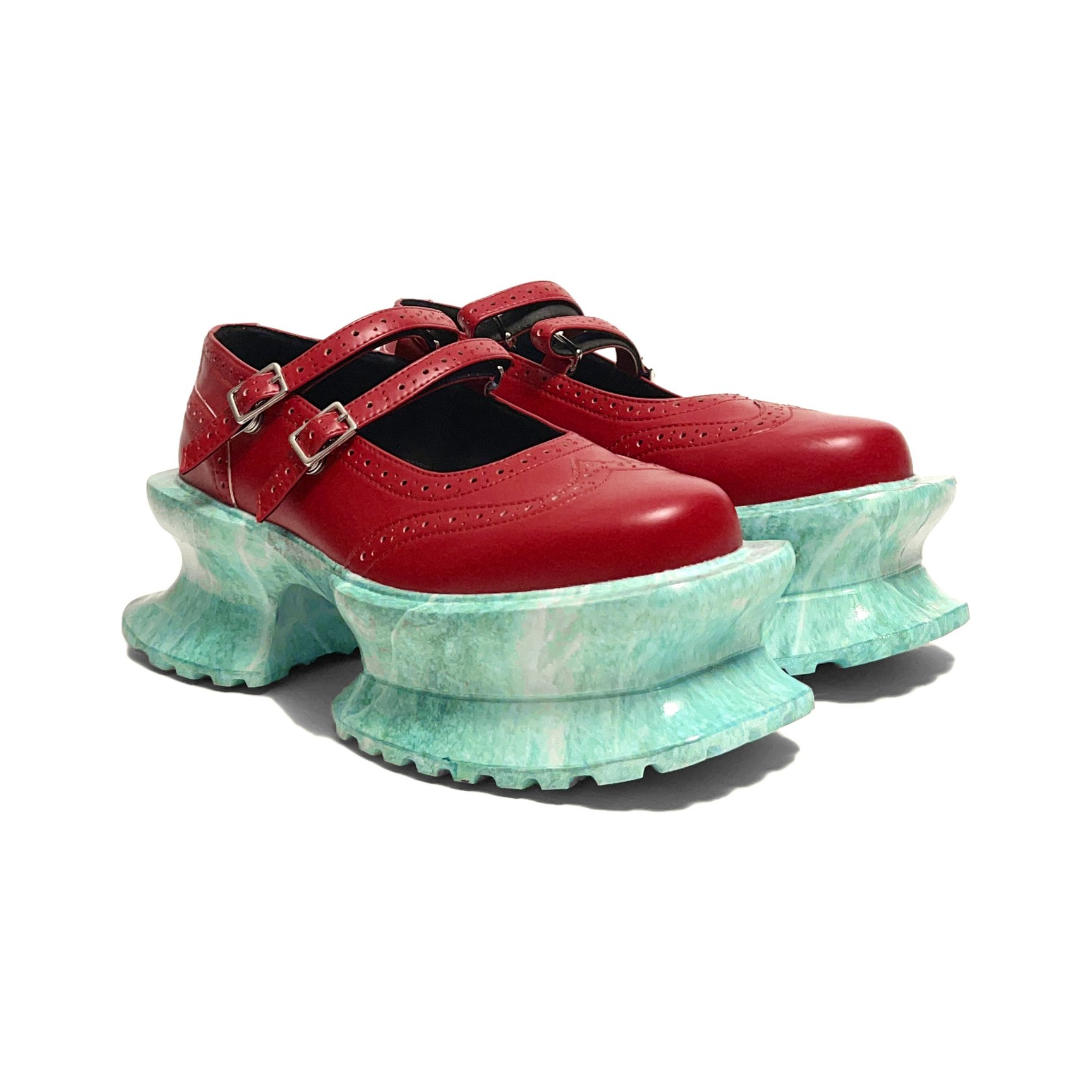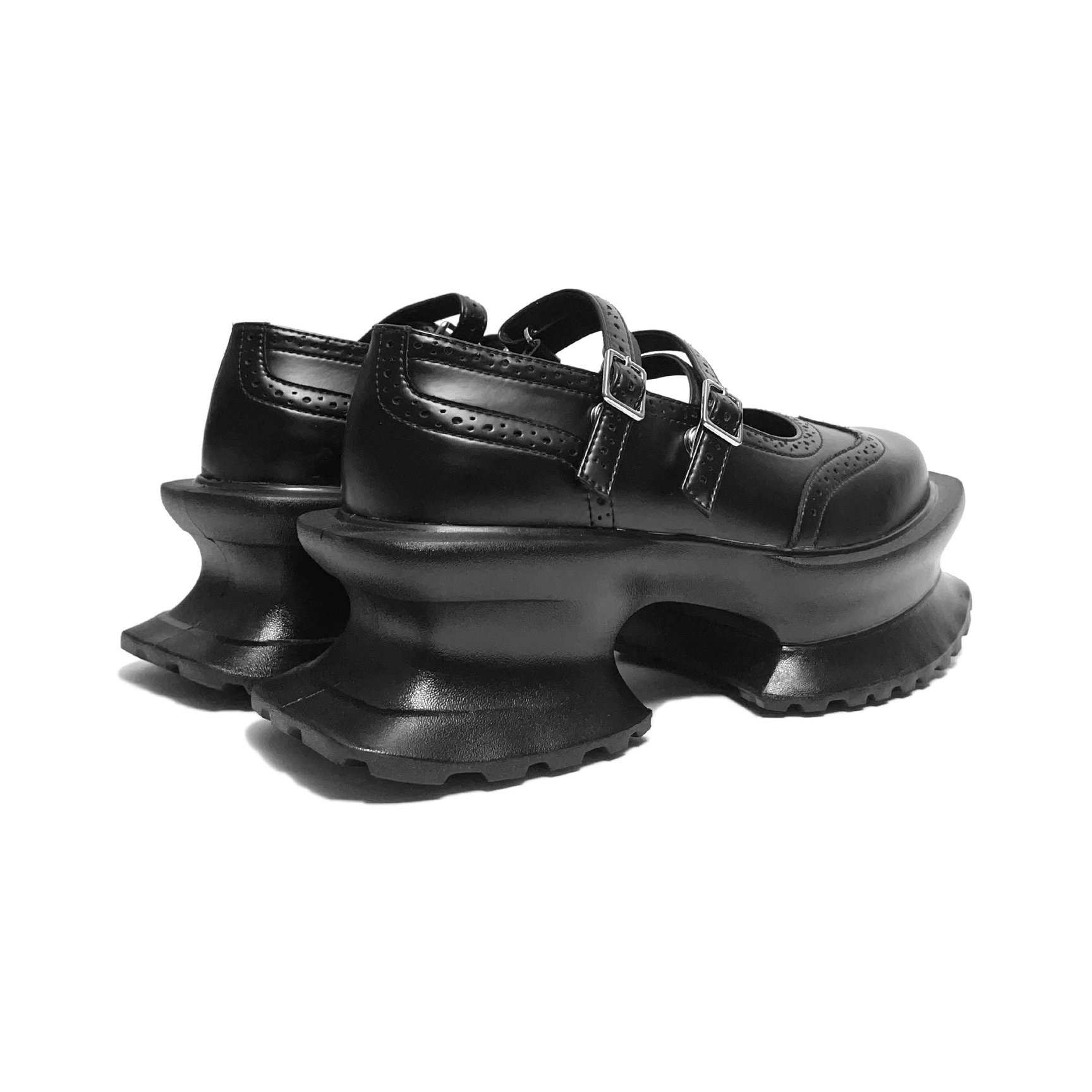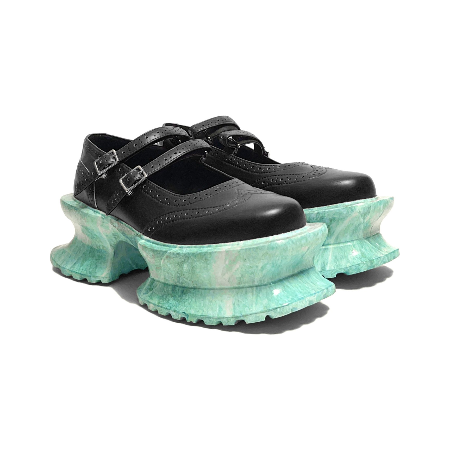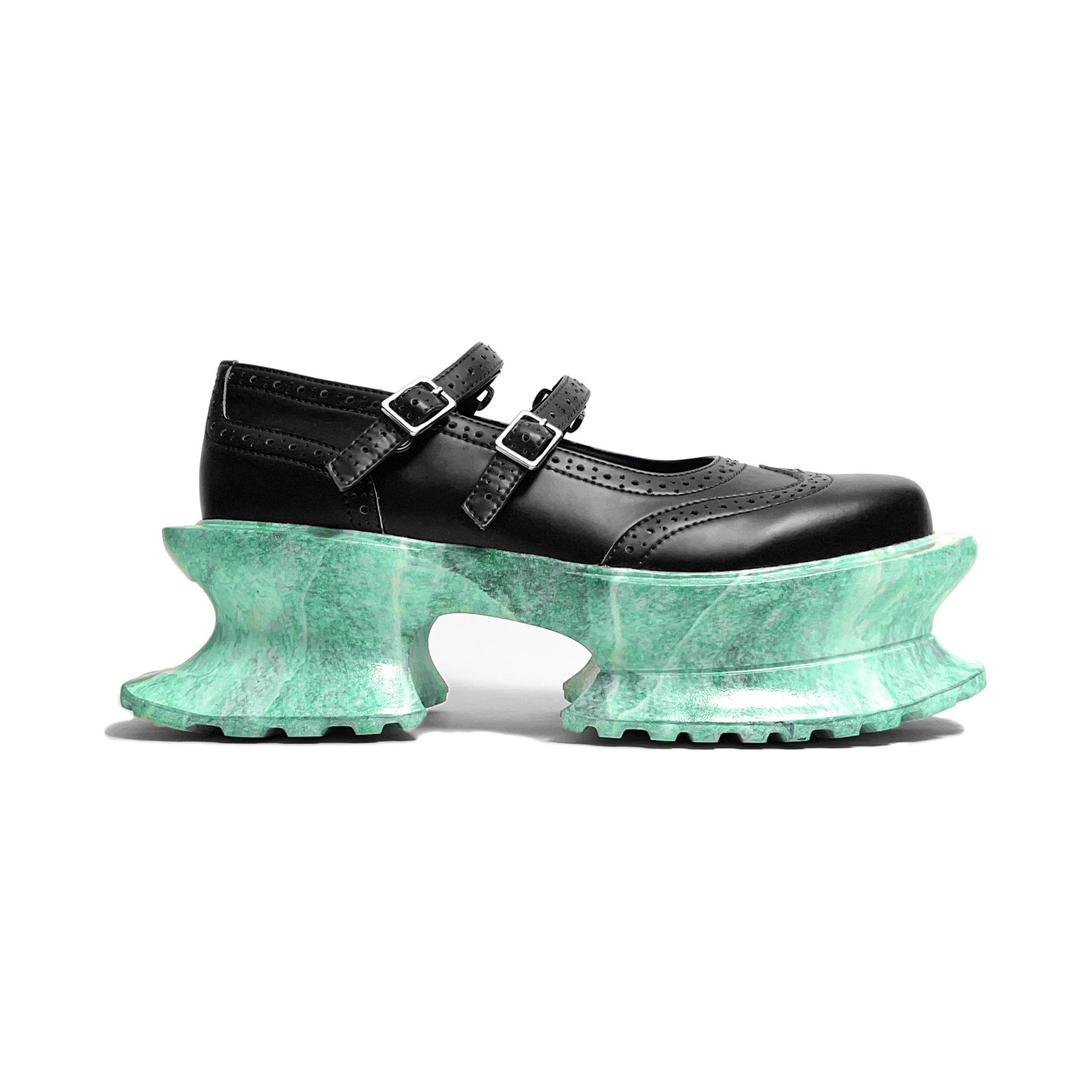 エアリアル ガーデンは3D技術を用いて作られた完全オリジナルのシューズ。メリージェーンとブローグディテールのアッパーに、6.5cmのアウトソールにはこれまでと同様にスニーカー素材を採⽤した。カラーは「Black leather×BK」(3万9600)、「Black leather×jade」(4万9500)、「Red leather×jade」(4万9500/いずれも税込)の全3⾊、サイズは22~26cmを用意。ブラックカラーと鉱物の翡翠パターンをテキスタイルに使用した。受注販売はポップアップストアが11月27日まで、オンラインストアが12月11日まで受け付ける。