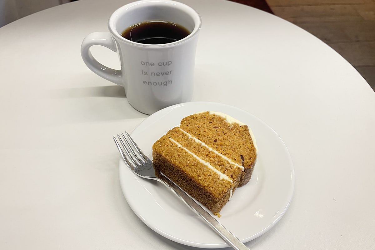 英国生まれのお菓子なので、紅茶との相性はバッチリ。しかし、コーヒーとのペアリングもイケる!ハンドドリップで丁寧に淹れられたSNOW AND COFFEE TABLEのコーヒーをお供に、ケーキを堪能した。