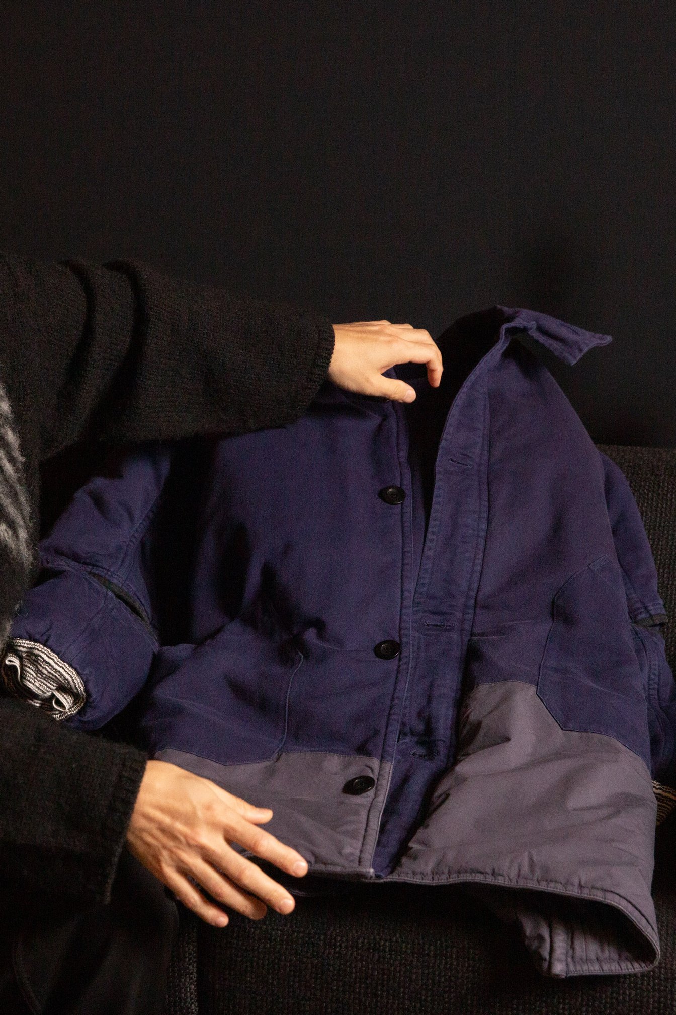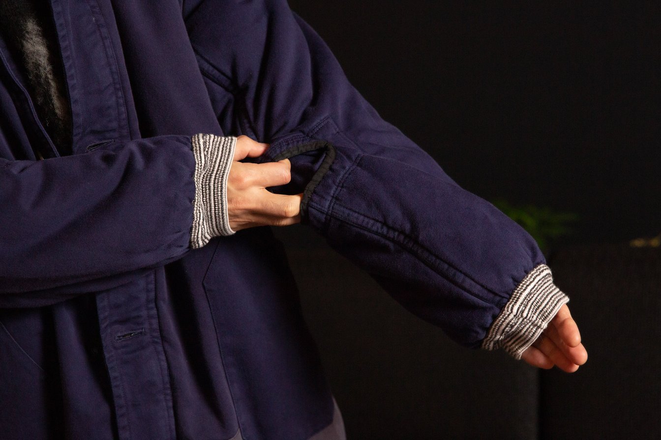 山口:家の中で着るような素材感と雰囲気なんですよね。アウターって雨に強いとか風を通さないとか、機能が求められると思うんですけどそういうの無視で、着心地は完全にちゃんちゃんこ。わりと重みがあって布団を着る感覚というか。雨の日に着たらどれだけ重くなるんだろう。
