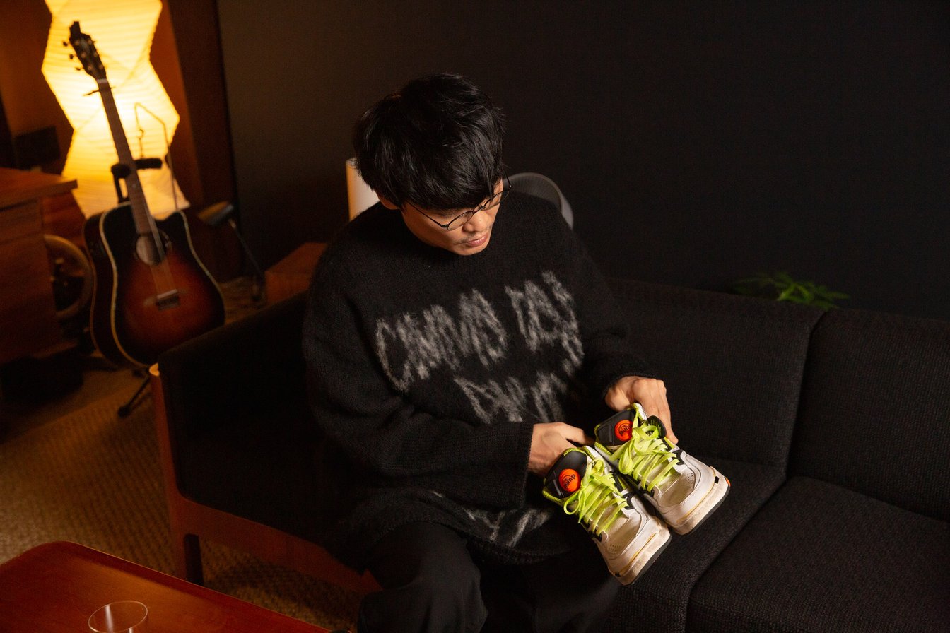 山口:僕のラッキーカラーが黄色なんです。なので青と迷いつつ、こちらにしました。あとハイカットのスニーカーも普段あまり履かないんですが、これは考え方が面白いなと思って選びましたね。太いパンツとの相性も良くてドカッと履ける。だいたい裾で隠れますけど、ノーズの見え方も好みの感じでした。