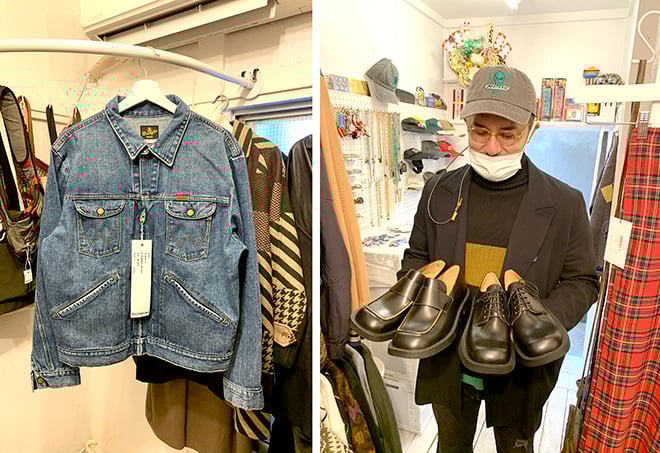コウザブロウのラングラーコラボ(左):「『コウザブロウ』も結構売れましたね。このラングラーとのコラボも結構反応がよかったです。日本のデザイナーブランドだと、この『コウザブロウ』ぐらい個性が強いほうが、うちでは人気ですね」。カンペール・ラボの靴(右):「いまのオススメはこの『カンペール・ラボ』の2023年春夏の新作です。この靴に『カルーゾ』のようなイタリアンクラシコ系のスーツをあわせるのがテーマです。モードブランドがやりそうなバランスが、『カルーゾ』のようなちゃんとしたテーラードの服だと表現できるんです」。