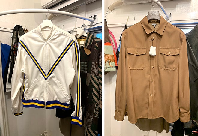 へんなスポーツウェア(左):「イメージしているのは、ちょっとレトロなアメリカ、またはフレンチのジャージ。こういう古着をおしゃれに取り入れてくれる若い人たちがいたらいいですよね。ラグジュアリーブランドなどが現行で展開しているようなアイテムと、デザインのテンションとしては近いと思っています」。イタリアのカルーゾのシャツジャケット(右):こちらは新品。