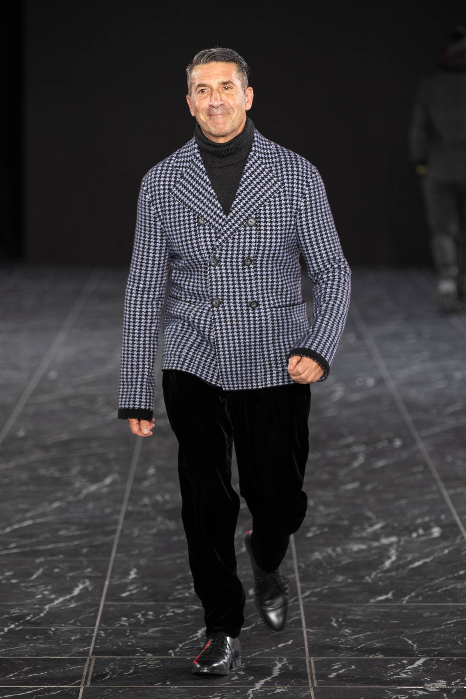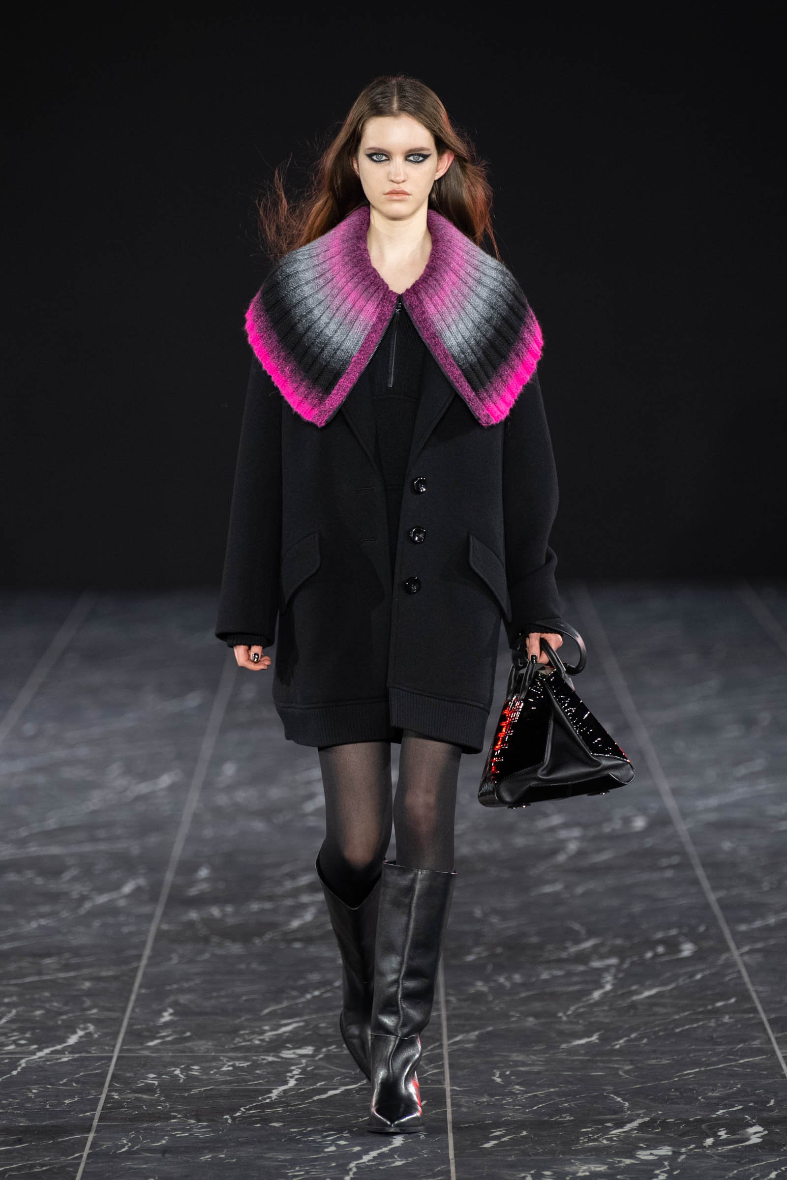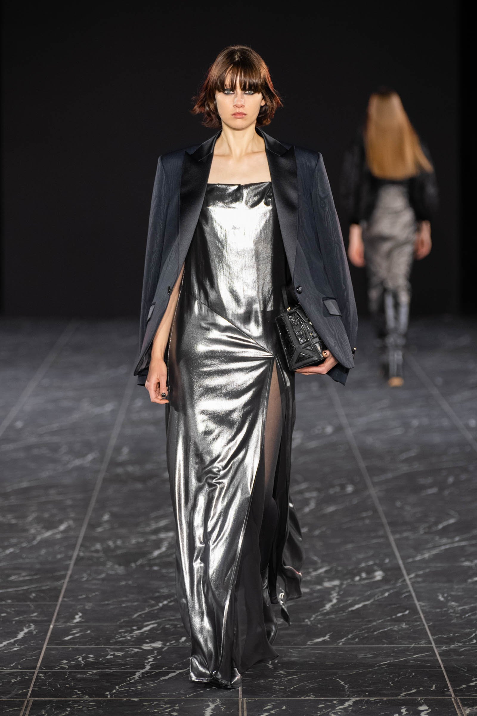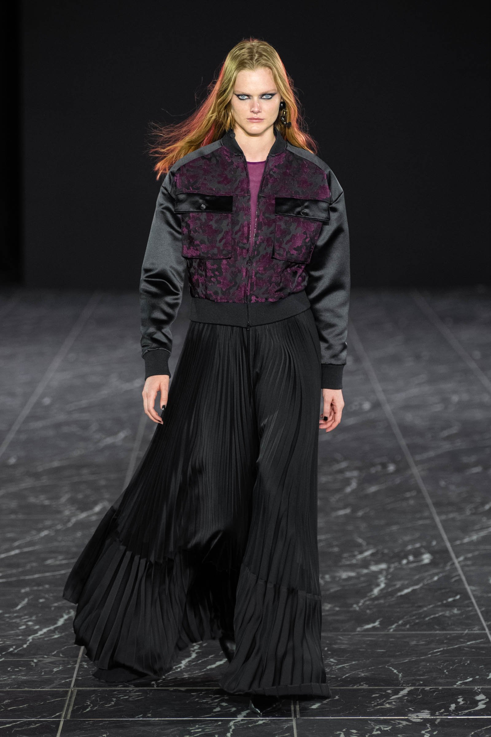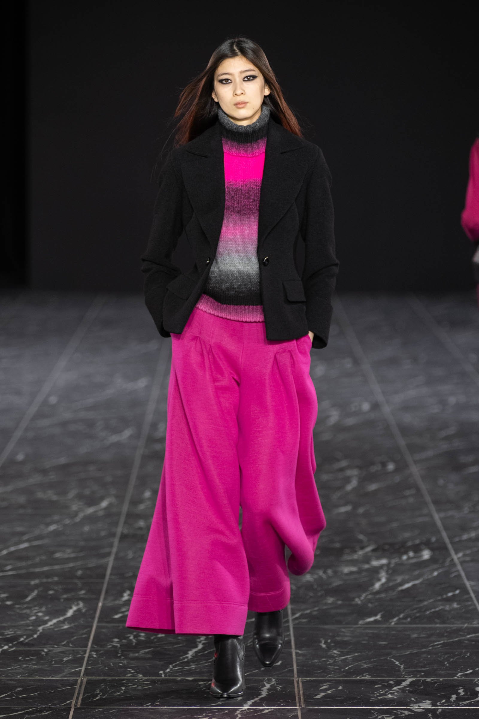 コレクションは、コロナ禍がひと段落し、今後はより力強い時代が訪れるのではという思いから「風を巻き起こす」をテーマにヴィヴィッドカラーや光沢感のある素材が印象的なルックが多く並んだ。男女のモデルが同じ服を着用し、10代のモデルからパンツェッタ・ジローラモまで幅広い年齢層のモデルがランウェイに登場するなど固定観念に縛られない演出を目指したという。ショーに合わせて作られた楽曲は、重低音の響く緊張感のある曲調に始まり、終盤ではピアノをミックスさせることで美しさを表現。タエ アシダのムードにあった強さと美しさを意識したという。