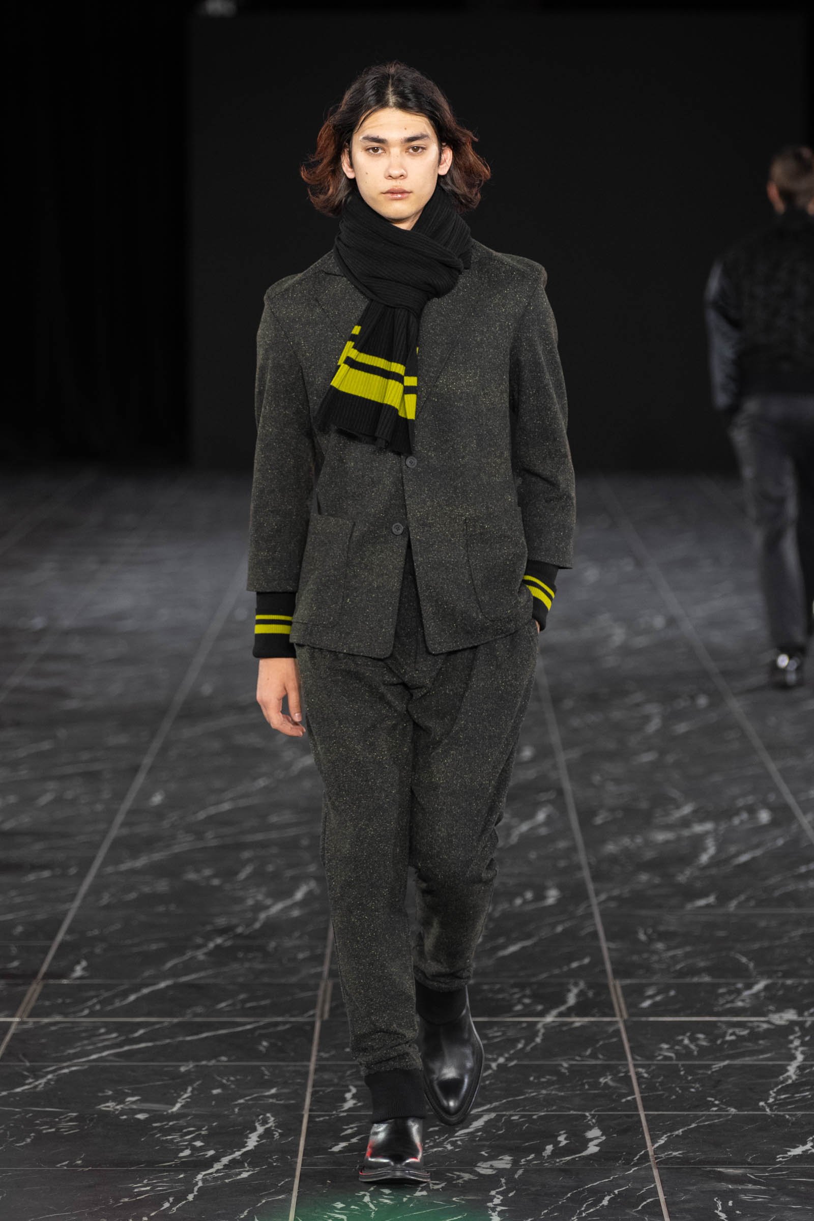 ショーは新宿住友ビルの三角広場で行われた。会場の大型モニターにSHUZO自身が出演しクリエイティブディレクターとして制作も担当したティザー映像が映し出された後、モニターの下に設置されたDJブースまでSHUZOがランウェイを歩いて入場し、ショーがスタートした。