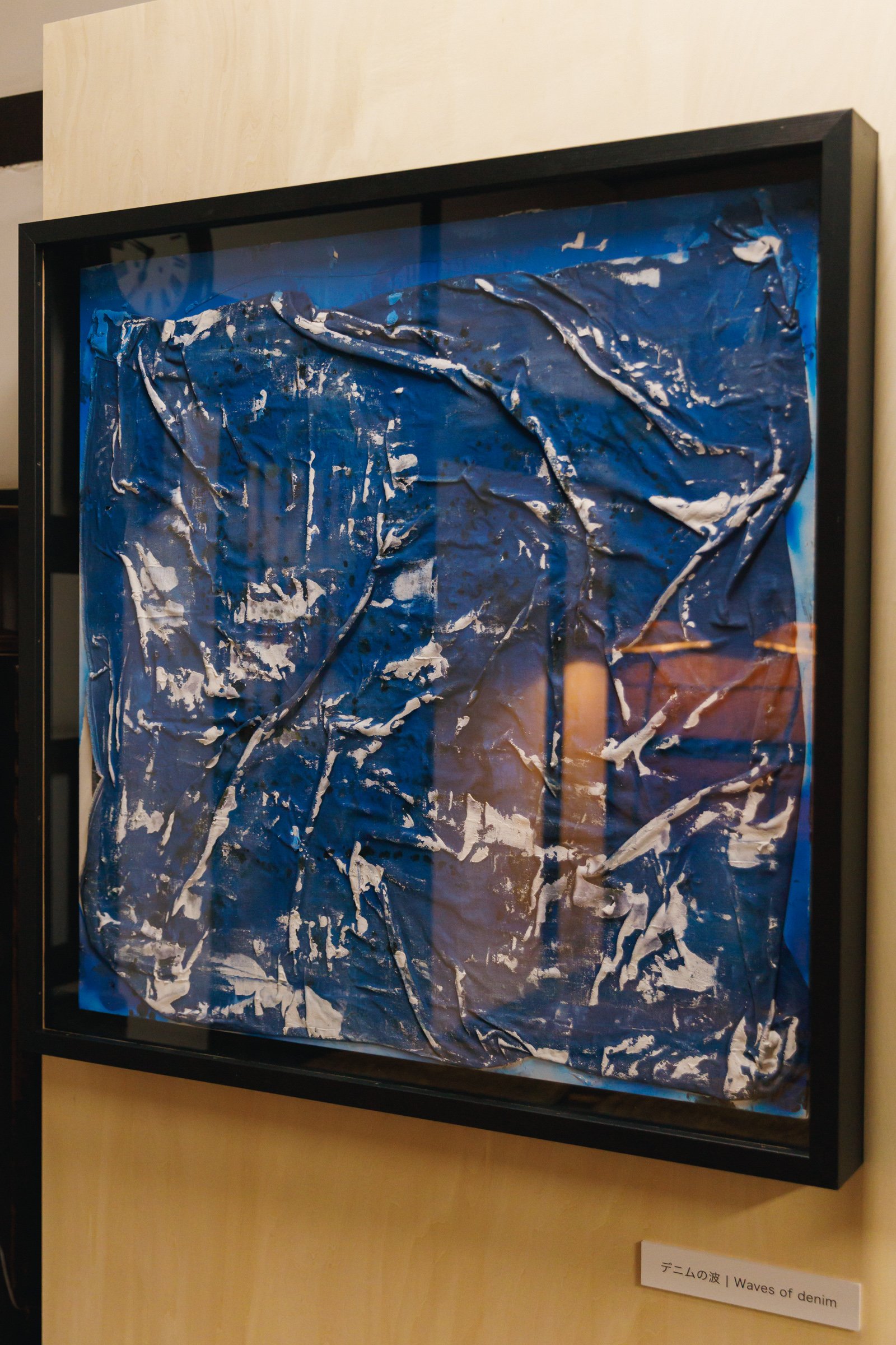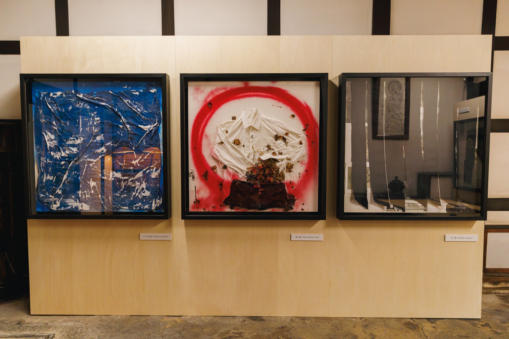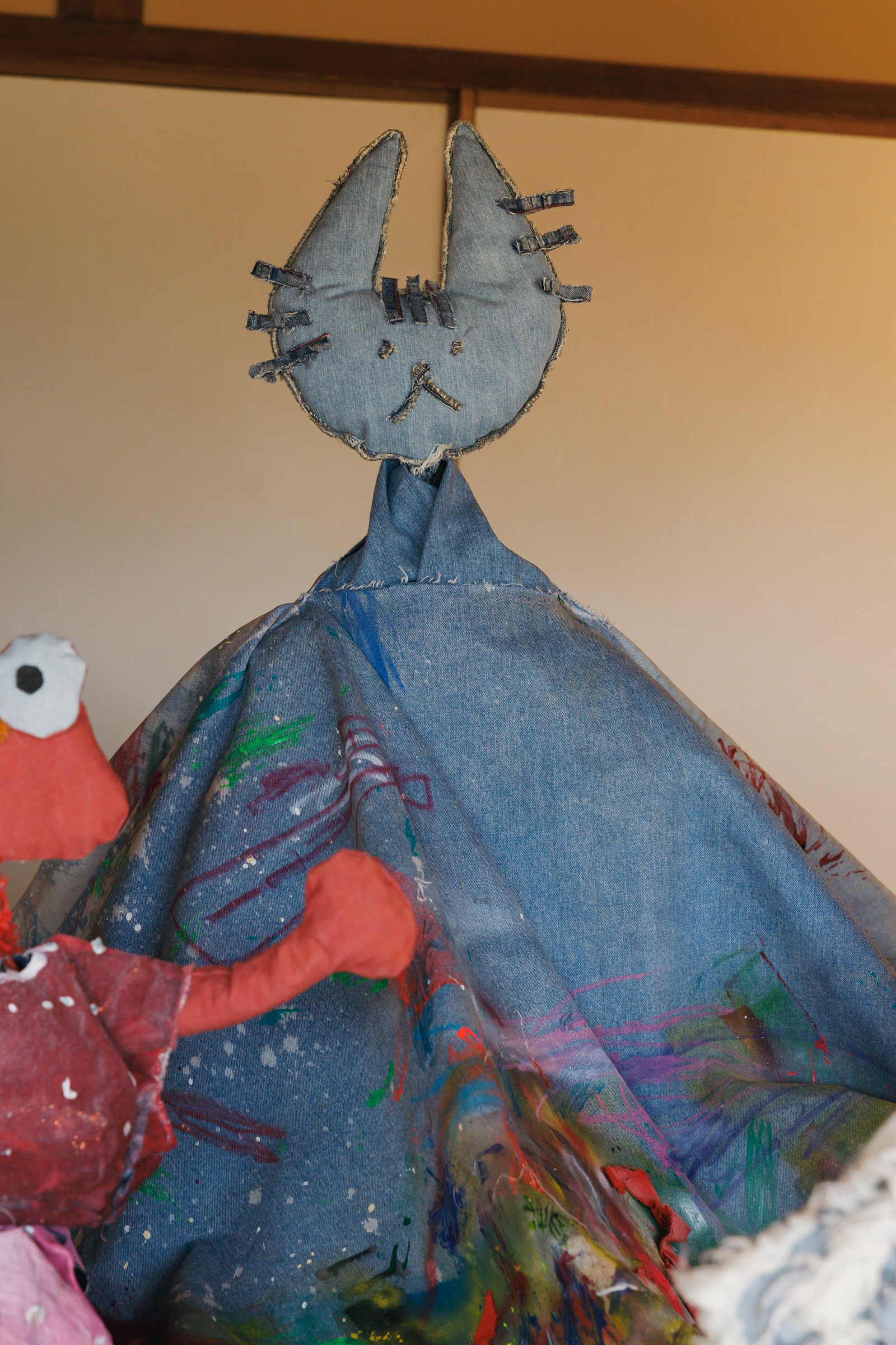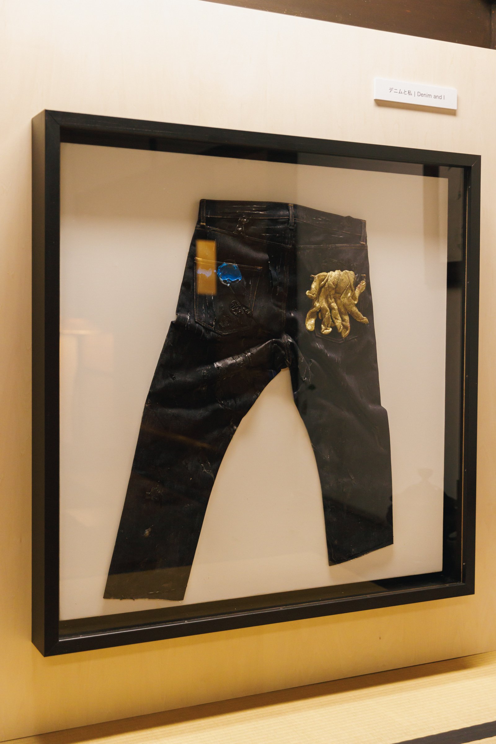 旅館くらしきでは、韓国出身の男性ダンスヴォーカルグループ「SUPERNOVA(超新星)」のゴニルが新作を発表。「普通の衣類よりも洗濯の頻度が少ないデニムは人間との距離が近いと感じる」というゴニルは、「デニムと自分との距離感」をイメージし制作に臨んだという。「色の使い方も、デニムを選ぶとき、私服を選ぶときに合わせる色のを選ぶようにバランスにこだわりました」とコメントした。ゴニルは同展の開催に合わせて来日し、8、9日の2日間は在廊する予定だ。