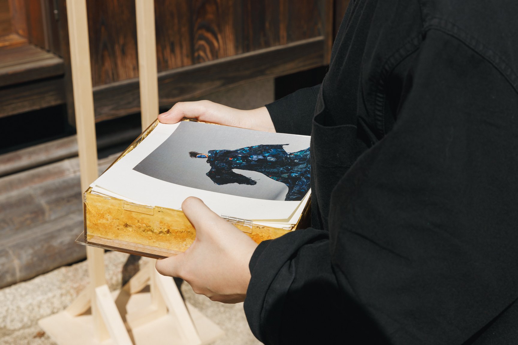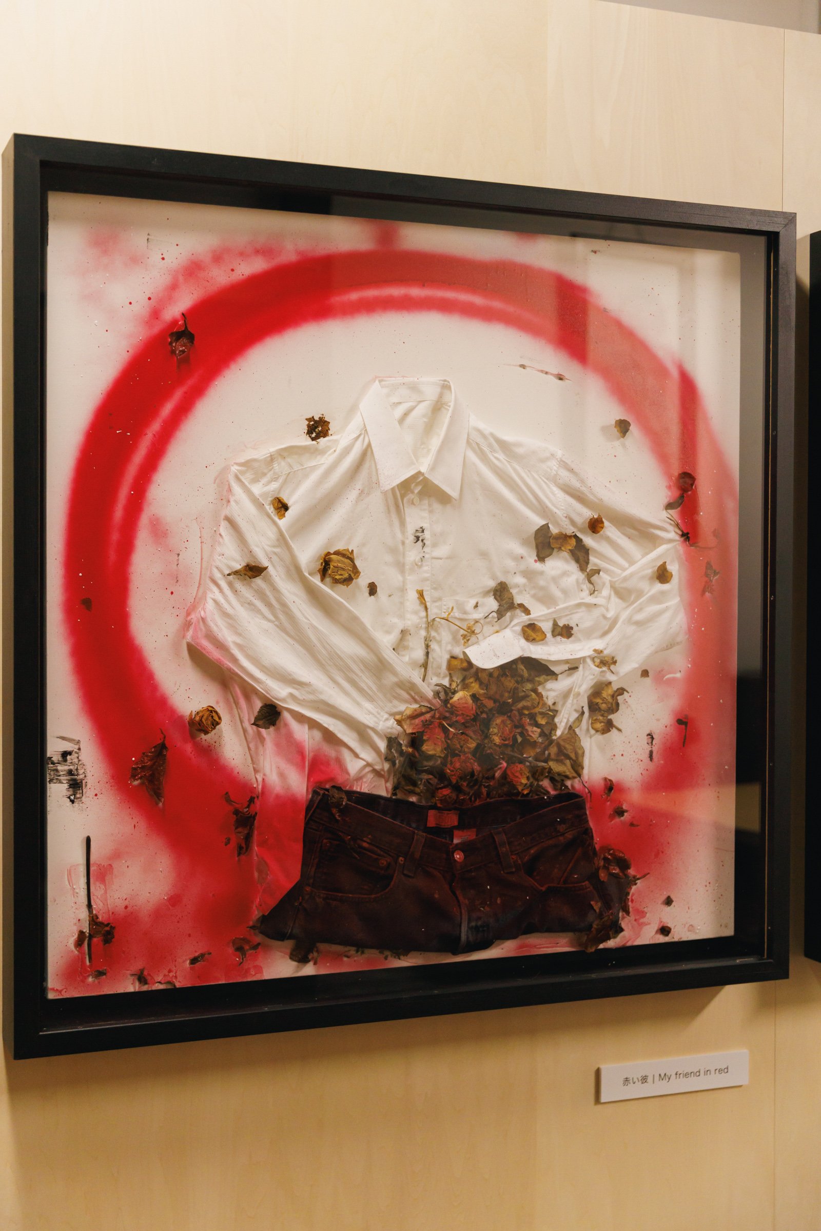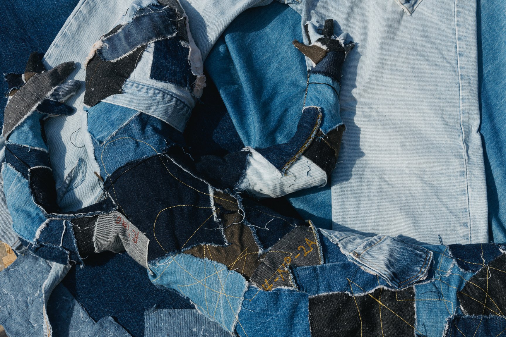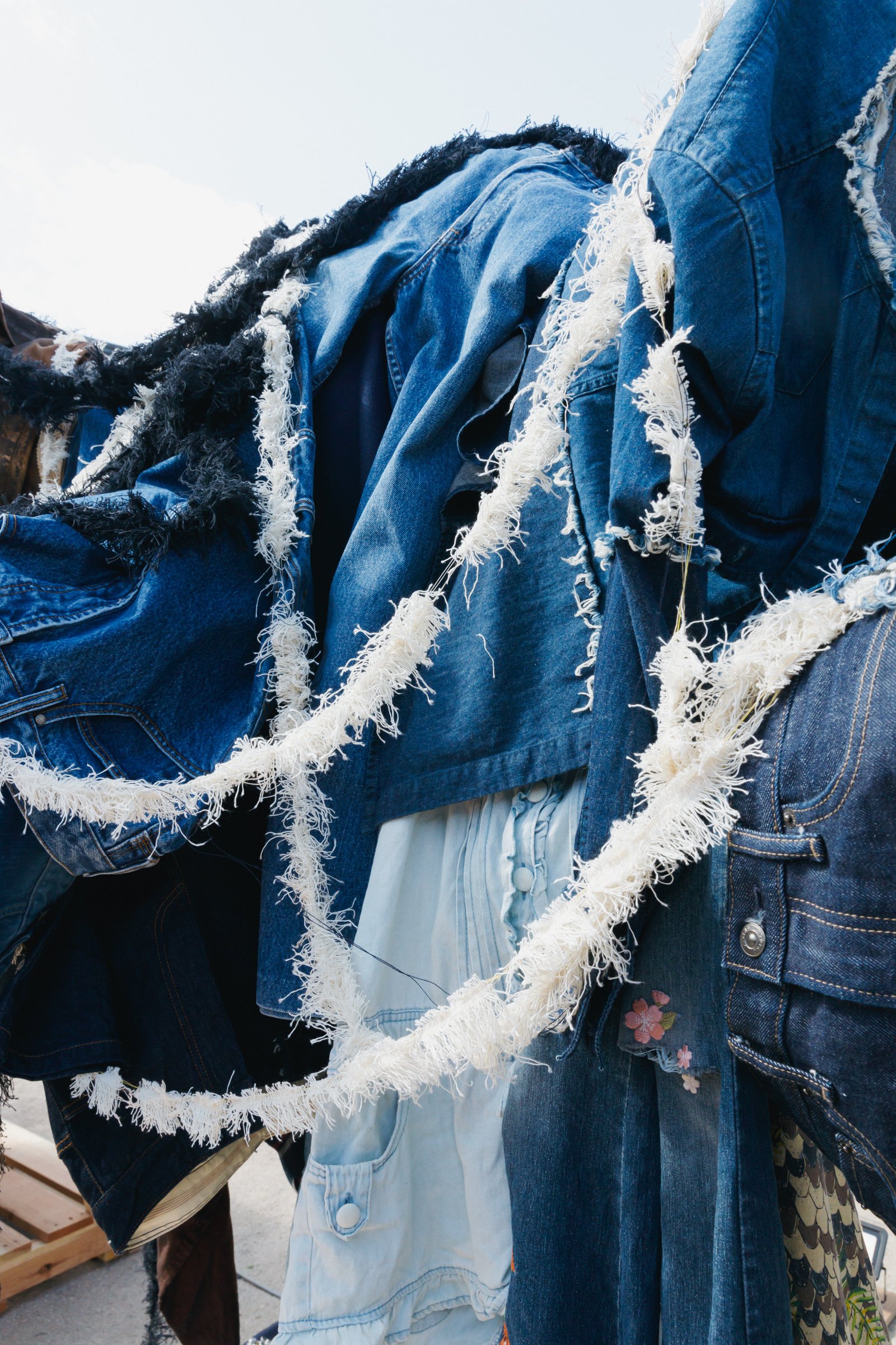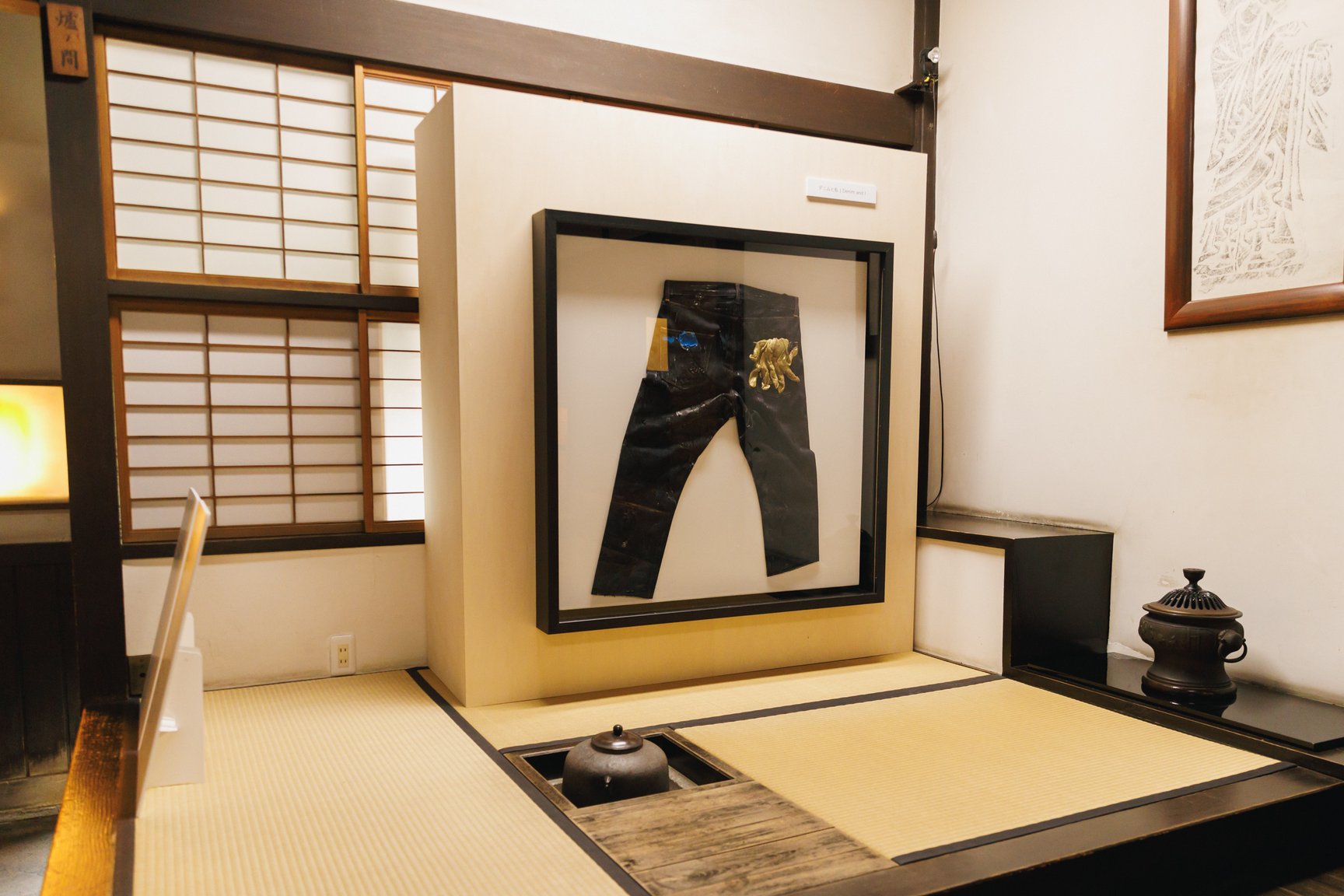 旅館くらしきでは、韓国出身の男性ダンスヴォーカルグループ「SUPERNOVA(超新星)」のゴニルが新作を発表。「普通の衣類よりも洗濯の頻度が少ないデニムは人間との距離が近いと感じる」というゴニルは、「デニムと自分との距離感」をイメージし制作に臨んだという。「色の使い方も、デニムを選ぶとき、私服を選ぶときに合わせる色のを選ぶようにバランスにこだわりました」とコメントした。ゴニルは同展の開催に合わせて来日し、8、9日の2日間は在廊する予定だ。