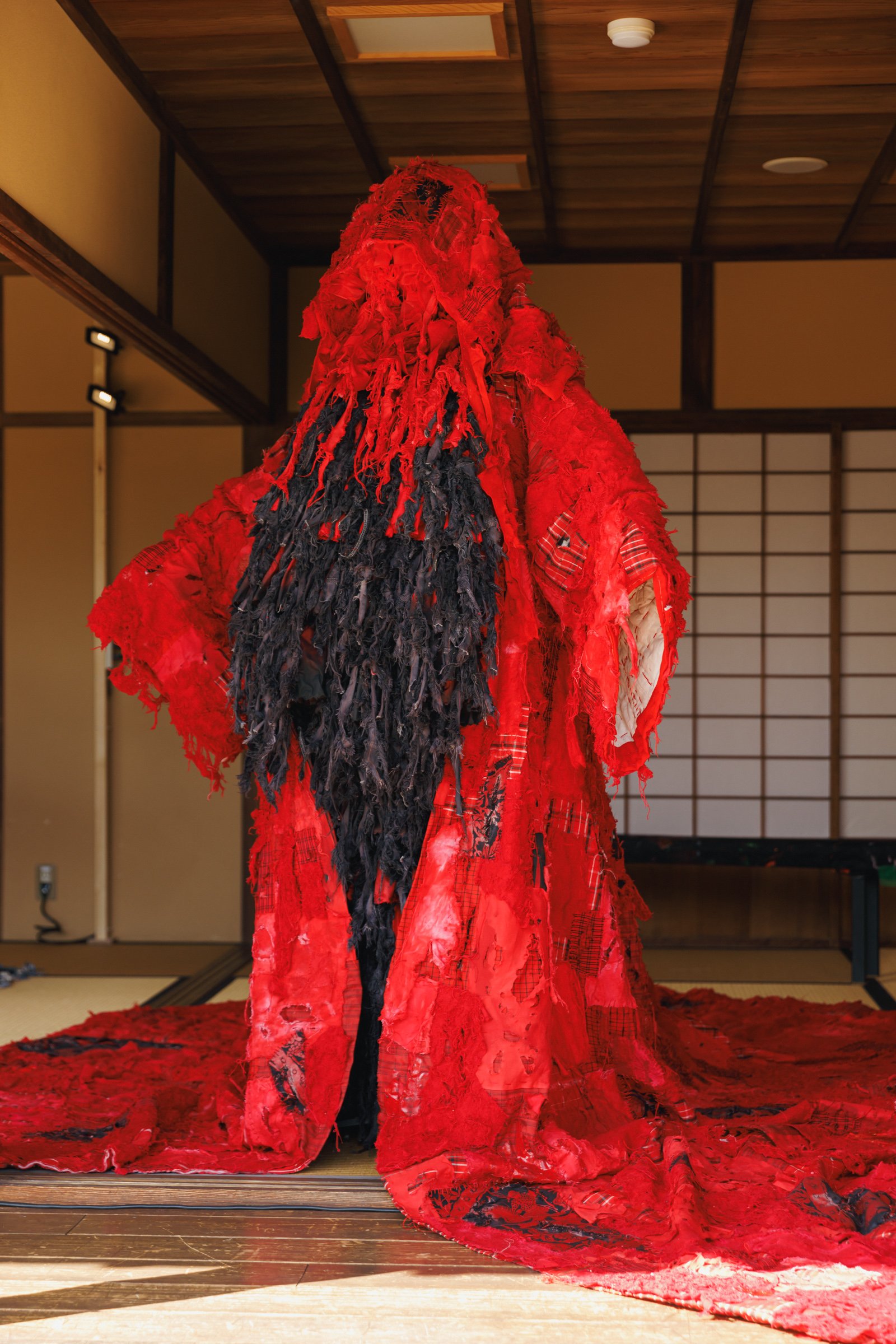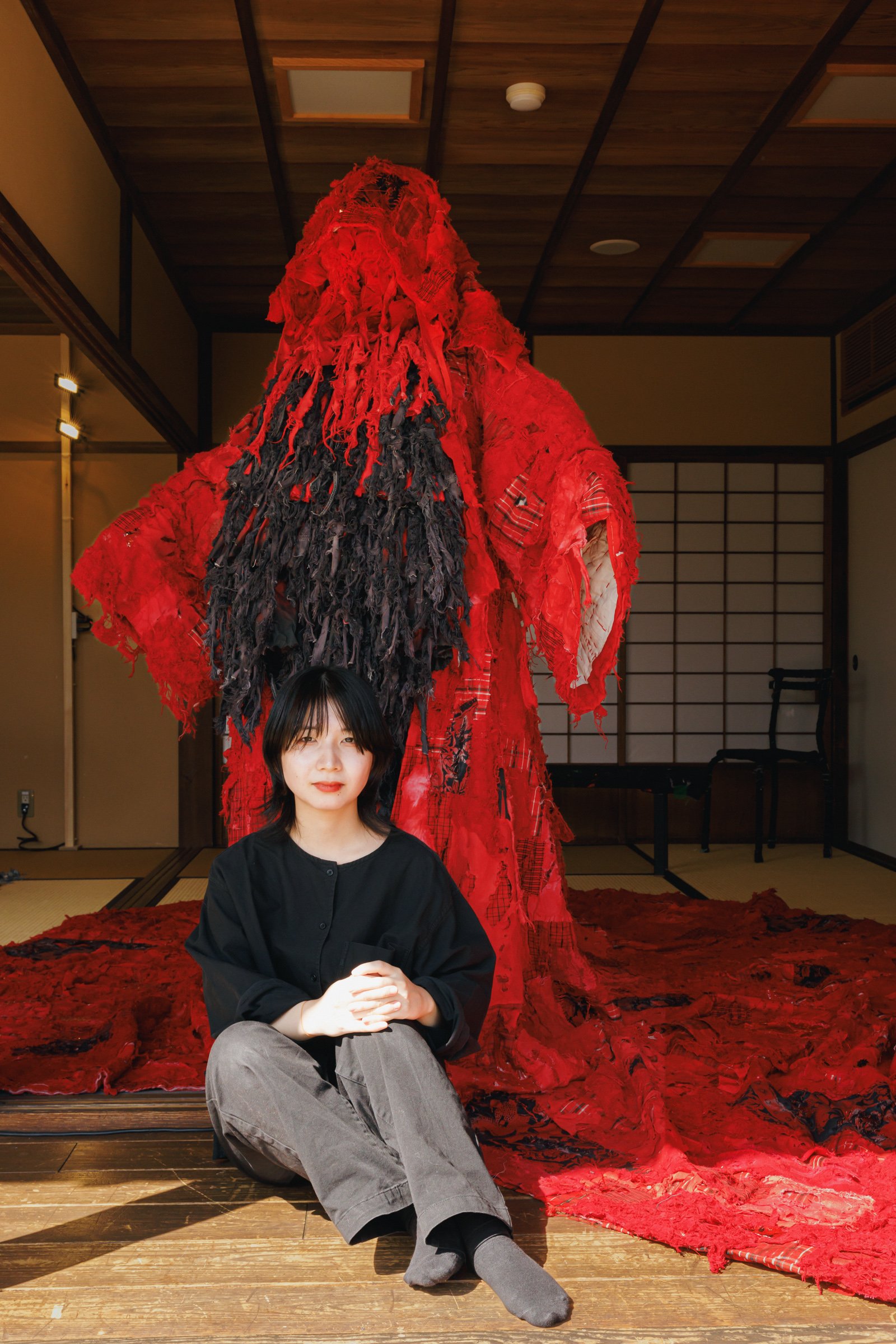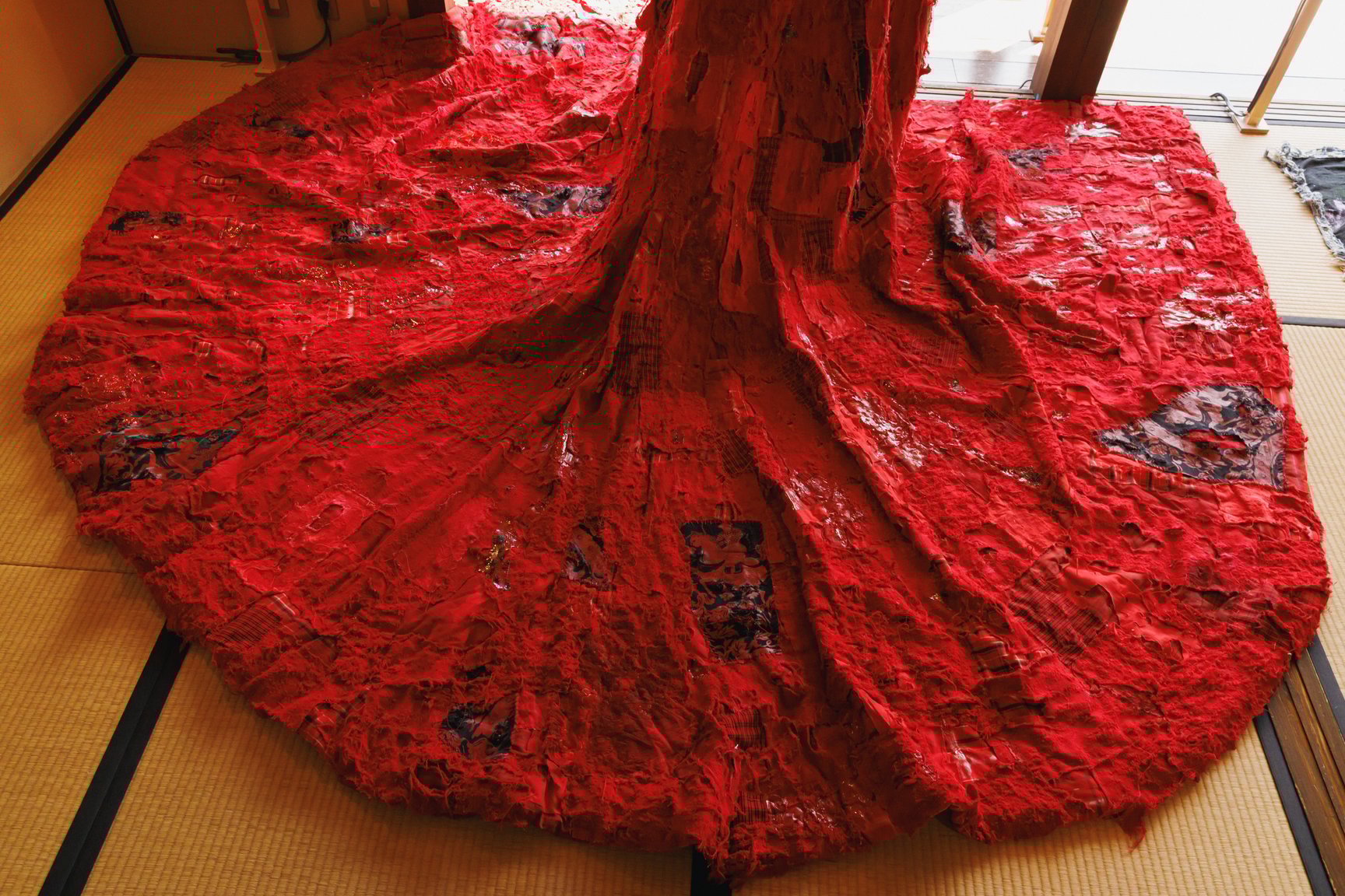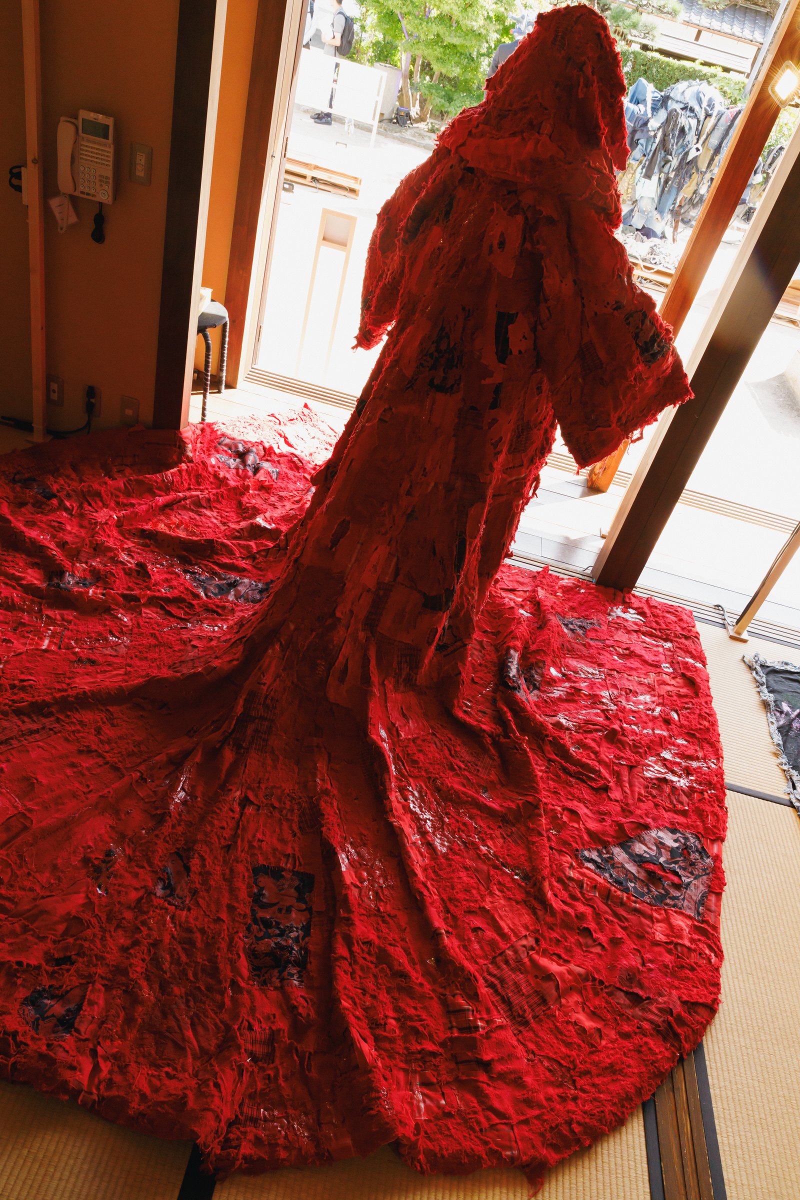 2019年にITSファッション部門のファイナリストに最年少19歳で選出され、現在はアーティストの衣装なども手掛けるデザイナーで美術家の八木華は、デニムと白無垢などの晴れ着の廃材を掛け合わせた「襤褸の晴れ着」を披露。デニム素材を用いた作品制作は、襤褸(ぼろ)を着想源に「ディーゼル(DIESEL)」のデニムを使って制作したITSの課題作品以来、4年ぶりだという。今回は様々な固定概念を壊していくことをテーマに、貧しさの中で生まれた襤褸と正反対存在である晴れ着の素材を使用し、デニムのイメージである青と対照的な赤色にデニムを染め直した。赤色には、白無垢に込められた「花嫁が結婚相手の家に染まる」といった意味に対するアンチテーゼも含まれている。
