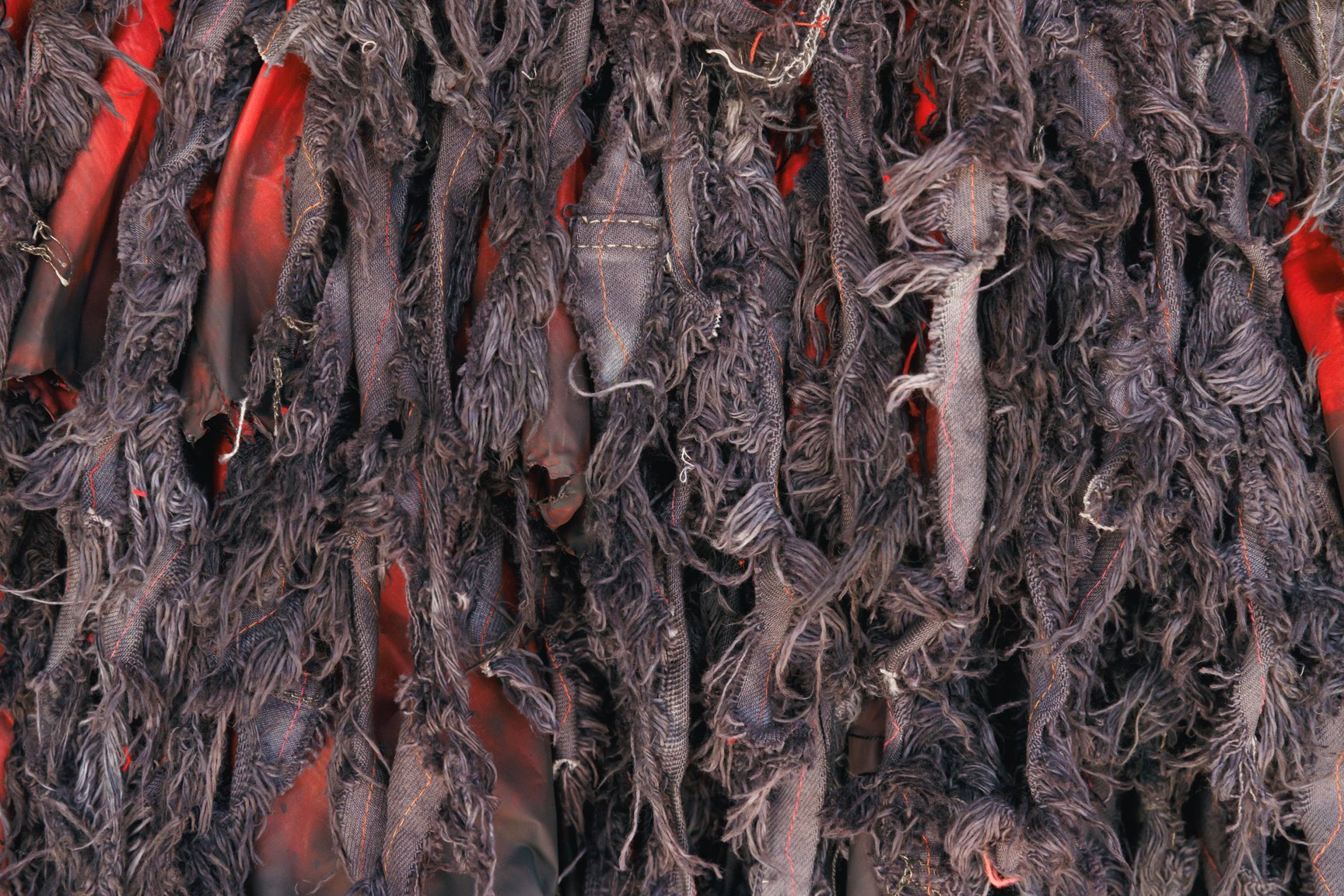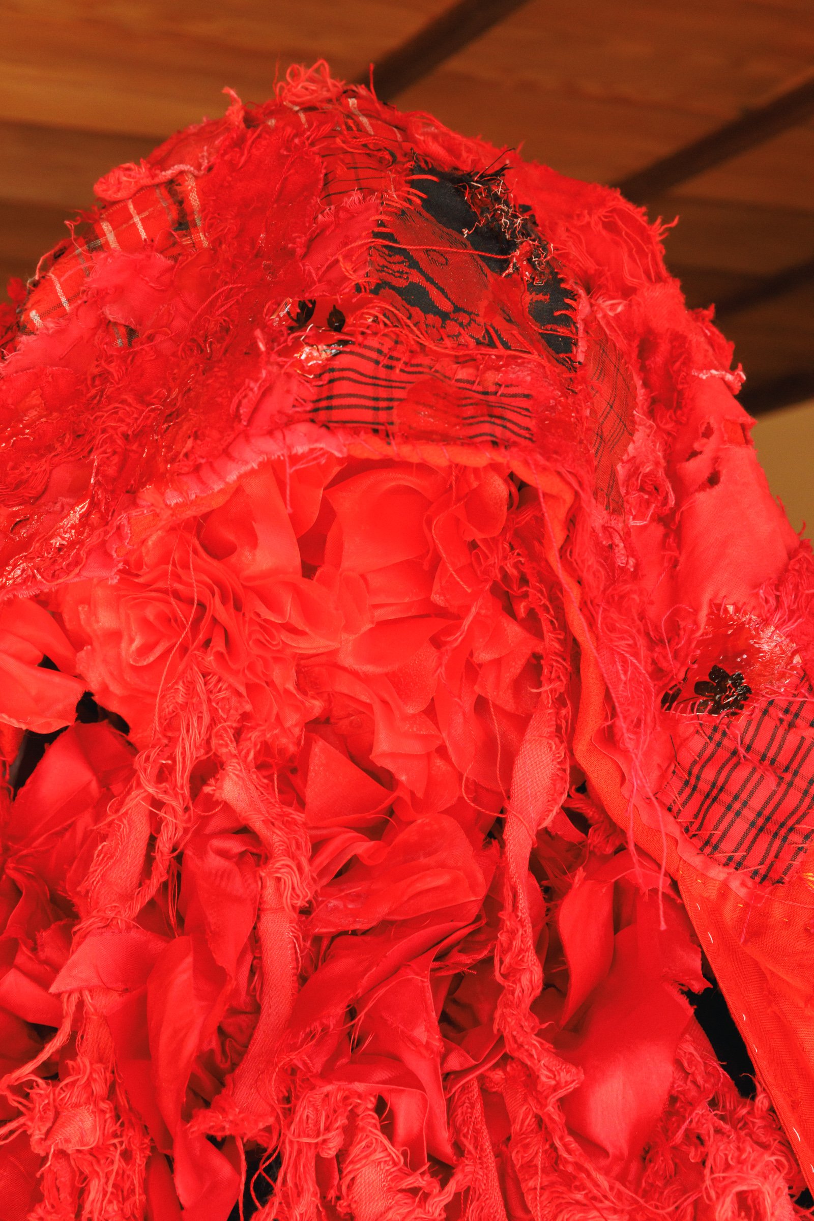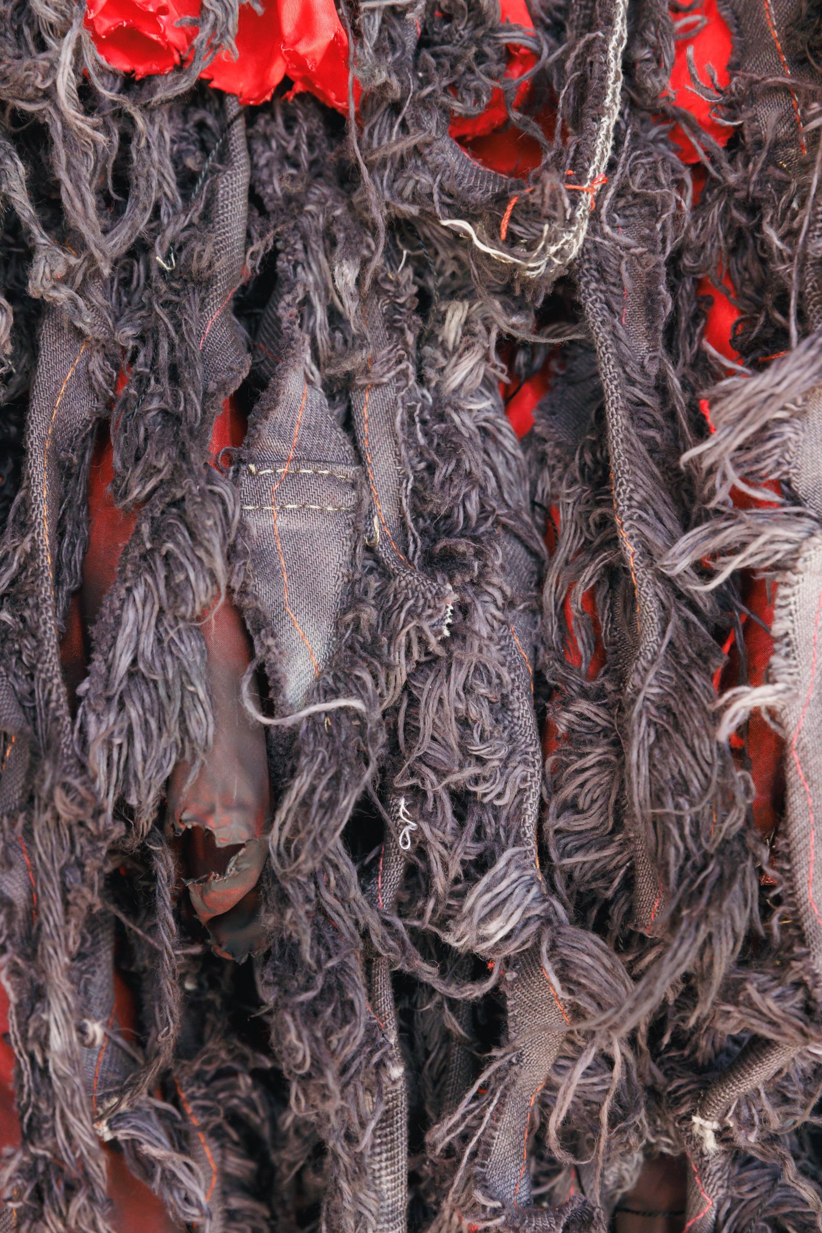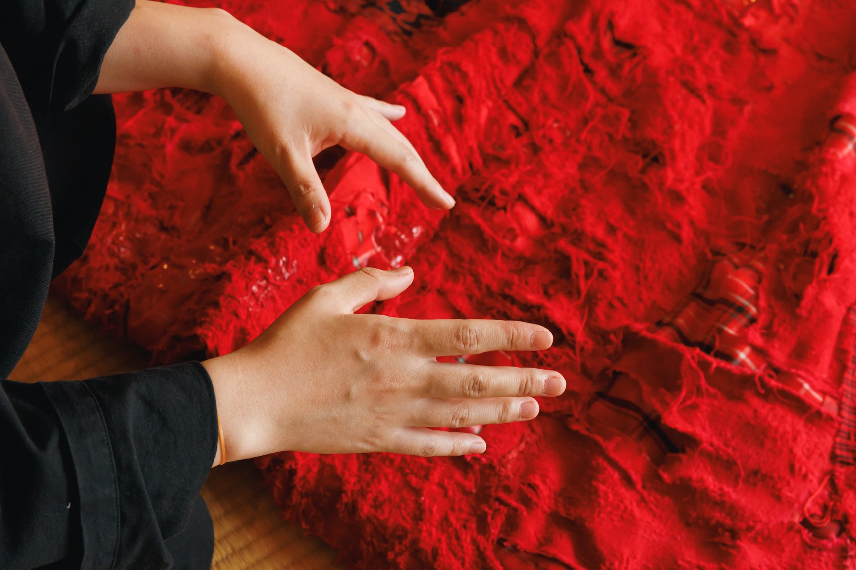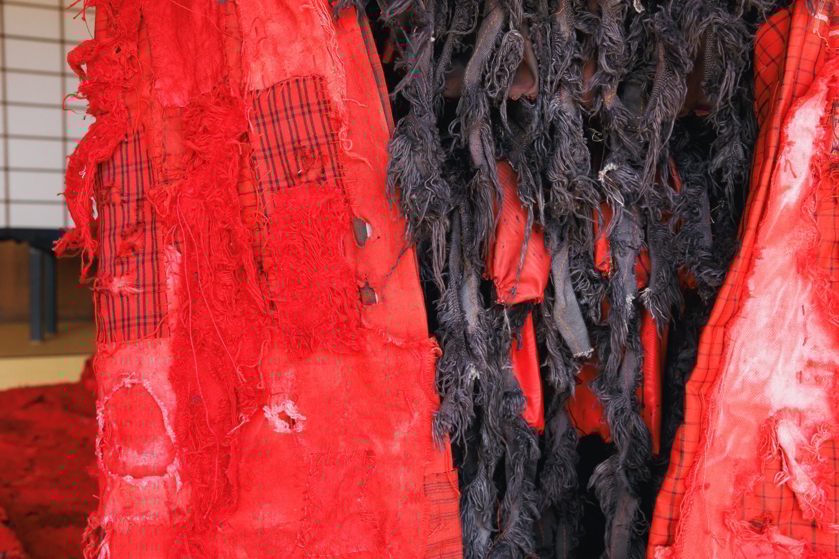 2019年にITSファッション部門のファイナリストに最年少19歳で選出され、現在はアーティストの衣装なども手掛けるデザイナーで美術家の八木華は、デニムと白無垢などの晴れ着の廃材を掛け合わせた「襤褸の晴れ着」を披露。デニム素材を用いた作品制作は、襤褸(ぼろ)を着想源に「ディーゼル(DIESEL)」のデニムを使って制作したITSの課題作品以来、4年ぶりだという。今回は様々な固定概念を壊していくことをテーマに、貧しさの中で生まれた襤褸と正反対存在である晴れ着の素材を使用し、デニムのイメージである青と対照的な赤色にデニムを染め直した。赤色には、白無垢に込められた「花嫁が結婚相手の家に染まる」といった意味に対するアンチテーゼも含まれている。
