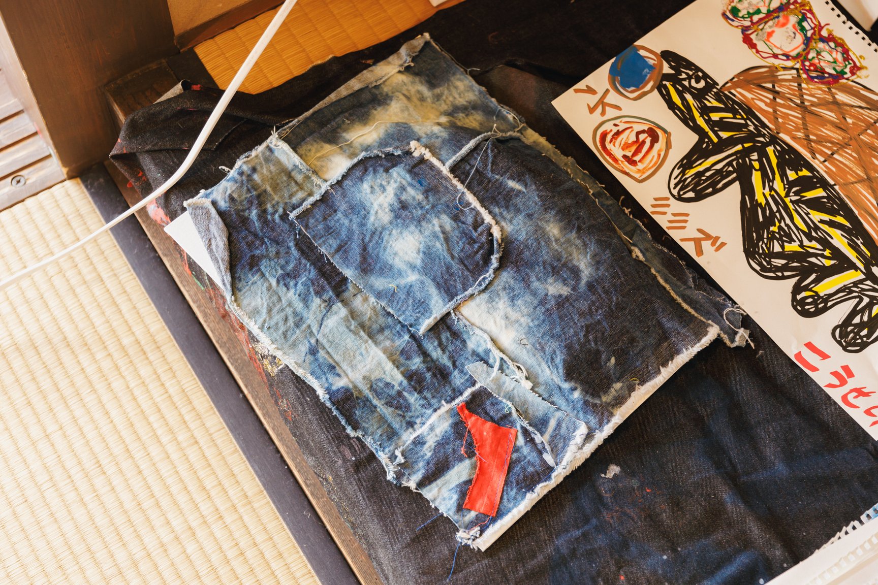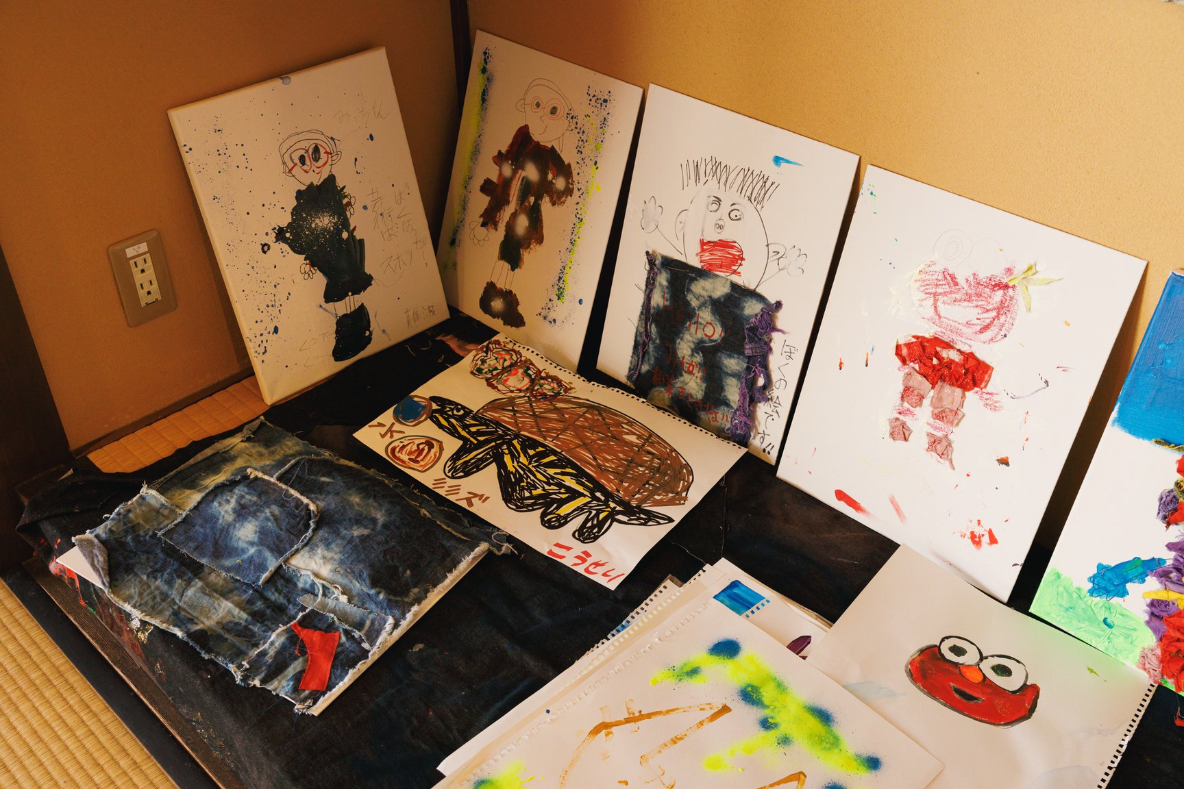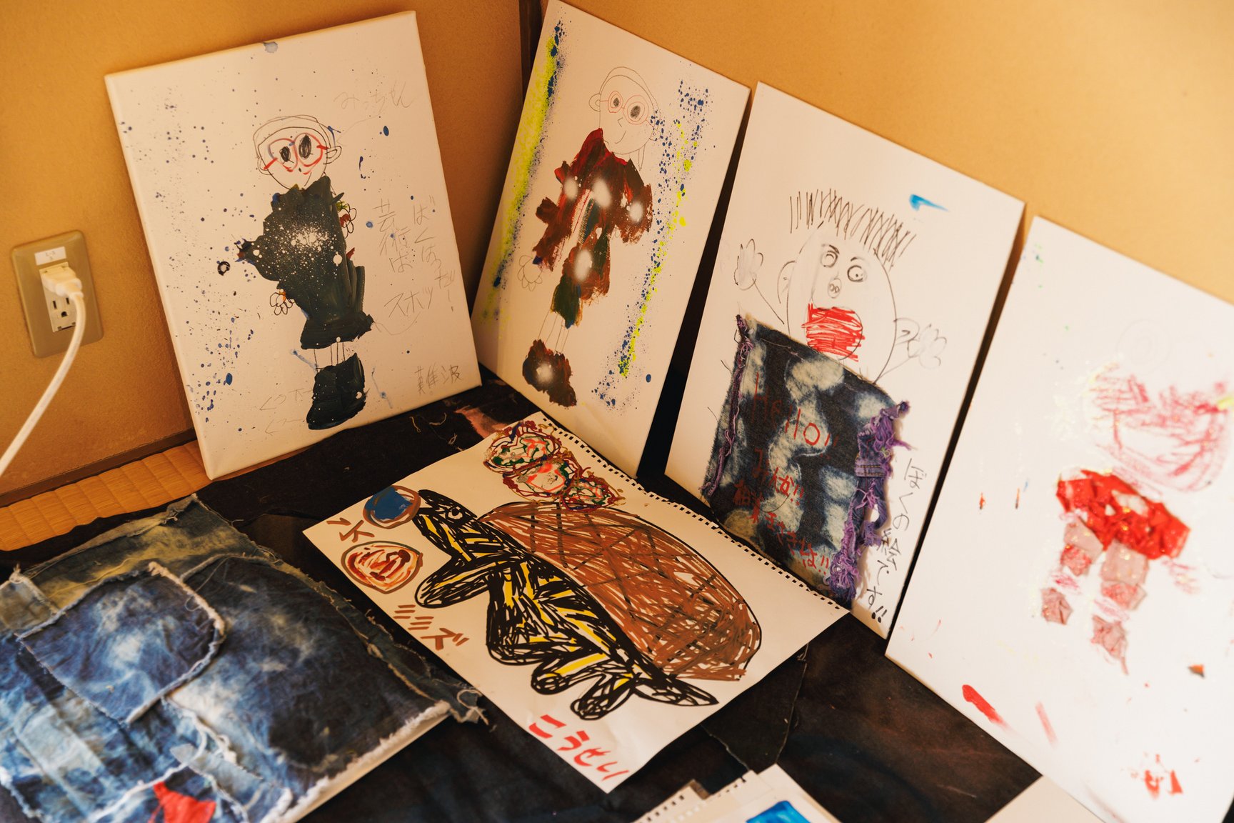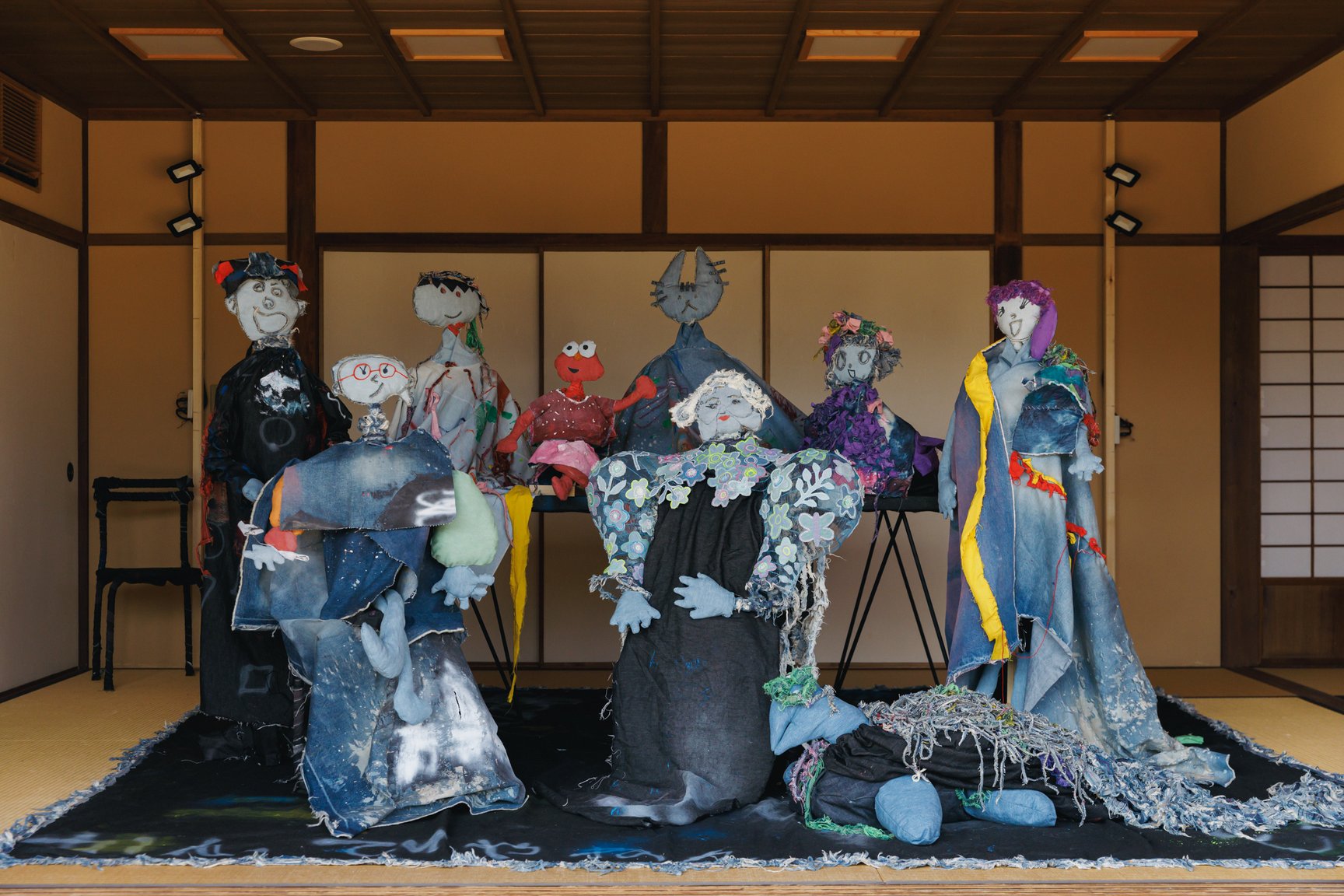 倉敷物語館では、「社会課題×アートの力」をテーマに2人の若手デザイナーと学生が児島のデニム加工会社の廃材を使用して制作した作品を発表。精神科病院の看護師として働きながら作品を制作し、2018年にファッションコンテストITSで日本人唯一のファイナリストに選出された津野青嵐は、畝尾氏が代表を務める、発達に遅れや不安のある子どもたちを対象とした放課後等デイサービス「パントーン・フューチャー・スクール」の子どもたちとワークショップを実施。デイサービスの子どもたちが社会に合わせて自分を抑え込むのではなくクリエイティビティを開放する場を目指したという。子どもたちは「大切な人のためにつくる服」をテーマに、家族や友人、好きなアイドルなど思い思いの相手を考えながらドローイングと服作りを行った。制作の際に床に敷いていたデニムの敷物も含めて、制作時の様子がそのまま再現されている。