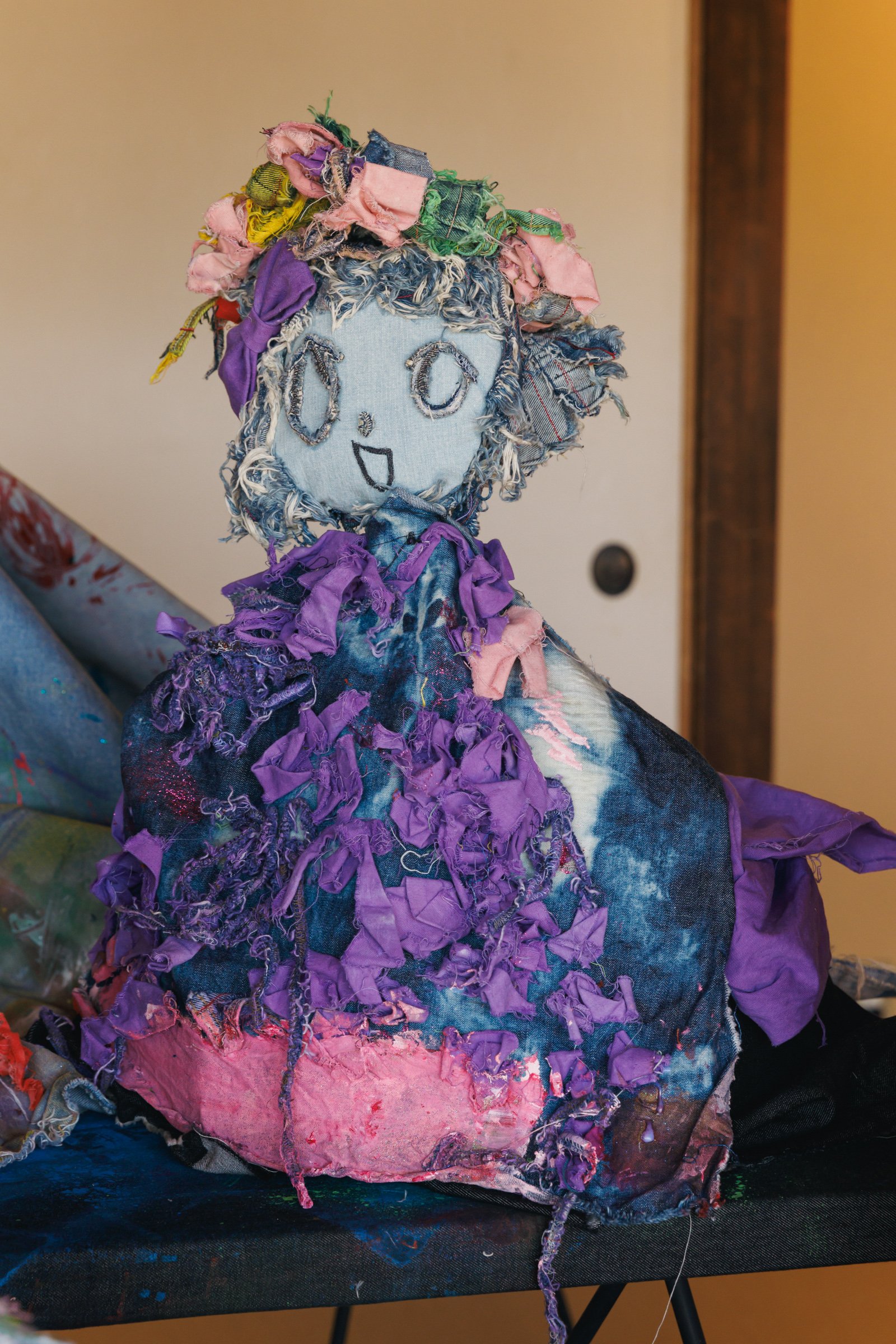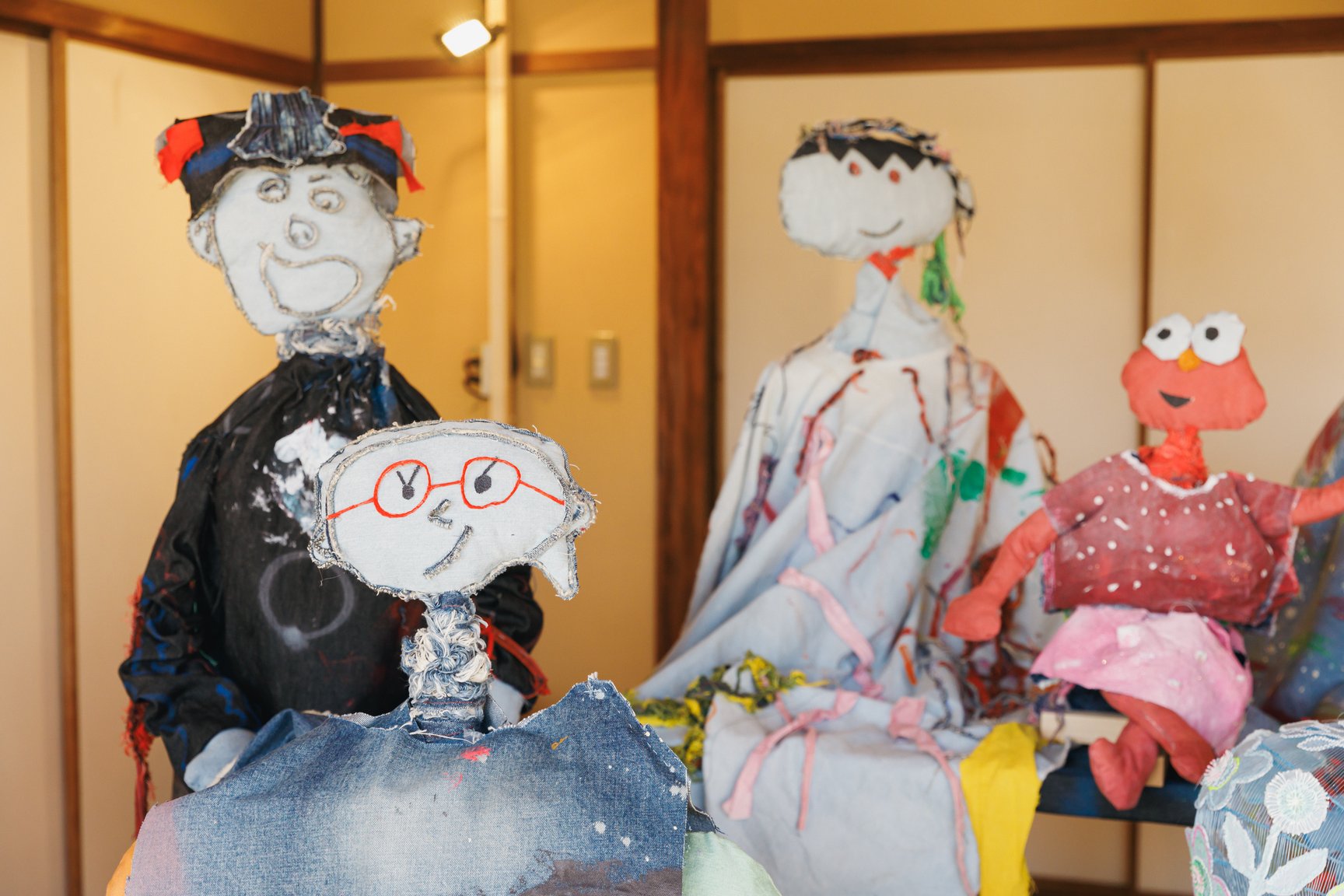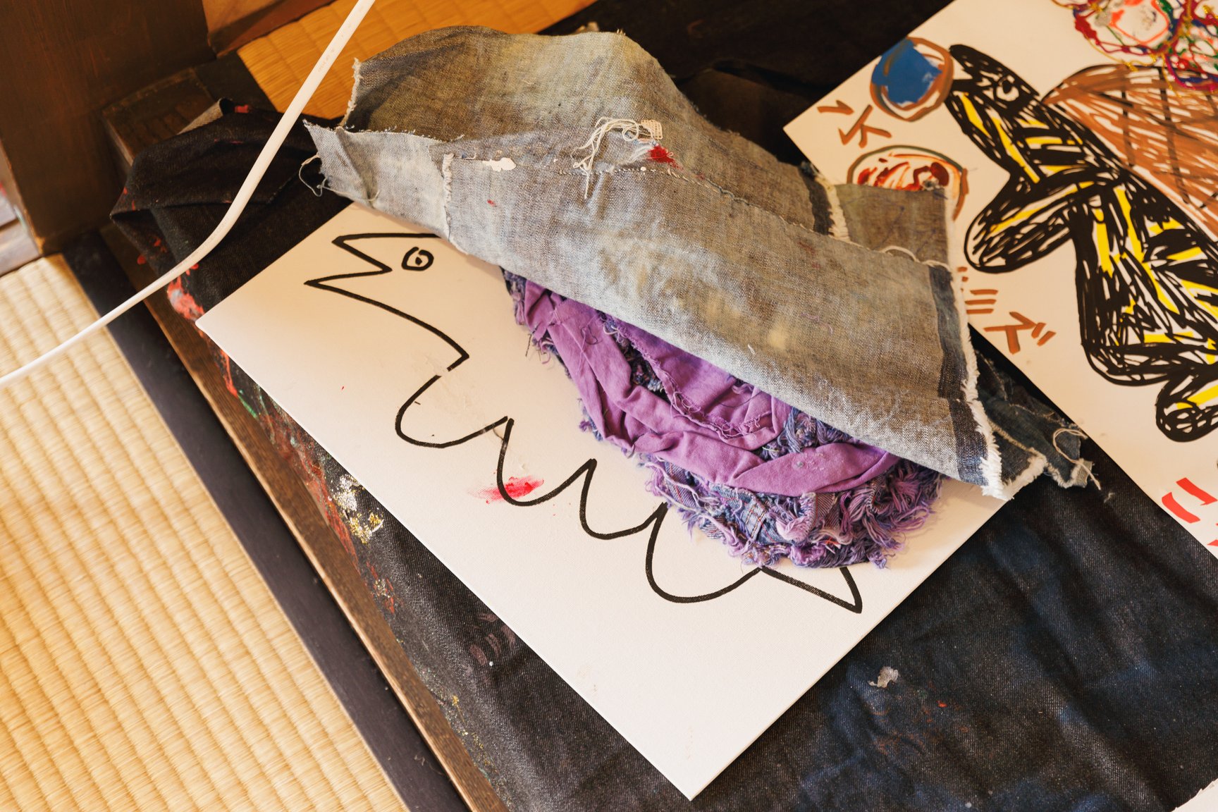 倉敷物語館では、「社会課題×アートの力」をテーマに2人の若手デザイナーと学生が児島のデニム加工会社の廃材を使用して制作した作品を発表。精神科病院の看護師として働きながら作品を制作し、2018年にファッションコンテストITSで日本人唯一のファイナリストに選出された津野青嵐は、畝尾氏が代表を務める、発達に遅れや不安のある子どもたちを対象とした放課後等デイサービス「パントーン・フューチャー・スクール」の子どもたちとワークショップを実施。デイサービスの子どもたちが社会に合わせて自分を抑え込むのではなくクリエイティビティを開放する場を目指したという。子どもたちは「大切な人のためにつくる服」をテーマに、家族や友人、好きなアイドルなど思い思いの相手を考えながらドローイングと服作りを行った。制作の際に床に敷いていたデニムの敷物も含めて、制作時の様子がそのまま再現されている。