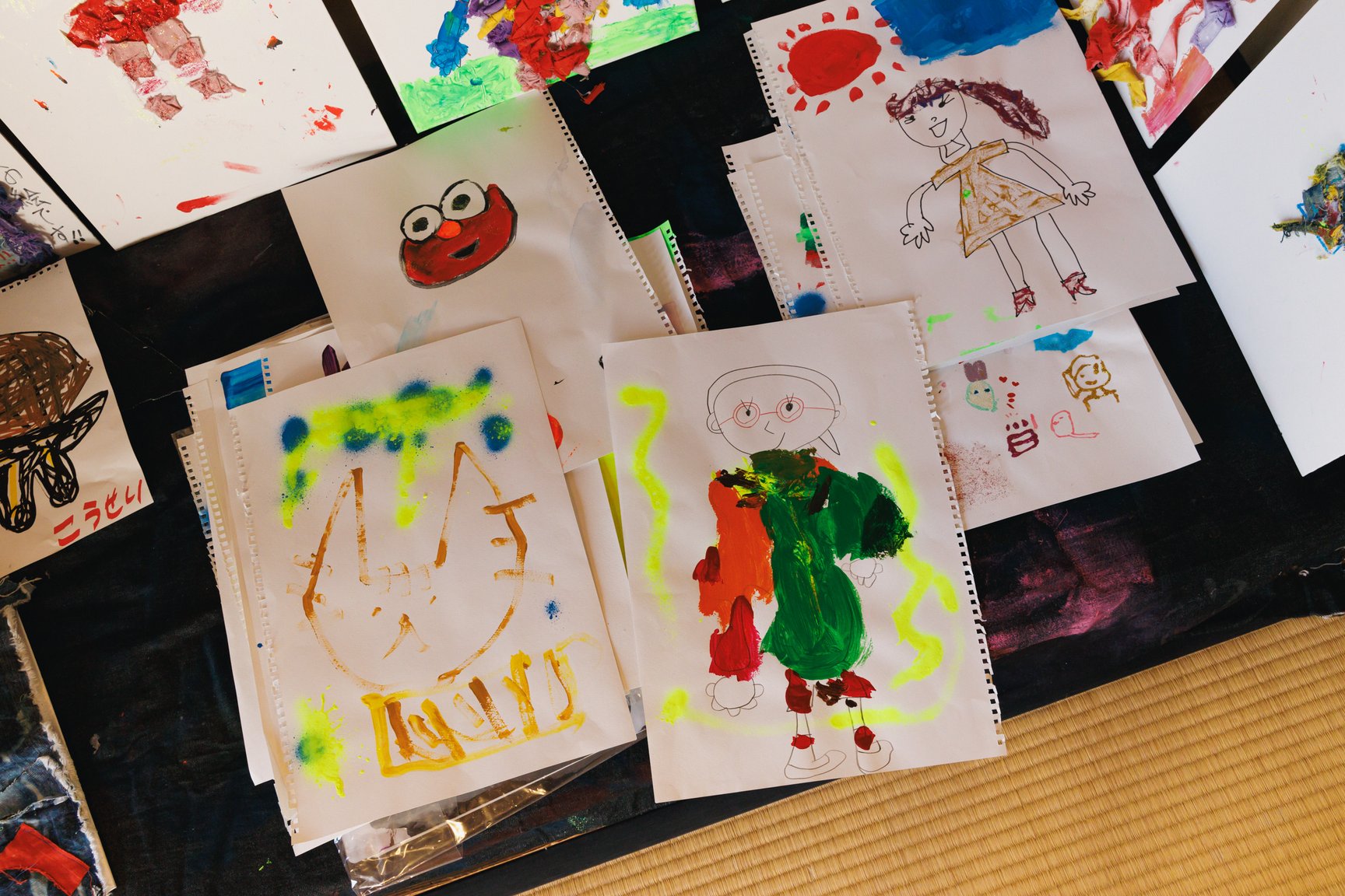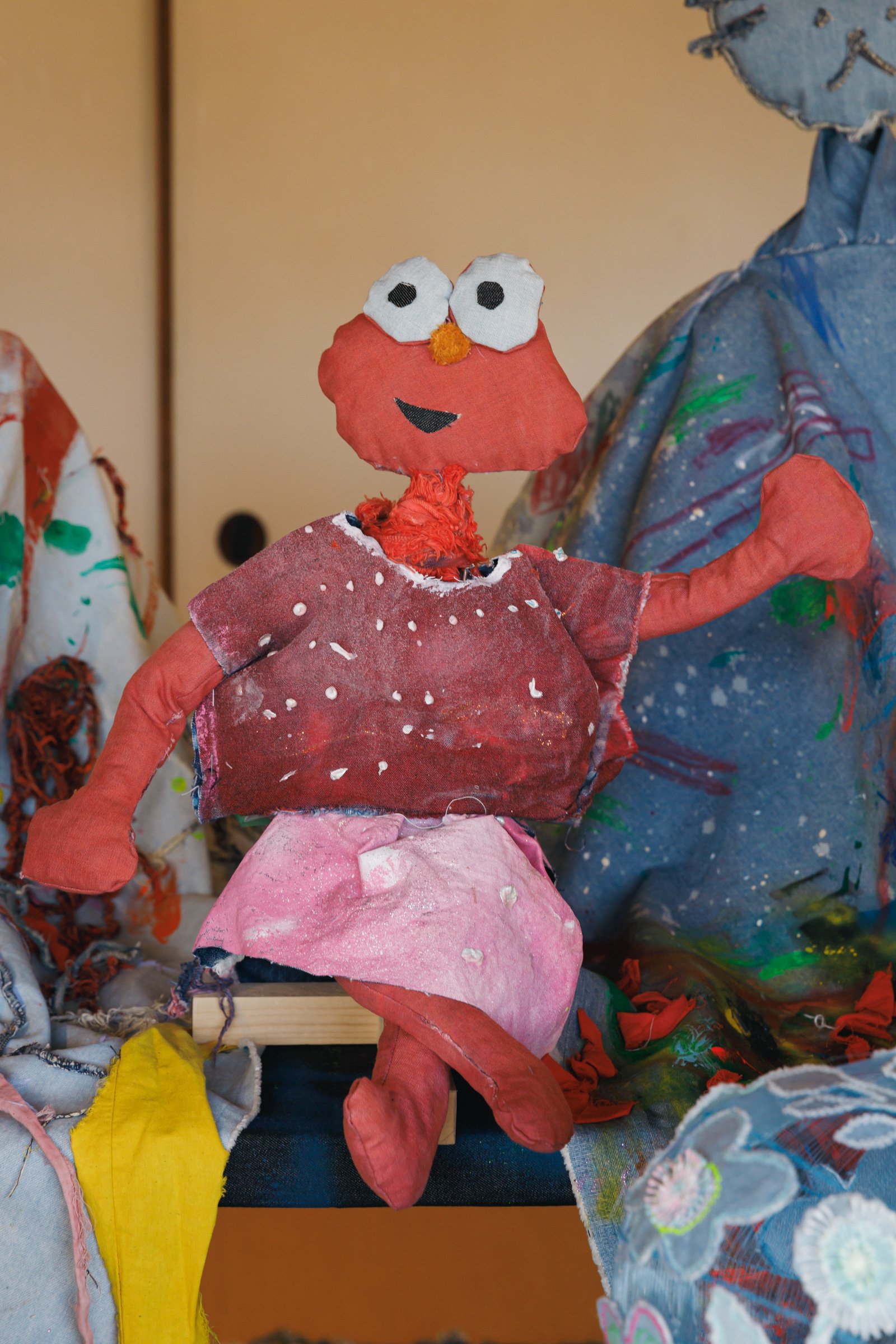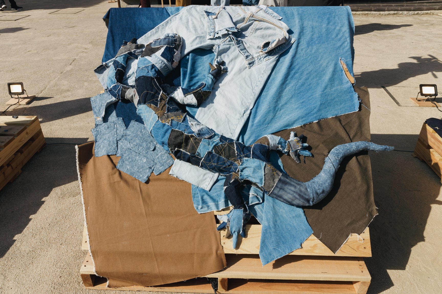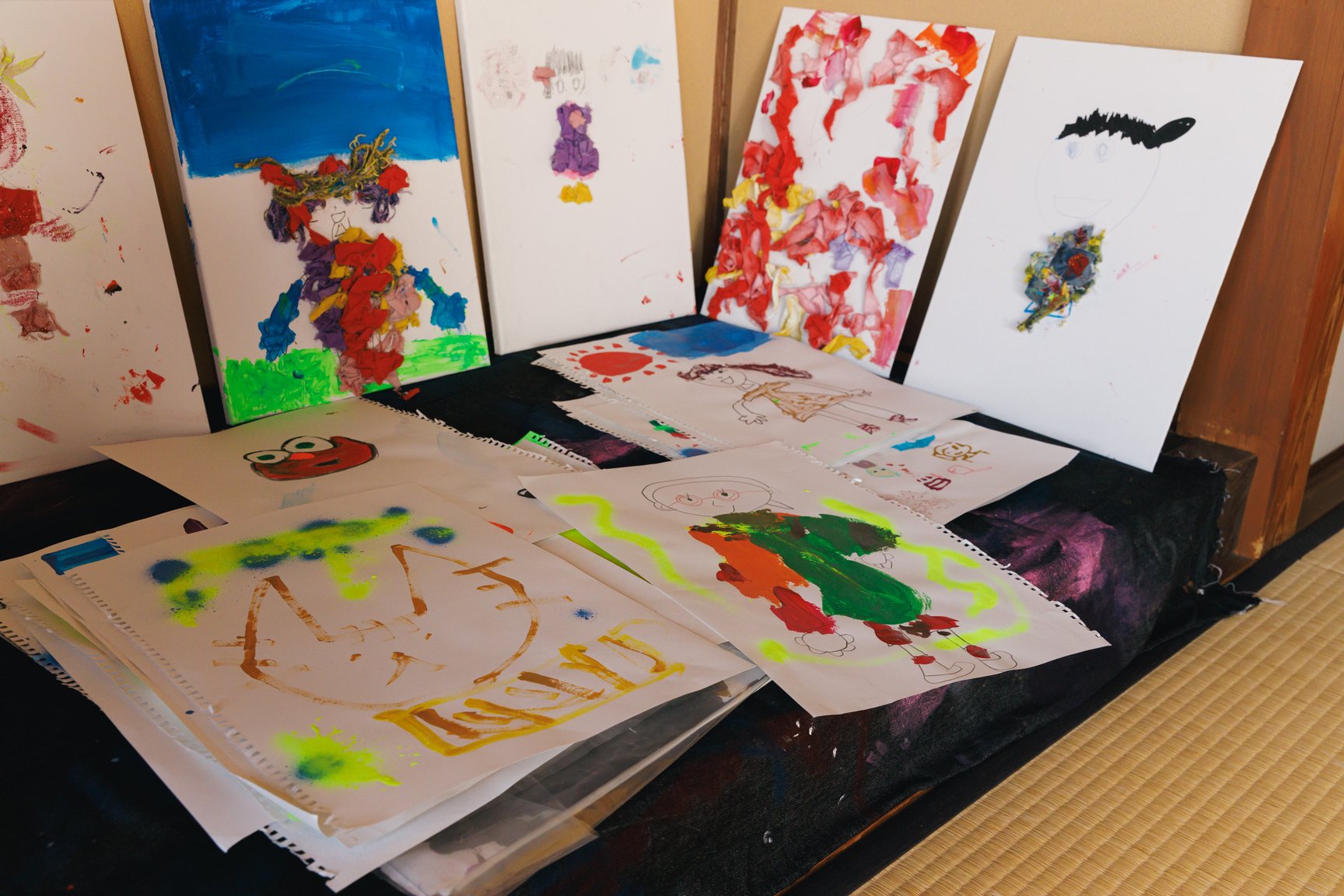 倉敷物語館では、「社会課題×アートの力」をテーマに2人の若手デザイナーと学生が児島のデニム加工会社の廃材を使用して制作した作品を発表。精神科病院の看護師として働きながら作品を制作し、2018年にファッションコンテストITSで日本人唯一のファイナリストに選出された津野青嵐は、畝尾氏が代表を務める、発達に遅れや不安のある子どもたちを対象とした放課後等デイサービス「パントーン・フューチャー・スクール」の子どもたちとワークショップを実施。デイサービスの子どもたちが社会に合わせて自分を抑え込むのではなくクリエイティビティを開放する場を目指したという。子どもたちは「大切な人のためにつくる服」をテーマに、家族や友人、好きなアイドルなど思い思いの相手を考えながらドローイングと服作りを行った。制作の際に床に敷いていたデニムの敷物も含めて、制作時の様子がそのまま再現されている。
