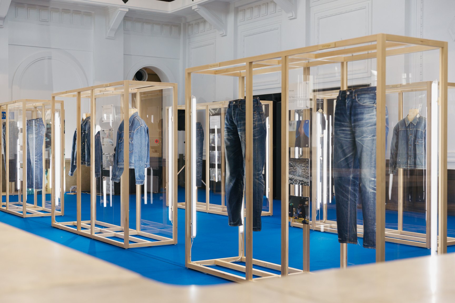 展示は大きく4つのカテゴリーに分けて展開。児島虎次郎記念館では、原宿の老舗古着屋「ベルベルジン(BerBerJin)」のディレクター藤原裕の総額1500を超える私物の「リーバイス(Levi’s®)」のヴィンテージデニムのコレクションと、そのヴィンテージの風合いを癒toRi18の職人が忠実に再現したリプロダクト品を紹介するほか、ヴィンテージデニム好きとしても知られる三代目J SOUL BROTHERSの今市隆二のコレクションも並ぶ。