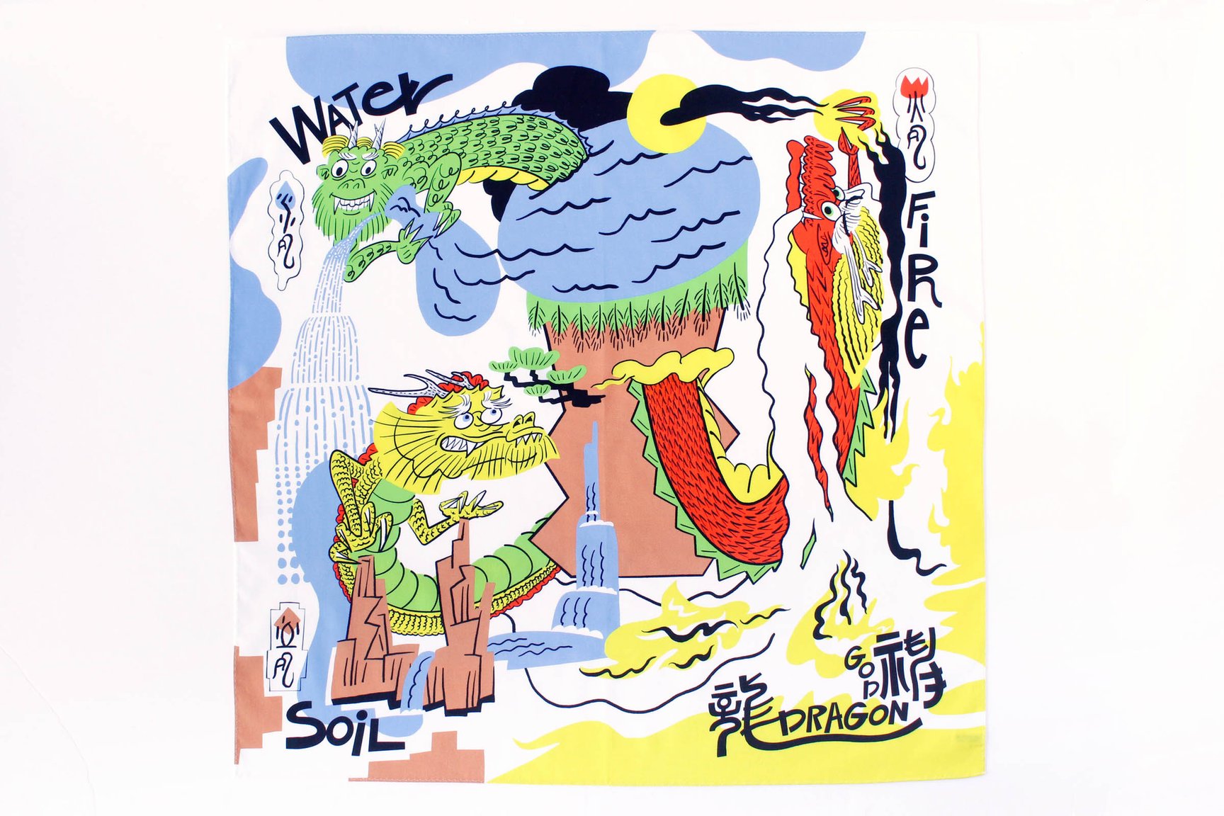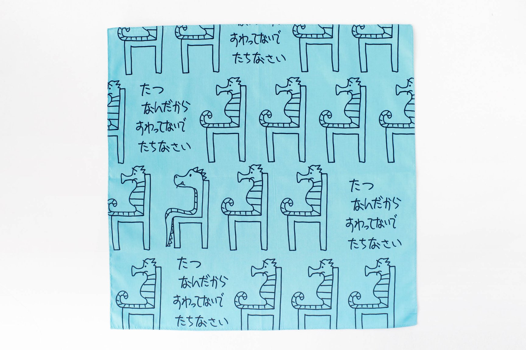 加賀美によるデザインの「たちなさいハンカチ」は、ブルーの生地に加賀美が描き下ろしたイラストと文字をプリント。椅子に座るタツノオトシゴに紛れて龍が描かれ、「たつなんだからすわってないでたちなさい」という加賀美の手書き文字が加えられている。安藤は、自然を龍になぞらえてイラストを制作。ポップな色使いで仕上げた。いずれも、ハリのあるコットン100%の生地を使用している。