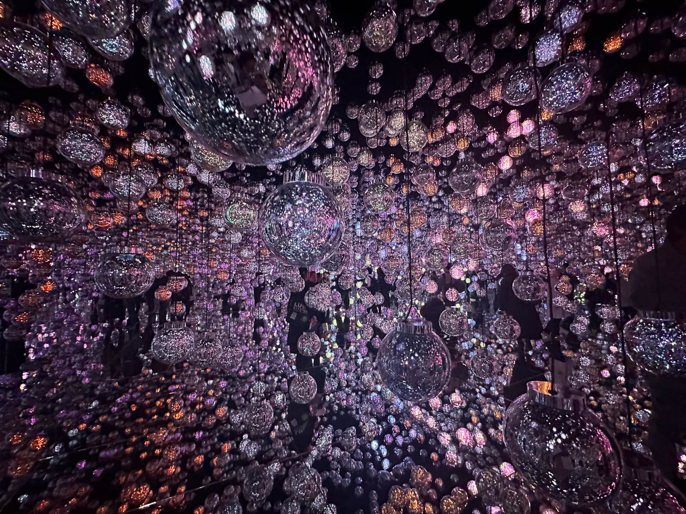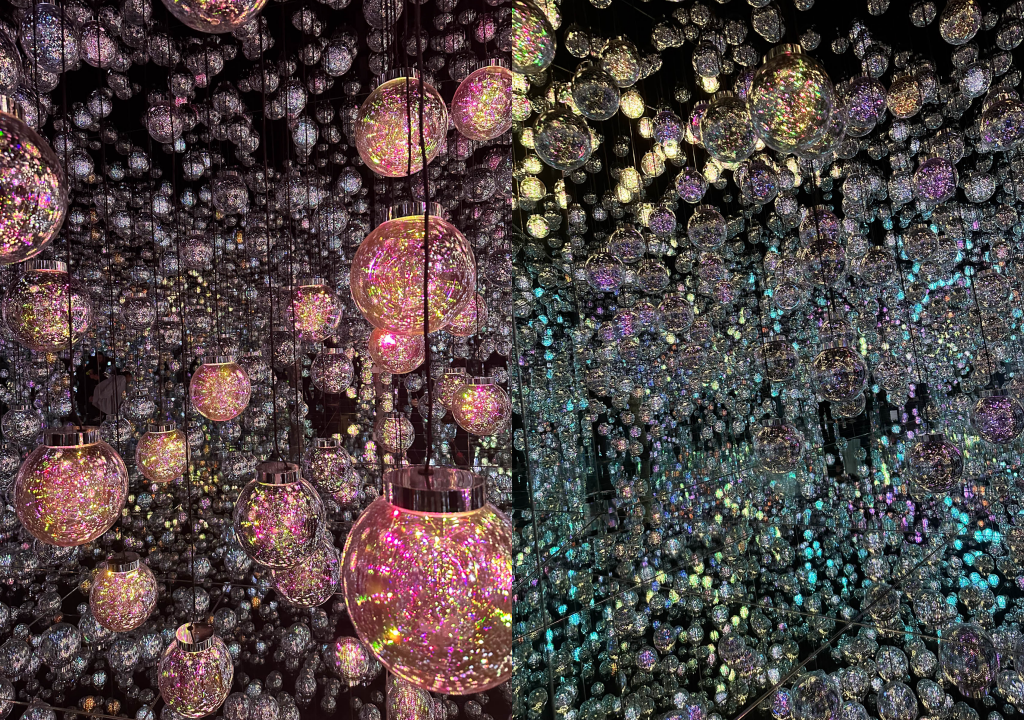 新作の「Bubble Universe」は、チームラボの新たなアートプロジェクト「認知上の存在」をテーマにしたインタラクティブアート。全面が鏡張りになった空間に、無数の球体が吊り下げられ、球体の間を歩きながら作品空間を鑑賞する。同作では、「認知と存在」について、「人間が世界をどのように見ているのか」についてを模索し、現象とは環境との連続的な関係性の中に存在することを表現しているという。