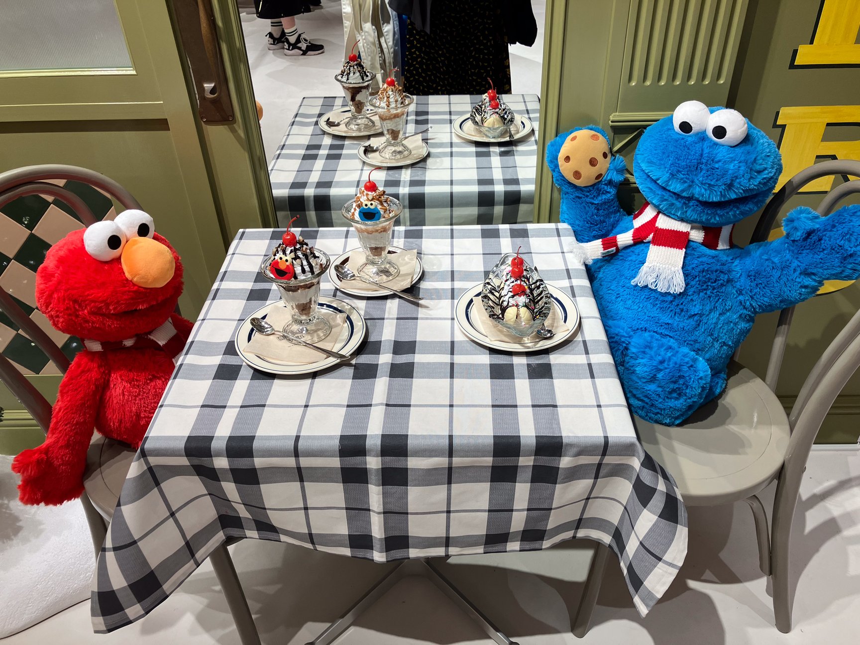 店舗面積は約330平方メートル。セサミストリートの世界観を表現した店内は、物販コーナーとカフェコーナーで構成している。店内外には、エルモをはじめとしたキャラクターたちの等身大フィギュアや、キャラクターたちの毛や羽の素材感を再現したライト、壁や什器に施されたアートワーク、テーブルでサンデーを食べるエルモとクッキーモンスターなど、作品の世界観や遊び心を随所に散りばめたほか、ホリデーシーズンに合わせて、クリスマスツリーやクリスマスデコレーション、ストライプのマフラーを巻いたキャラクターのぬいぐるみたちなど、店内のいたるところでホリデームードを感じられる仕様となっている。