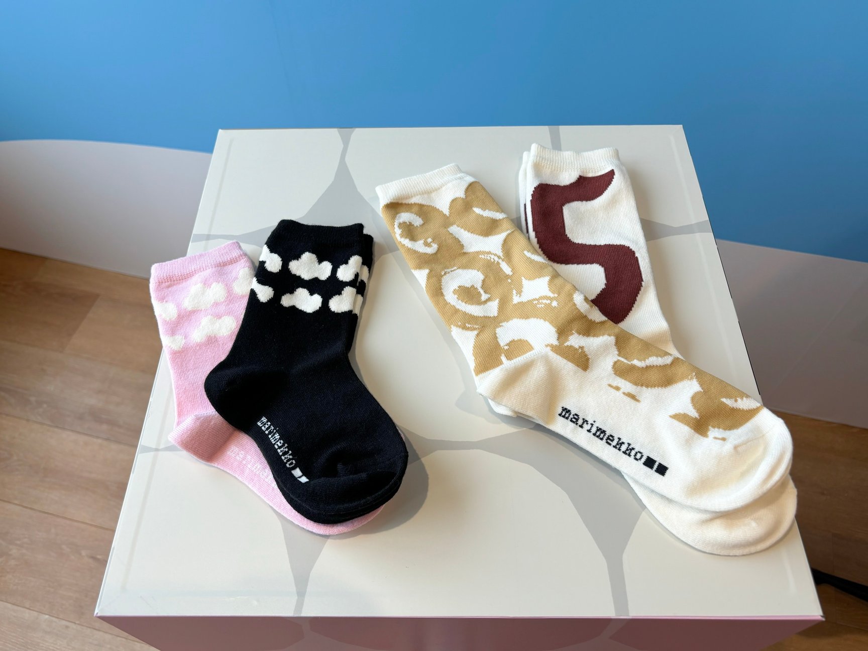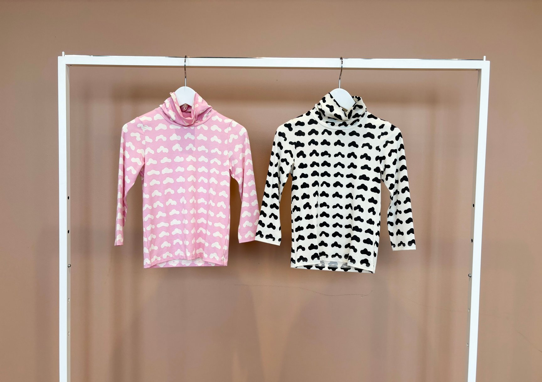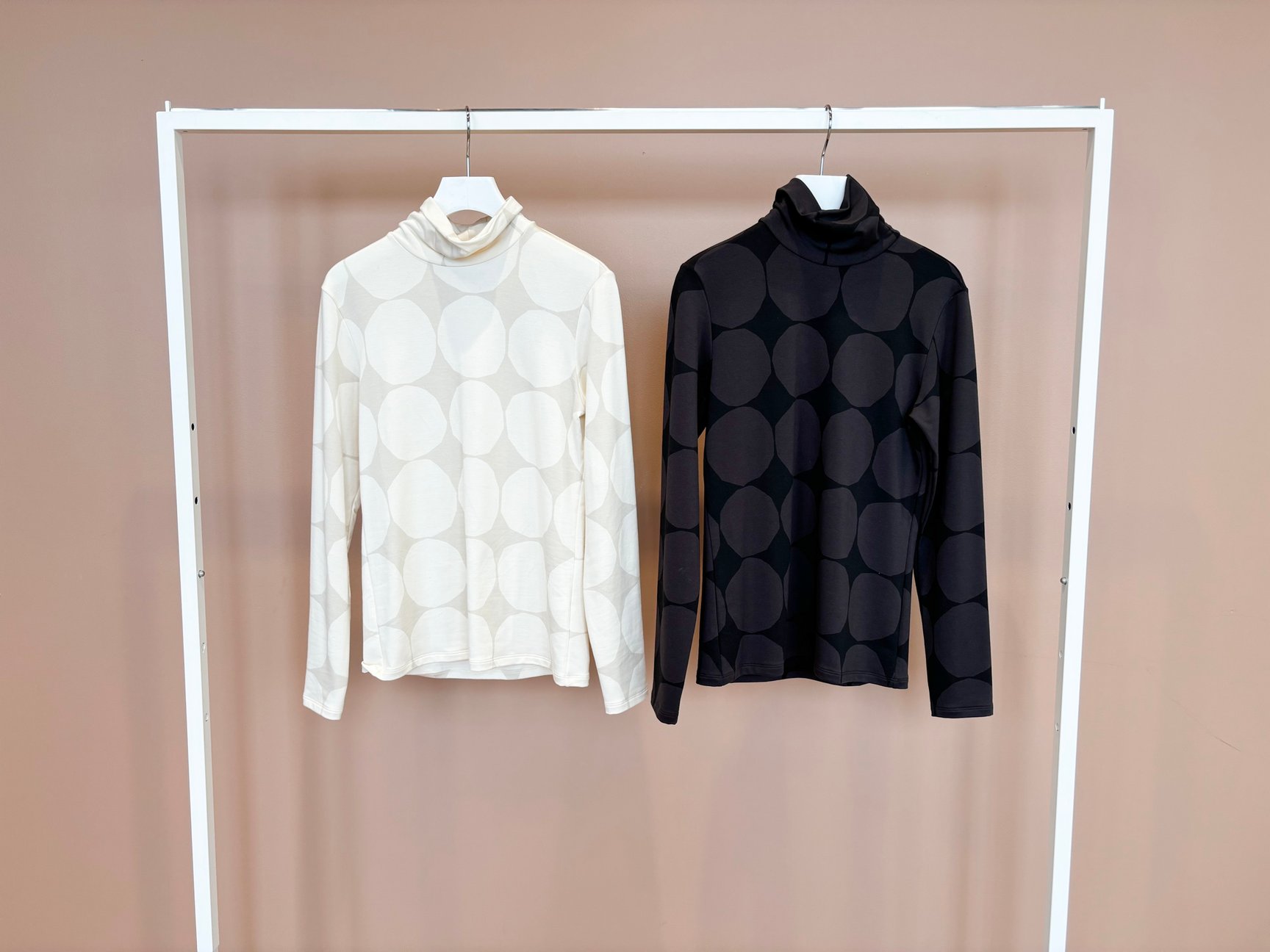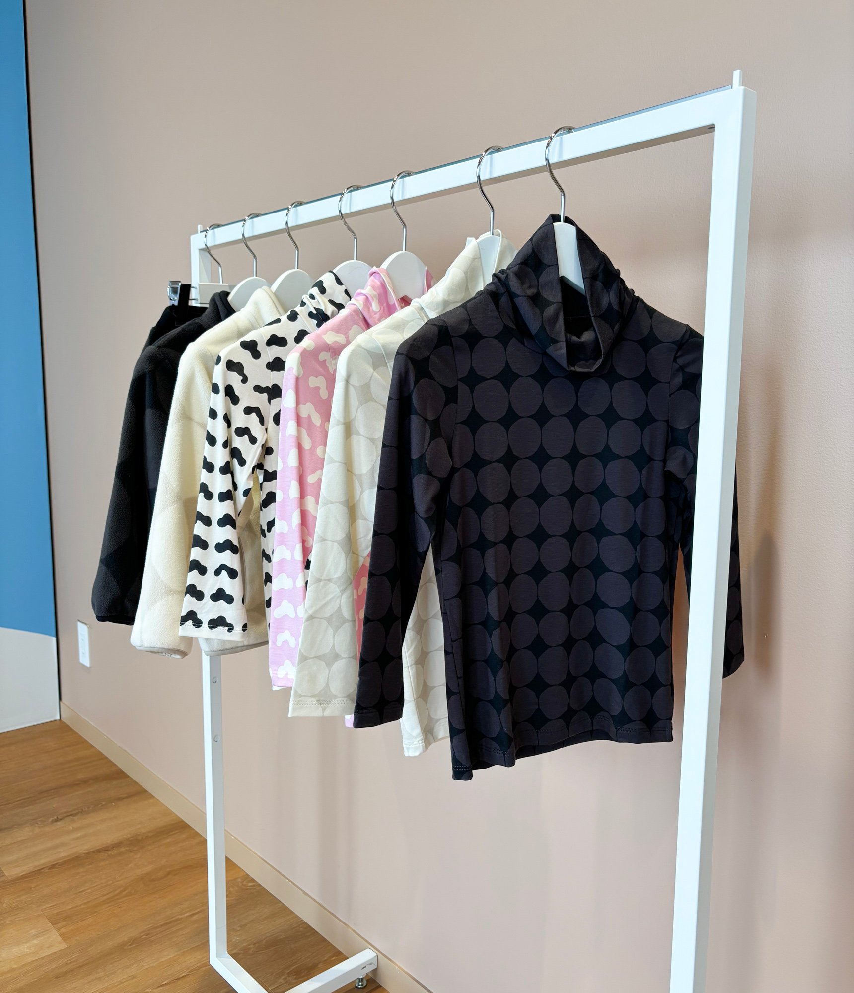 キッズでは、キヴェット柄のフリースフルジップジャケット(2色、1990)やフリースミニスカート(2色、1990)に加えて、綿菓子・雲を表現した「ハッタラ(Hattaraa)」とキヴェットの2柄を採用したヒートネックタートルネックT(各2色、990)、ヒートテックソックス(2色セット、790/全て税込)を揃える。