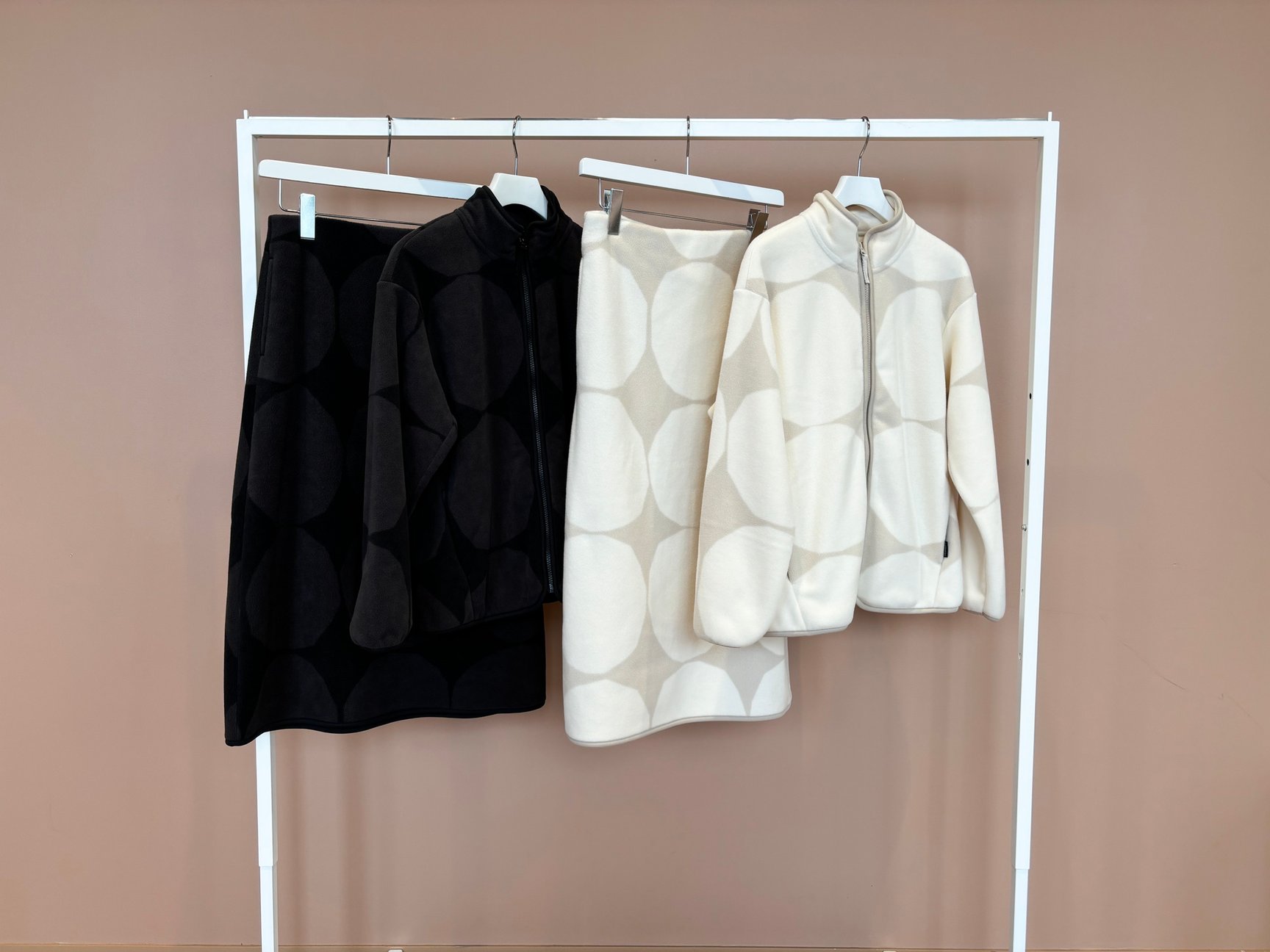 4度目となるユニクロとマリメッコのコラボコレクションでは、マリメッコを代表するデザイナー マイヤ・イソラ(Maija Isola)とペンッティ・リンタ(Penti Rinta)による人気の4柄をあしらったウィメンズ5型、キッズ4型を展開。ウィメンズでは、石から着想を得た「キヴェット(Kivet)」とモリフクロウを表現した「キッサプッル(Kissapollo)」の2柄を落とし込んだフリースフルジップジャケット(各2色、2990)やフリーススカート(各2色、3990)、ヒートテックタートルネックT(各2色、1990)のほか、キッサプッルとギリシャ神話に登場する海の怪物にちなんだ「セイレーニ(Seireeni)」の2柄を採用したヒートテックソックス(キッサポッロ2色、セイリーニ3色、590)をラインナップする。