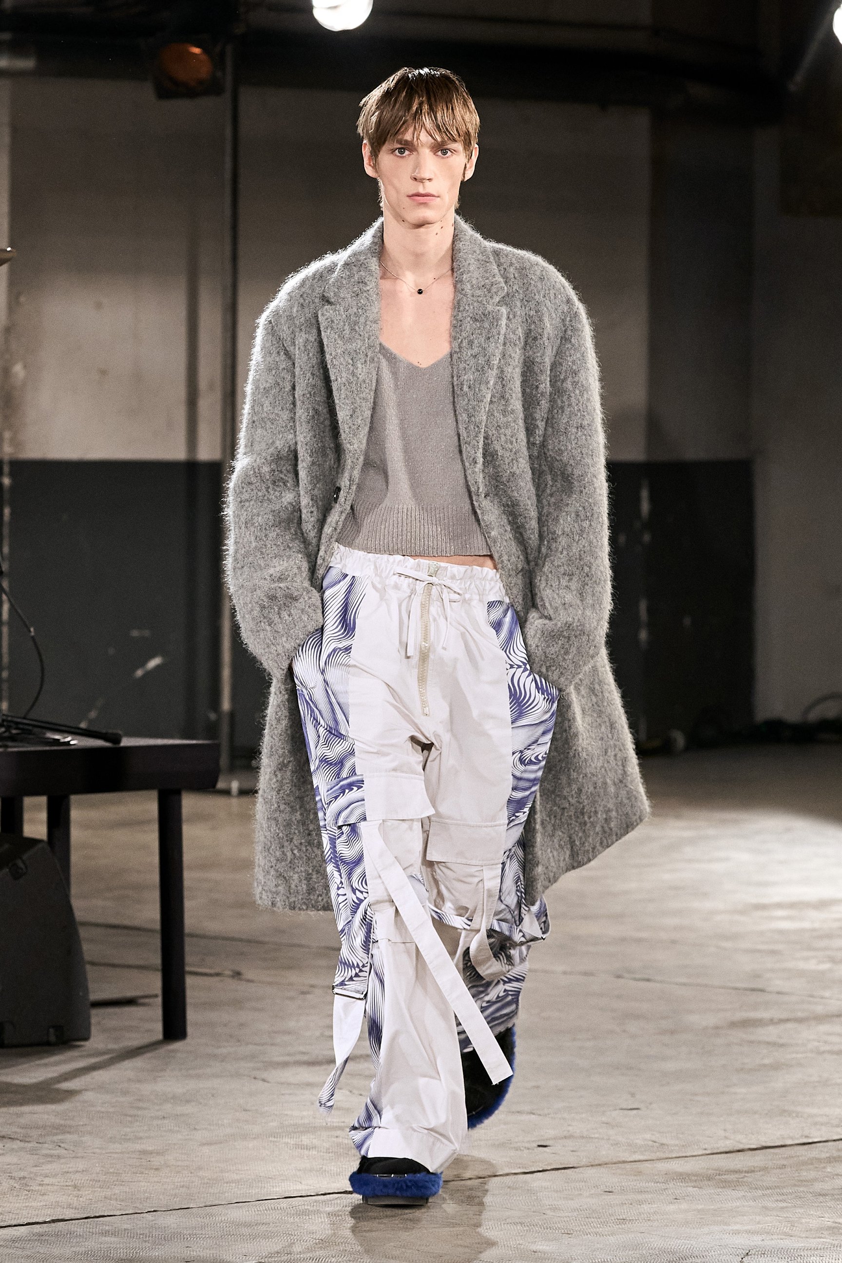 コレクション全体は丁寧なテーラリングが中心となっていたが、カーゴパンツやマルチポケット・アウター、オーバーサイズのパファージャケットといったカジュアルなアイテムも印象的。波打つようなサイケデリック・パターンも取り入れられ、レイヴ・カルチャーの影響を感じさせた。
