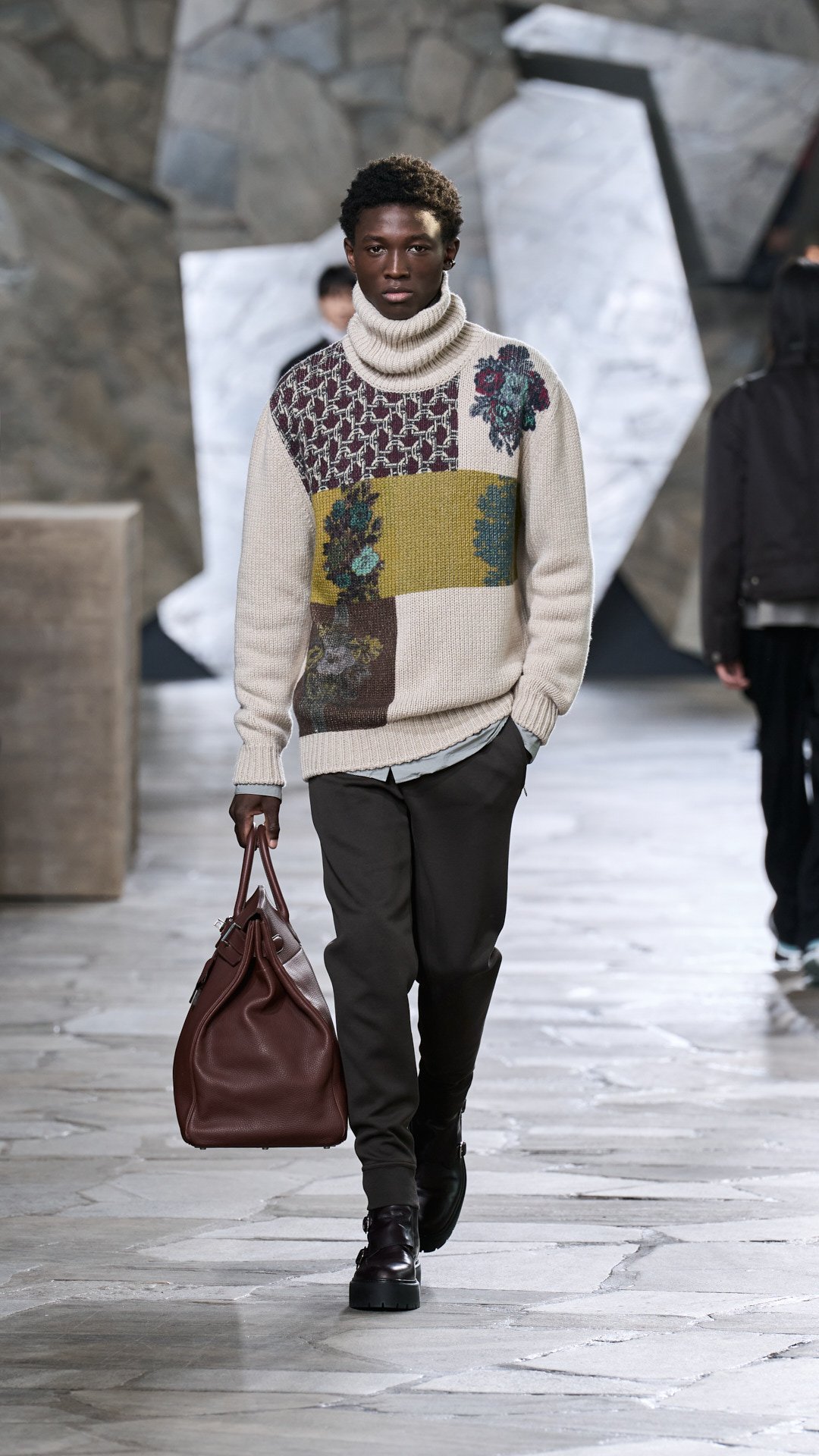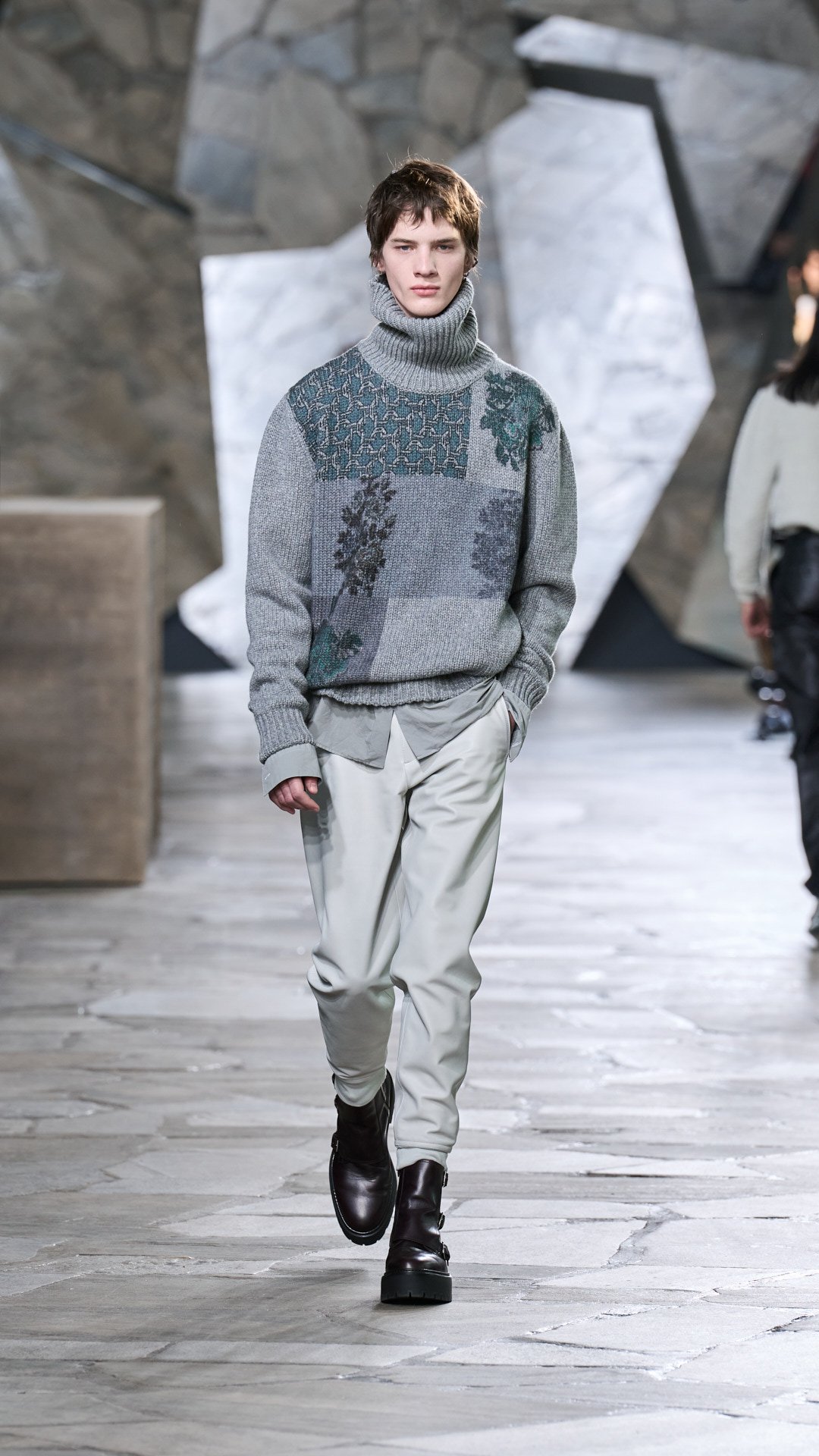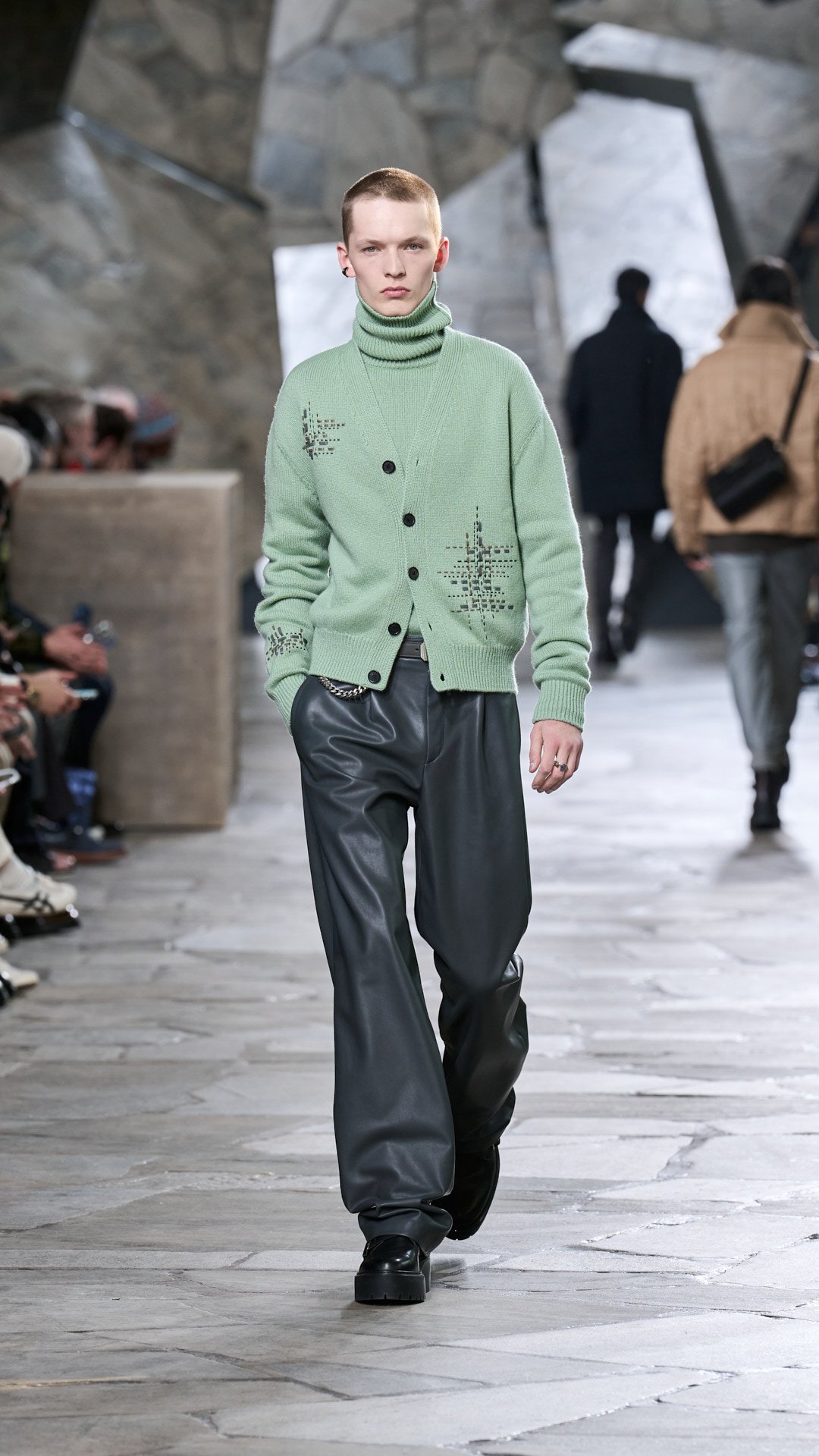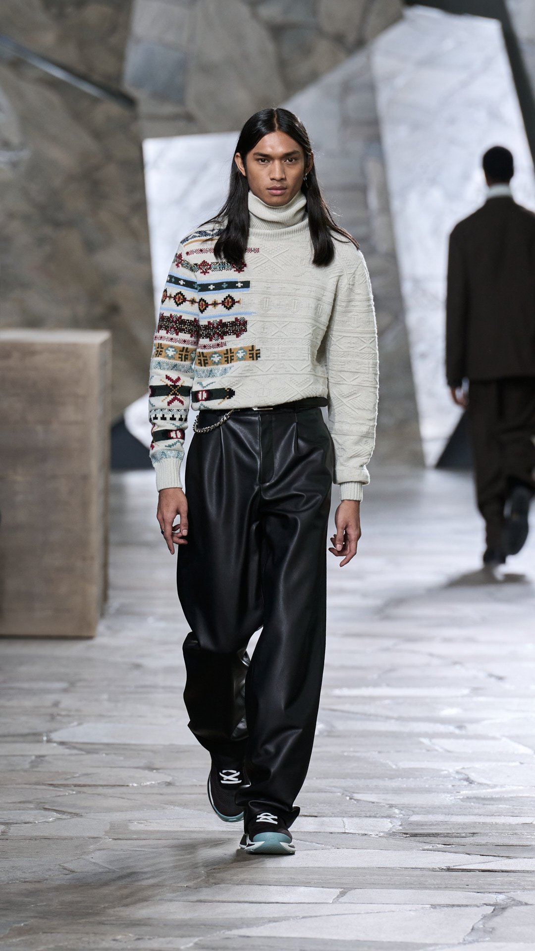 カシミアのプルオーバーやカーディガン、ダッフルコート、ウールフランネルのパンツなど、思わず肌触りを確かめてみたくなるようなウィンターアイテムが多数登場。ところどころにあしらわれた模様はレザーを編み込むことで形作られており、巧みな職人技を感じさせる。部分的に色を取り入れたアイリッシュニットなど、ホリデーシーズンにもぴったりな遊び心のあるディテールが目を引いた。