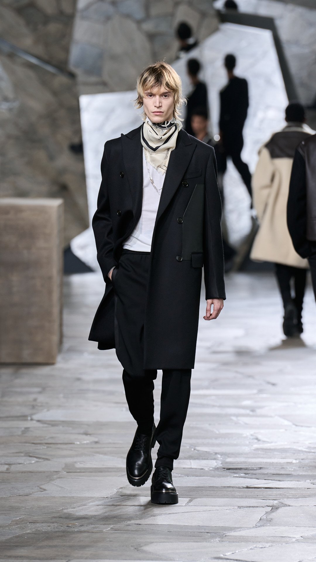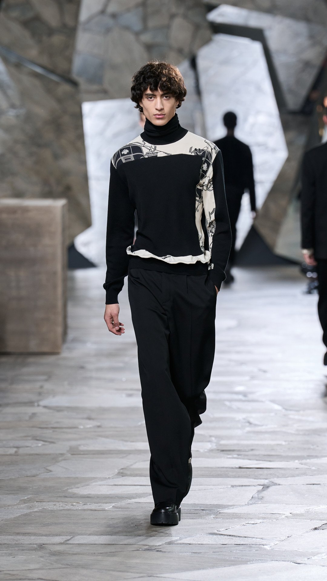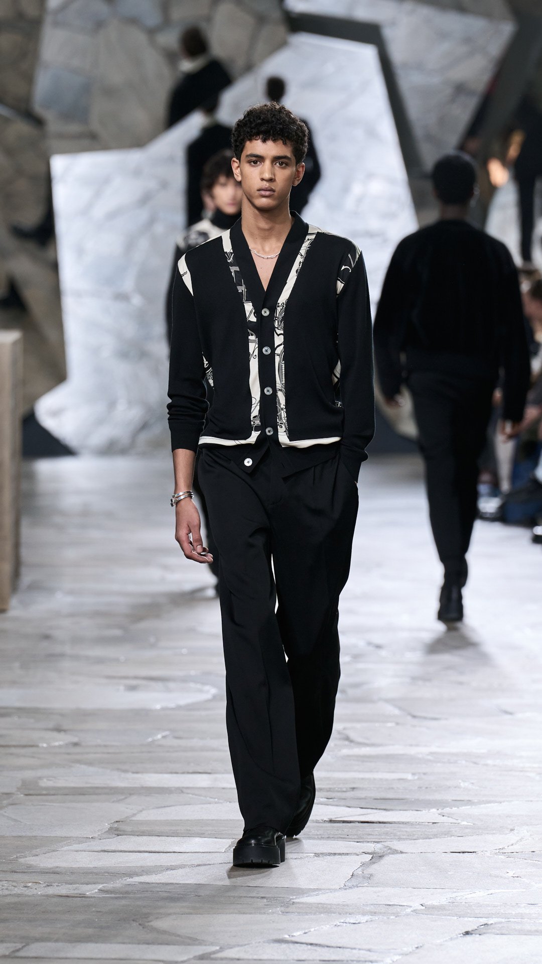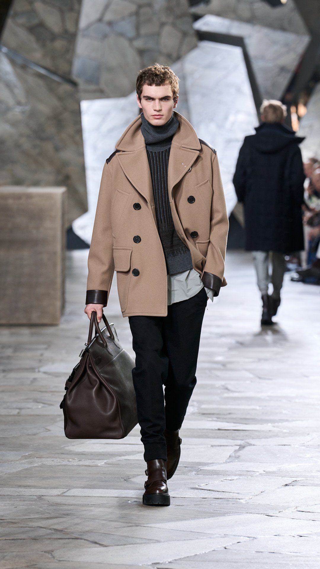 カシミアのプルオーバーやカーディガン、ダッフルコート、ウールフランネルのパンツなど、思わず肌触りを確かめてみたくなるようなウィンターアイテムが多数登場。ところどころにあしらわれた模様はレザーを編み込むことで形作られており、巧みな職人技を感じさせる。部分的に色を取り入れたアイリッシュニットなど、ホリデーシーズンにもぴったりな遊び心のあるディテールが目を引いた。