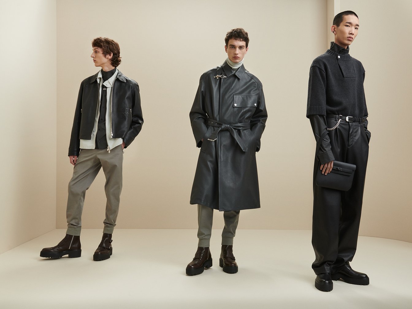 チャコールやキャメルを中心としたレザーアイテムのバリエーションは贅沢そのもの。なめらかな革の質感が洗練された雰囲気を醸し出す。また、モンクストラップブーツや、パラジウムで仕上げたメタルのディテールが艶やかなイブニング・ダービーなど、エレガントなシューズデザインも視線を集めた。
