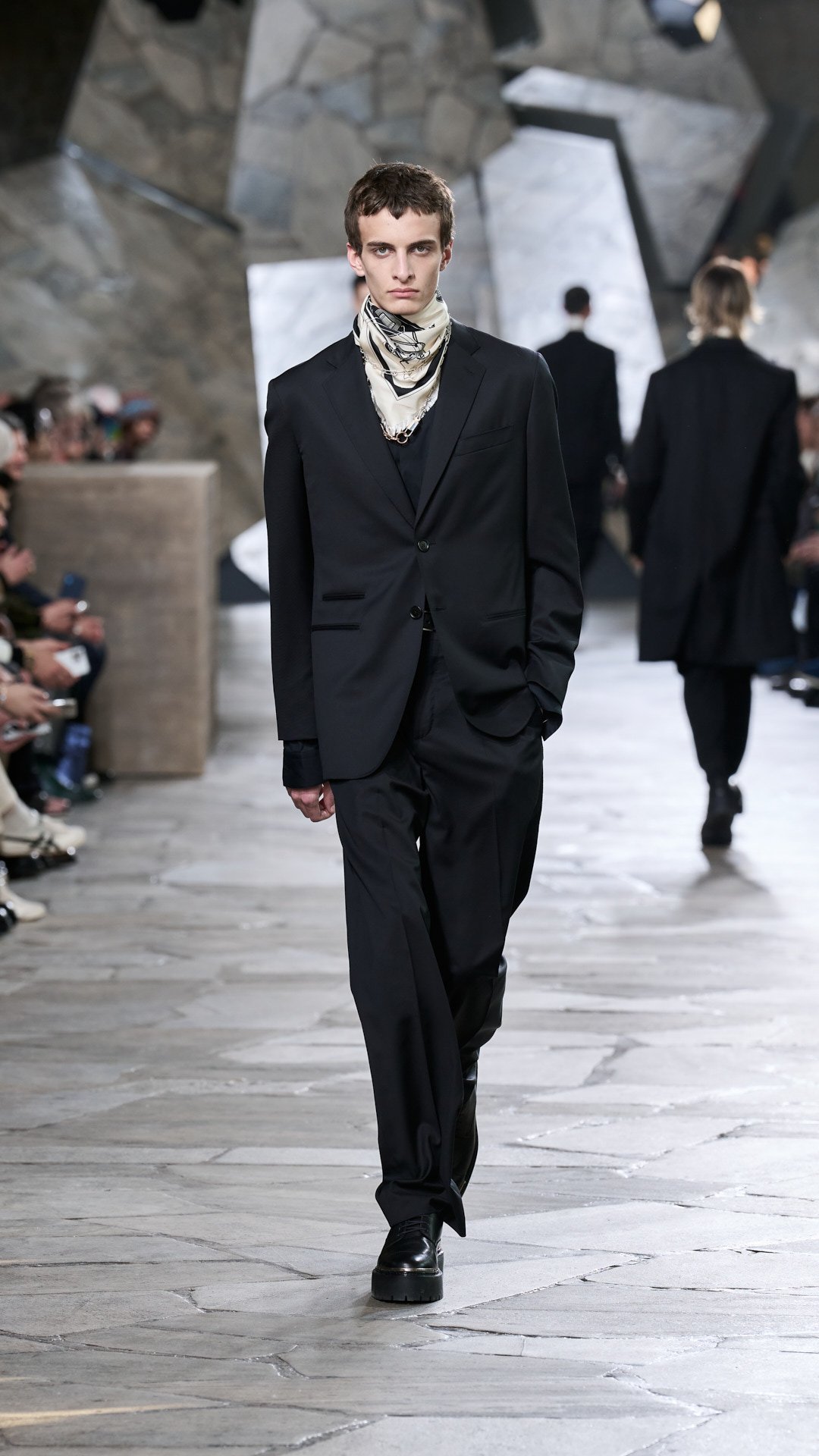 今回のキーワードとなったのは「動きのコントラスト」。男性たちが歩くときに自由さや開放感を感じるような、プレイフルなワードローブを提案する。異なる要素を組み合わせたり、ボリュームや長さで変化をつけることでプロポーションを大胆にアレンジした。