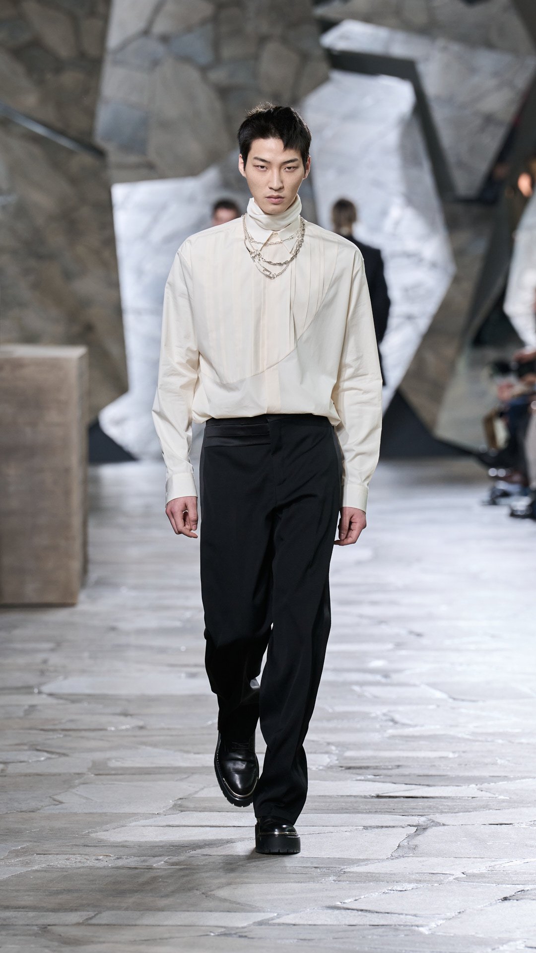 エルメスのアイコンを効果的に取り入れたルックも印象的だ。スーツの襟元にフリンジスカーフを巻いたり、ウールのプルオーバーをシルクツイルでフレーミングするなど、スカーフのアクセントが効いている。また、「シェーヌダンクル」のネックレスやブレスレットも、シャープかつ官能的な輝きを放っていた。