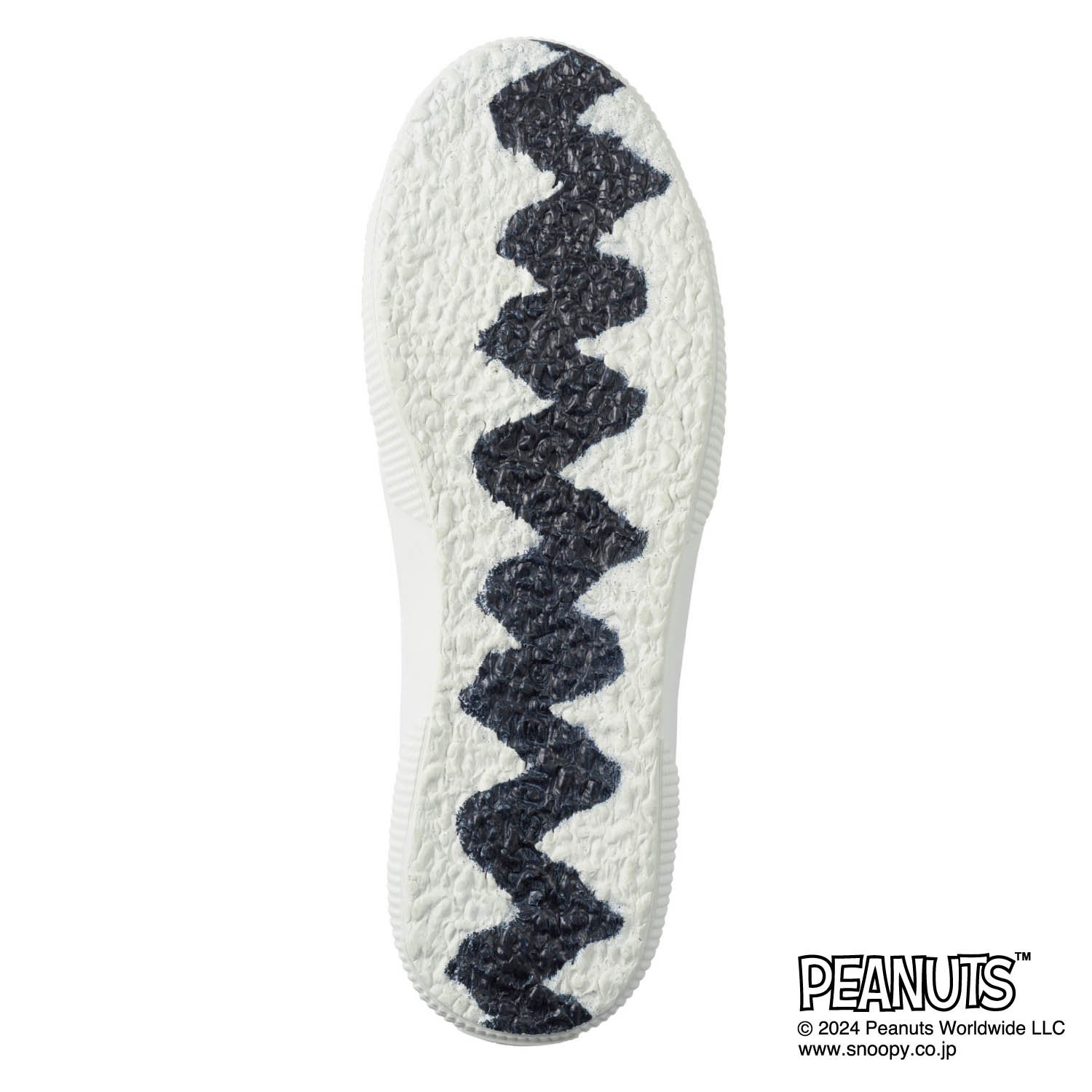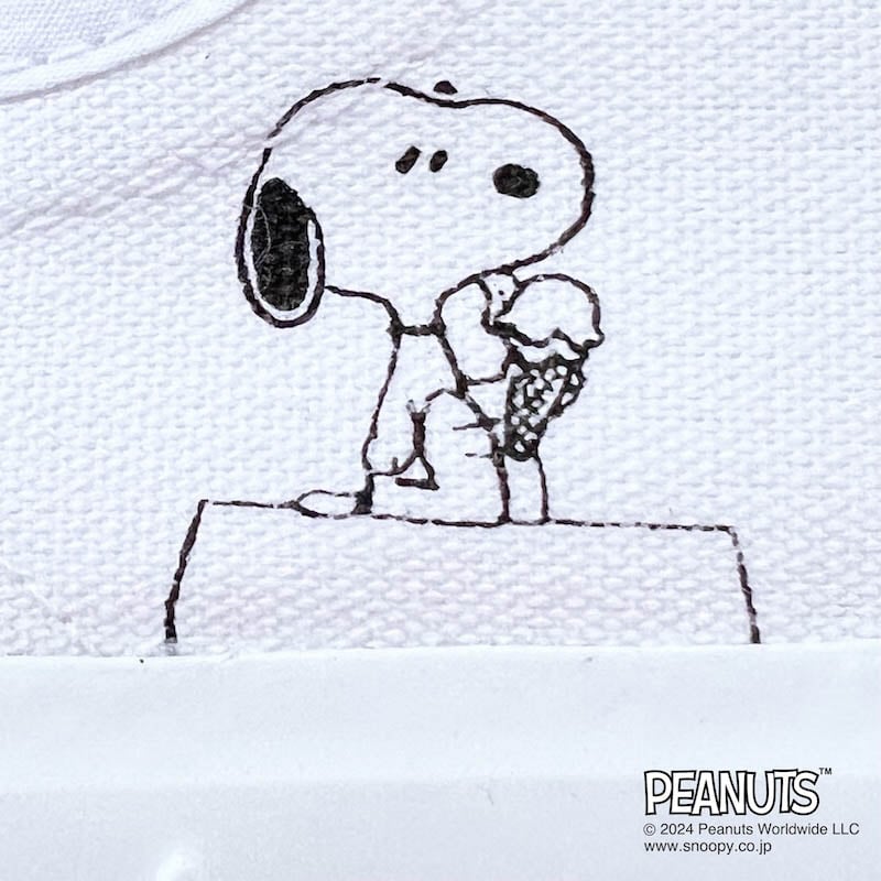コラボでは、ホワイトのボディに「食べる」をキーワードにしたスヌーピーのプリントとオリジナルチャームをあしらったヴァルカナイズスニーカー2型を用意。