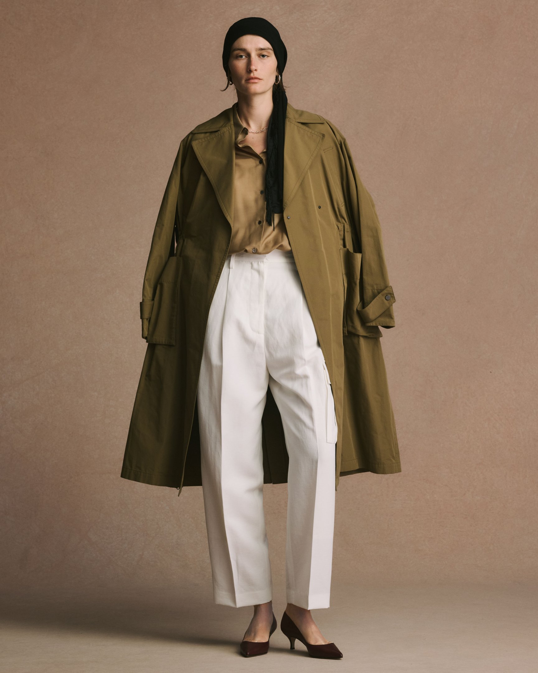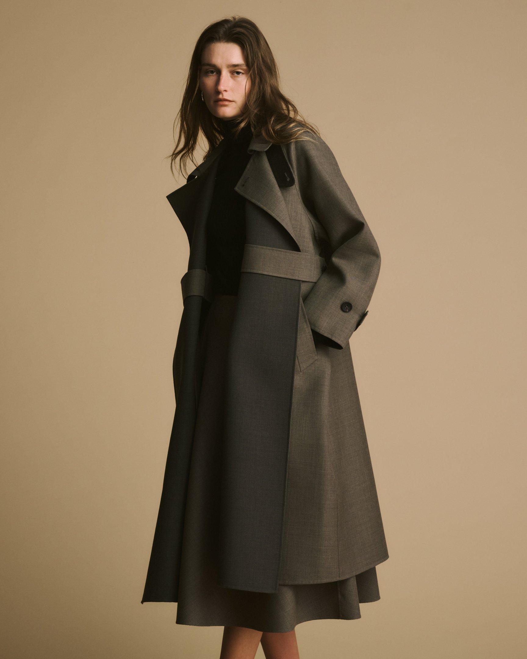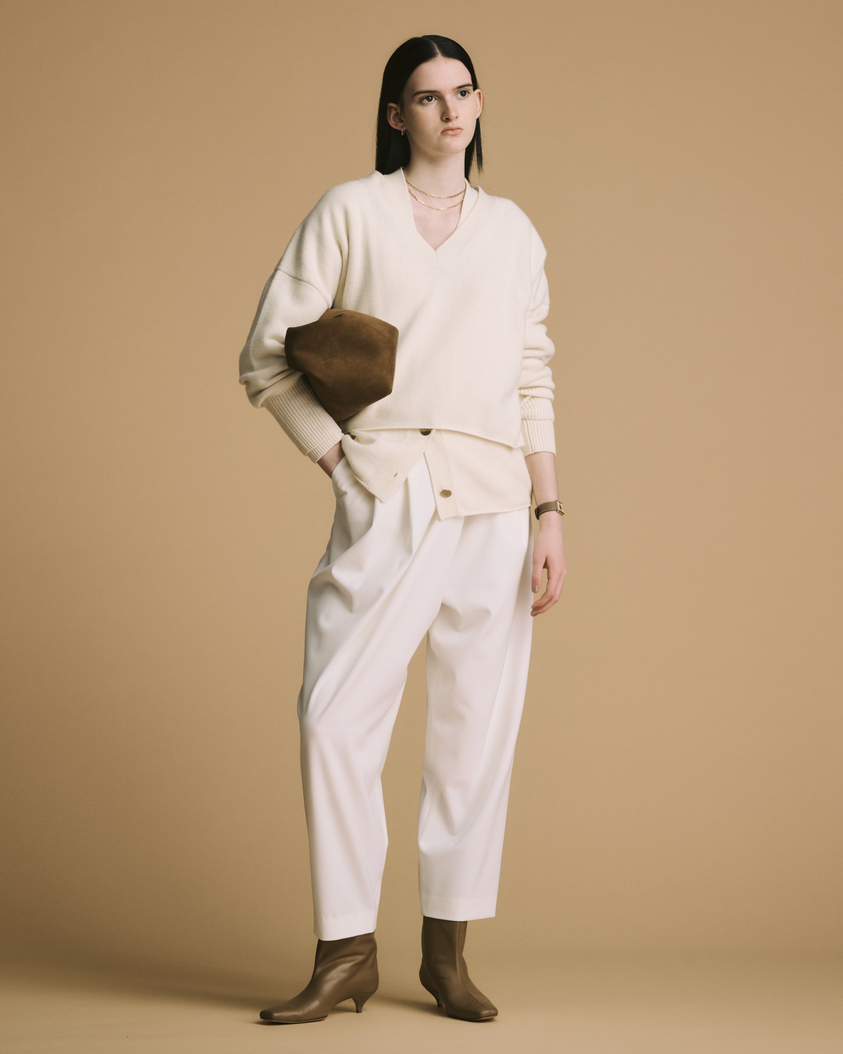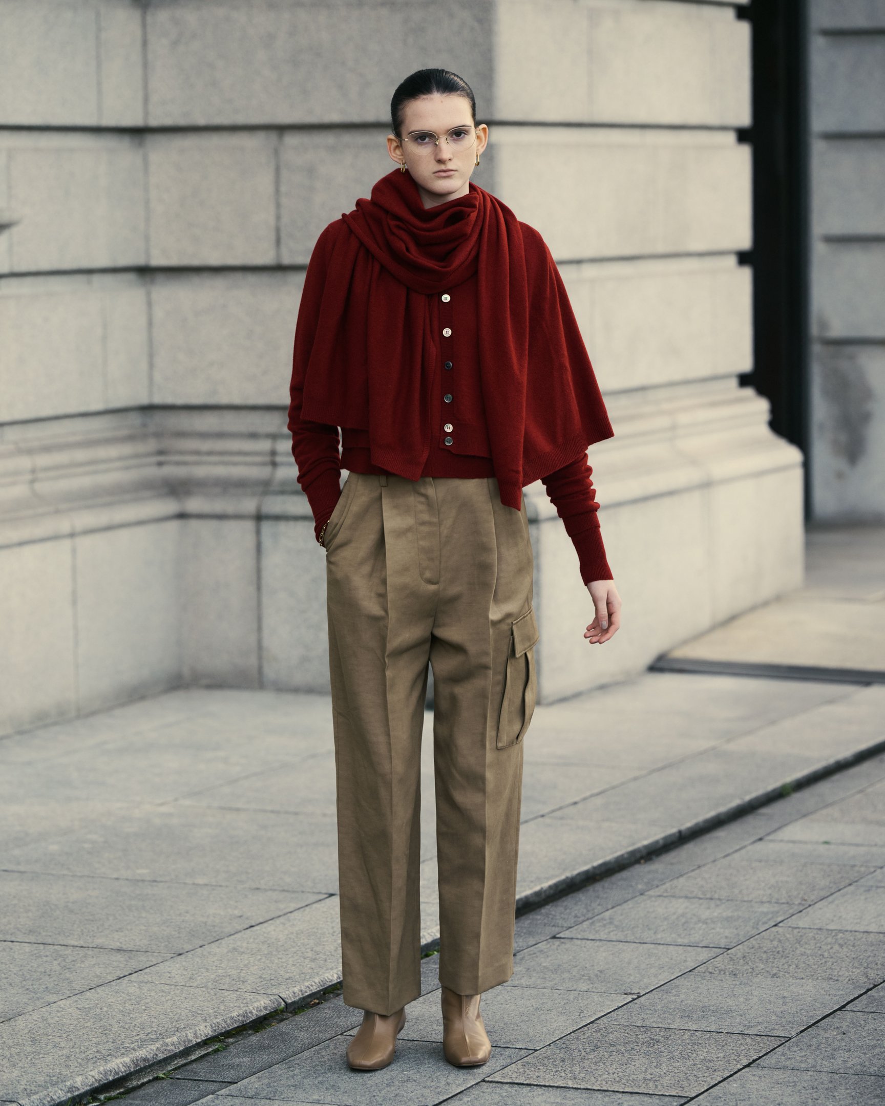 ファーストコレクションでは、アウターからシャツ、ニット、パンツ、スカート、ワンピース、ジュエリーまで、ブランドの女性像を体現する計70型のアイテムをラインナップ。代表的なアイテムとして、群馬県桐生市の工場で織ったオリジナル生地を用いたジャカードのベスト(3万5200)とパンツ(3万9600)のセットアップや、軽い着心地と素材のハリ感、異なるトーンの絶妙なカラーコンビネーションにこだわったダブルフェイスのロングコート(7万9200)、色味からいち早く秋冬のムードを楽しめる、程よいシアー感のシルクコットンシャツ(1万9800)、大人の女性が美しく着られるシルエットや素材感を追求したカーゴパンツ(3万5200/全て税込)などを揃える。